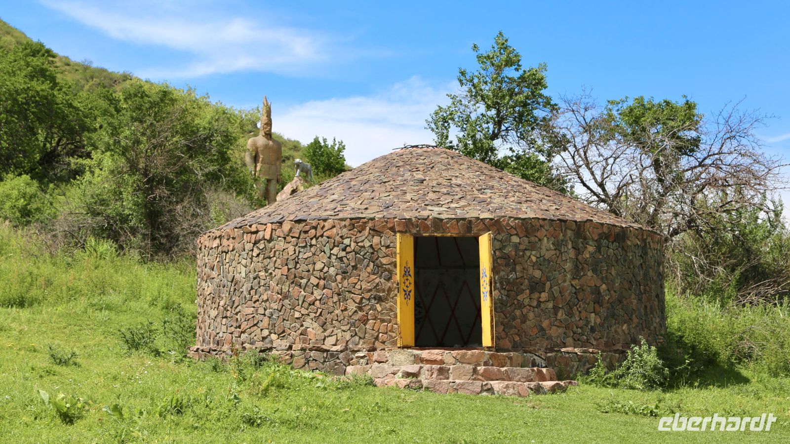 Auf der Rückfahrt wird am Talausgang das Denkmal für den Goldenen Mann und eine Jurtennachbildung aus Stein besichtigt. Lena erzählt von den Ur-Einwohnern, denen die Stätte gewidmet ist. Dann geht es mit kurzem Sanitär und Tankstop zurück ins Hotel. Bis zum Abendessen bleibt noch ein wenig Zeit für Individuelles. Wir speisen im Hotelrestaurant.