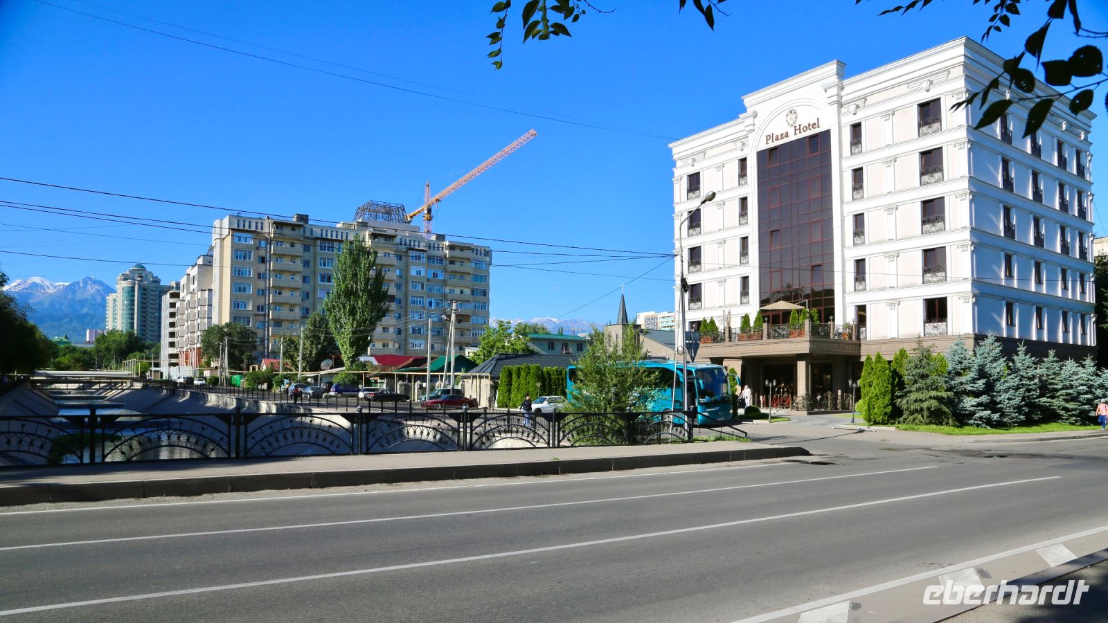 Wenig später sind wir, zwar nass, aber recht zufrieden wieder im Bus. Der andere Teil der Gruppe hatte inzwischen Freundschaft mit den Sicherheitsorganen geschlossen und in der örtlichen Polizeistation das Gespräch und Schutz vor dem Regen gefunden. Ein wenig durchnässt fahren wir zum Abendessen. Es ist jedoch warm und die Sachen trocknen schnell. Im lokalen Restaurant erwartet uns eine schmackhafte, einheimische Küche und freundlicher Service. Danach geht es per Bus ins Plaza, unser Hotel am Flüsschen Esentai, zur ersten Nächtigung in der einstigen kasachischen Hauptstadt.