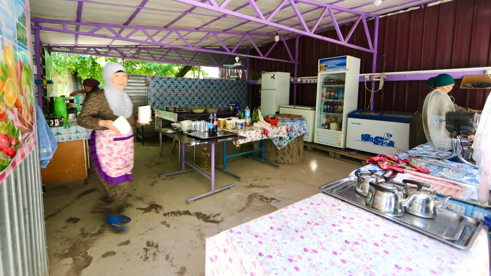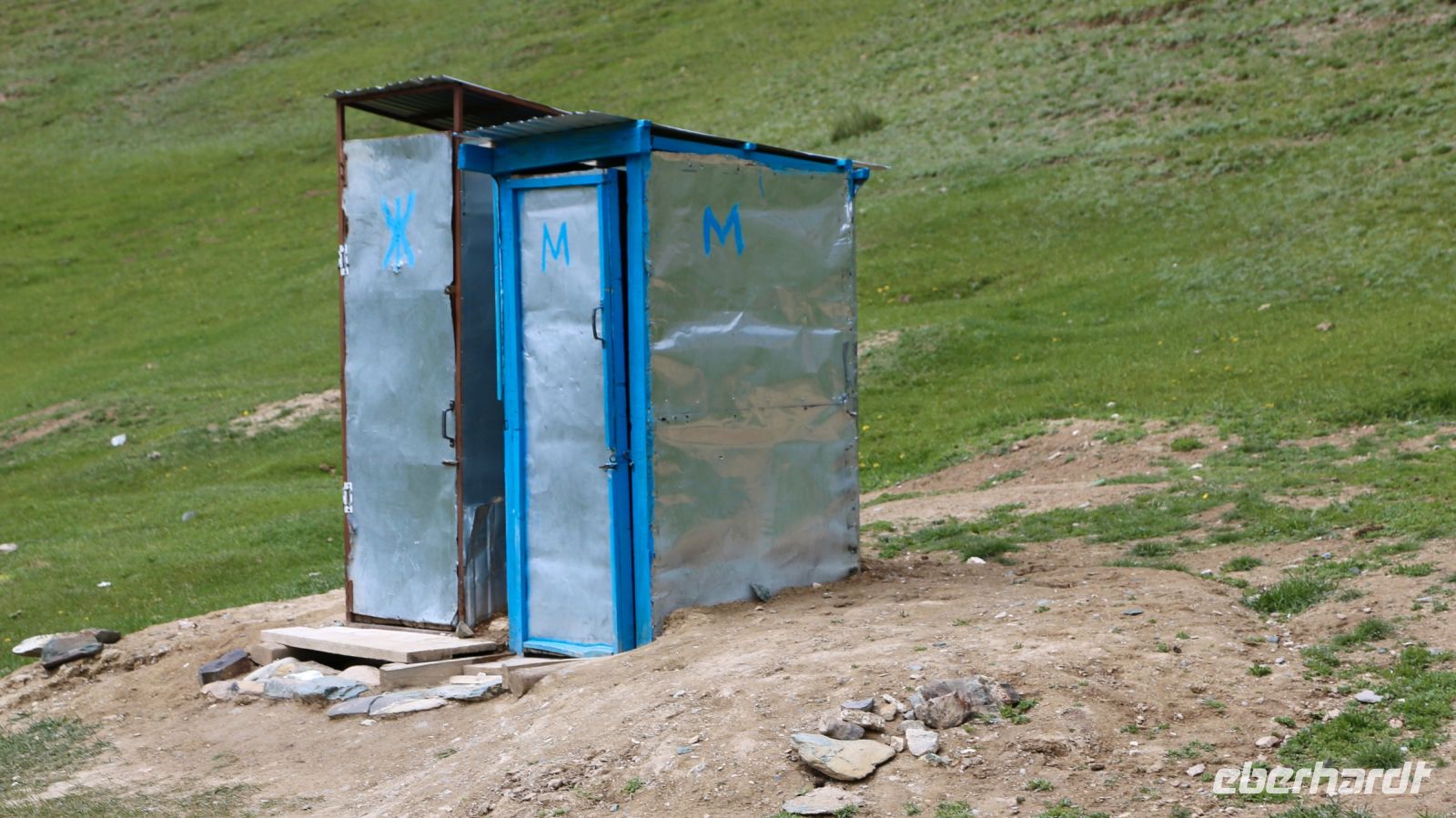 An einer Art Freiluftrestaurant machen wir Halt. Mittagspause. Die Wirtschaft wird von einer Dunganen Familie betrieben. Es gibt schmackhaften Tee und selbstgemachte Limonade und für die Hungrigen Laghman, Manty und anderes mehr. Erste Bekanntschaft schließen wir mit den Bio-Toiletten im kirgisischen Stil. "Anders wird es diesbezüglich unterwegs jetzt nirgendwo mehr“, verkündet Lena, stellenweise werden dann selbst diese „Einrichtungen“ fehlen.