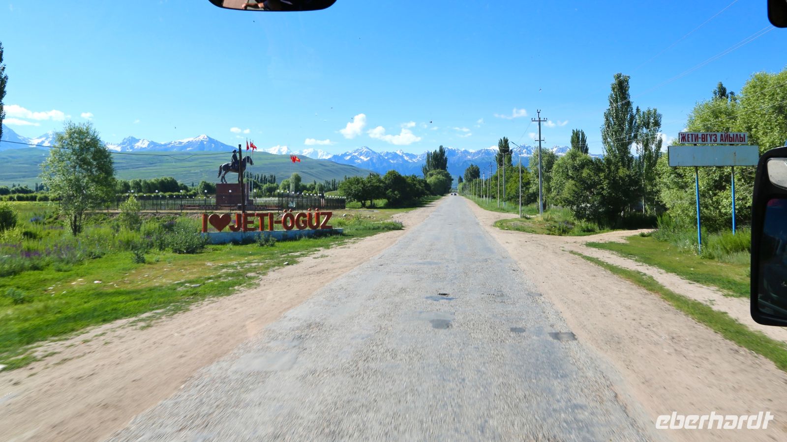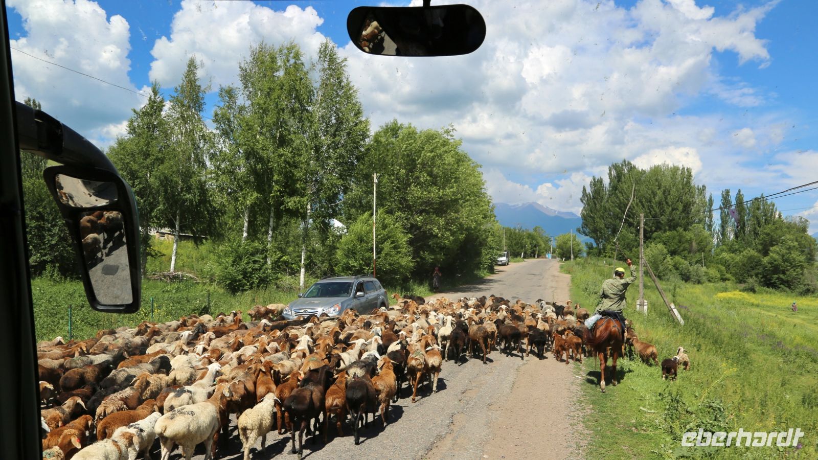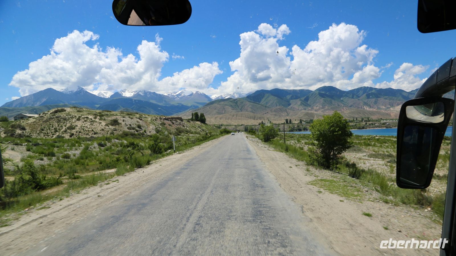 Früh ist heute Aufbruch. Der Weg nach Kirgisistan ist weit.Die ursprünglich vorgesehene, ein wenig kürzere Route ist Corona zum Opfer gefallen. Die Fahrt führt durch die Stadt auf die Landstraße und anschließend über zum Teil noch im Bau befindliche Autobahnen. Der Blick aus dem Fenster fällt auf eine sich ständig verändernde Landschaft. Steppe, Hochsteppe, Gebirgsformationen – beständig wechseln Farben und Bewuchs. Nur einen kurzen Pflichthalt gibt es. Dann schließlich erreichen wir den Korday-Pass. Auf 1200 m windet sich die Straße durch ein saftig grünes Bergland. Als der Pass hinter uns liegt und die offene Landschaft den Blick in die Ferne freigibt, grüßen die ersten 7000-er mit ihren weißen Spitzen. "Das sind unsere“ entfährt es Lena, irgendwie scheint sie froh, der Heimat näher zu kommen.