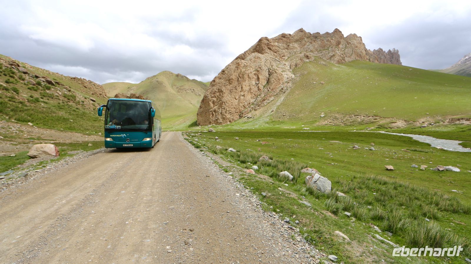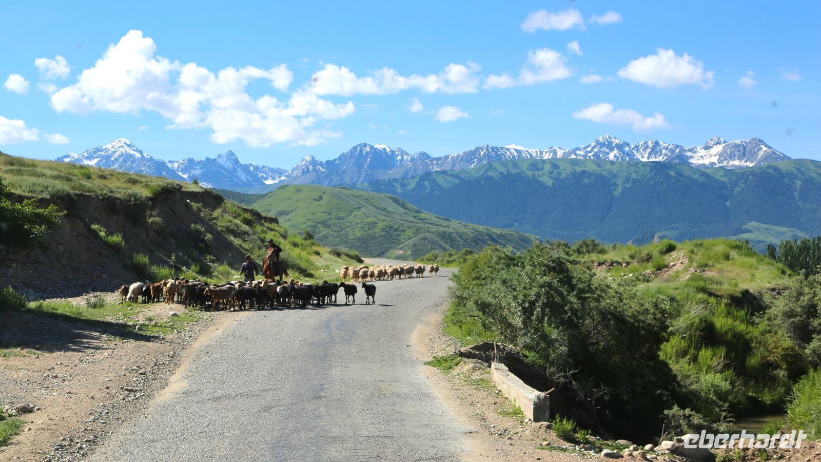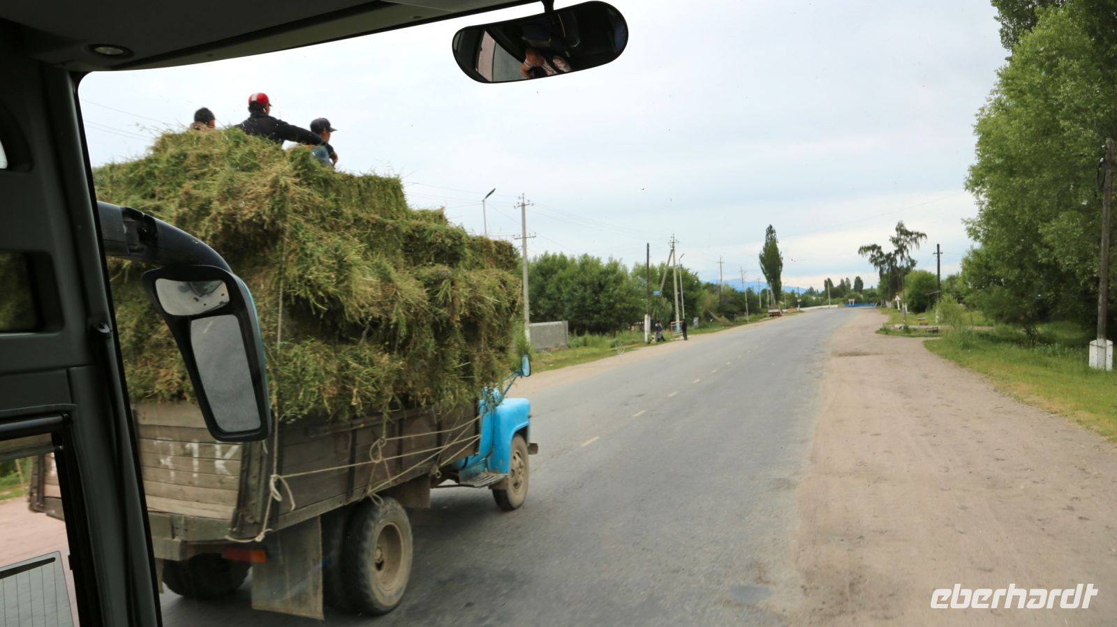 Früh ist heute Aufbruch. Der Weg nach Kirgisistan ist weit.Die ursprünglich vorgesehene, ein wenig kürzere Route ist Corona zum Opfer gefallen. Die Fahrt führt durch die Stadt auf die Landstraße und anschließend über zum Teil noch im Bau befindliche Autobahnen. Der Blick aus dem Fenster fällt auf eine sich ständig verändernde Landschaft. Steppe, Hochsteppe, Gebirgsformationen – beständig wechseln Farben und Bewuchs. Nur einen kurzen Pflichthalt gibt es. Dann schließlich erreichen wir den Korday-Pass. Auf 1200 m windet sich die Straße durch ein saftig grünes Bergland. Als der Pass hinter uns liegt und die offene Landschaft den Blick in die Ferne freigibt, grüßen die ersten 7000-er mit ihren weißen Spitzen. "Das sind unsere“ entfährt es Lena, irgendwie scheint sie froh, der Heimat näher zu kommen.