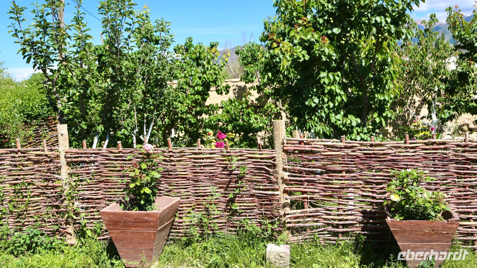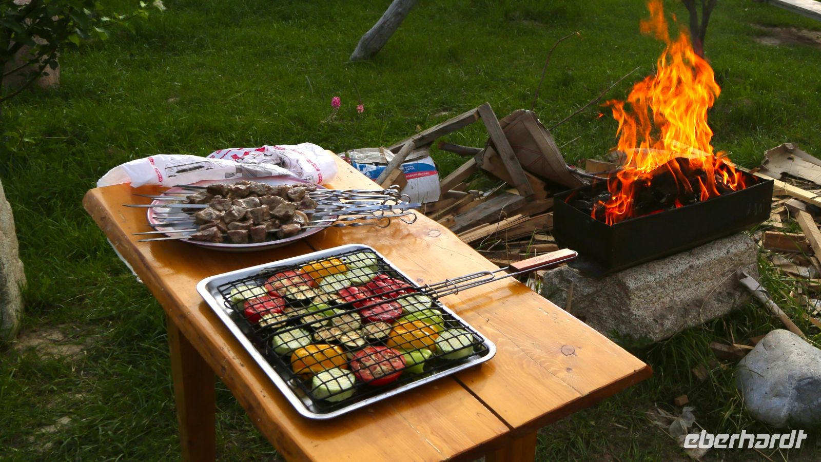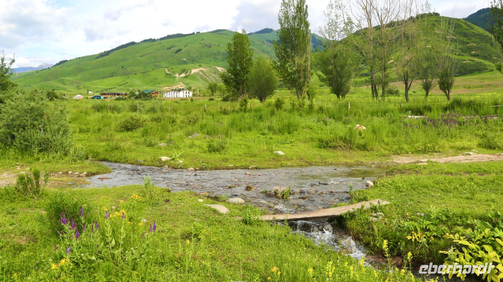 Das Gästehaus Kemin, eine Art Lodge am Rande des Tales, unser Tagesziel und Übernachtungsort, besteht aus mehreren Gebäuden. Alles ist sehr sauber, wenngleich auch bescheiden, einfach ausgestattet. Die Atmosphäre im Tal entschädigt dafür. Ein paar Stunden bleiben bis zum Abendessen für eigene Erkundungen der Gegend. So mancher erkundet von der Terrasse in der zweiten Etage bei einem kühlen Bier. Das Abendessen gibt es im Garten der Anlage, schmackhafte Suppe, Salat und Schaschlyk vom Grill. Gekühltes Bier gab's aus dem Bach, hochprozentiges von „Eberhardt Travel“, Gespräche, Gesang und einen geselligen Abend von allen.