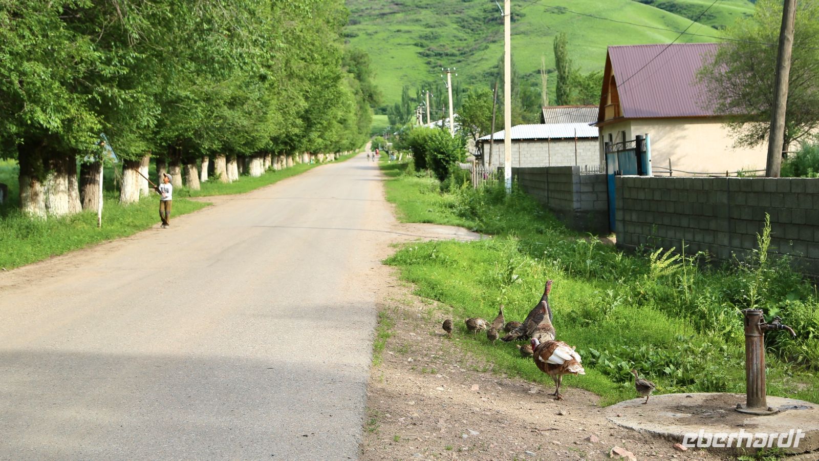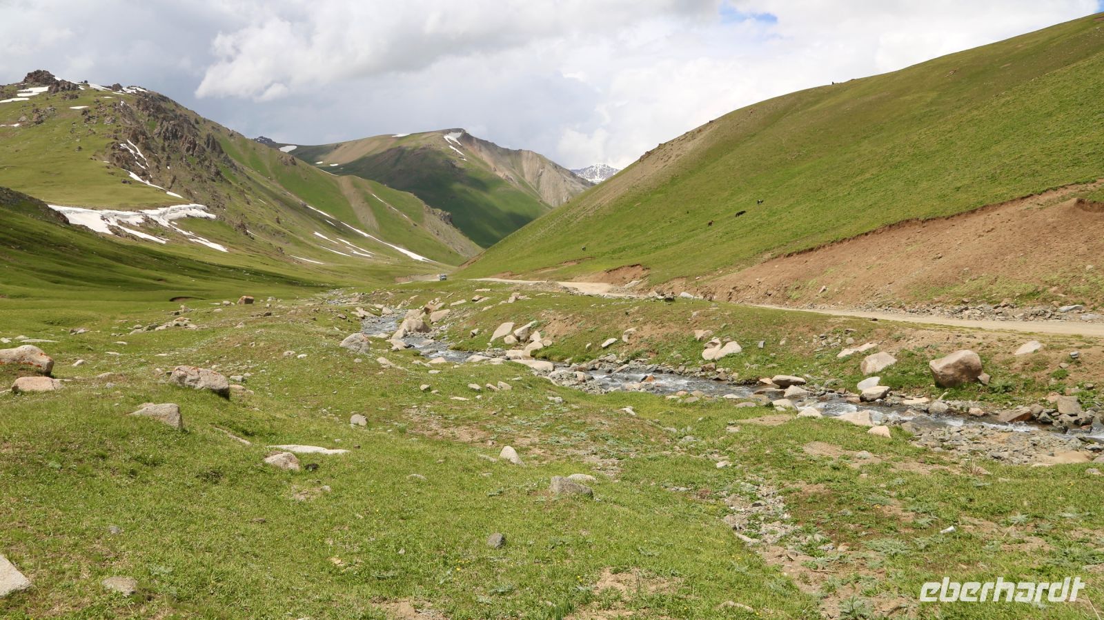 Wir fahren weiter in den Nationalpark Tschon-Kemin. Eine sehr schöne Landschaft erwartet uns – teils Schnee bedeckte Gipfel, ein breites, saftig bewachsenes Tal, zahlreiche Viehhirten, kleine, ärmliche Siedlungen.
