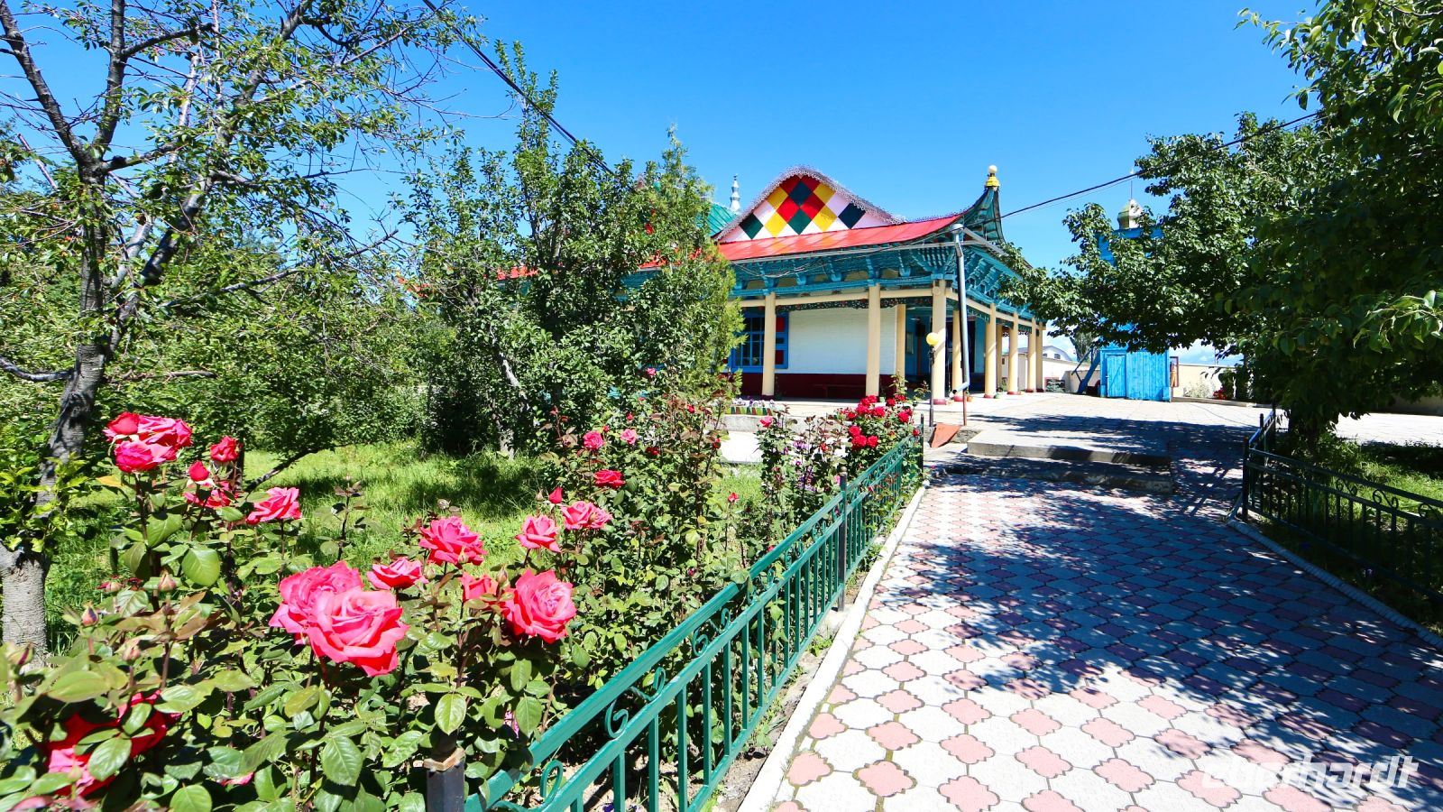 Vor der Tür zu unserer Gastlichkeit gibt es die für die Nomadensiedlung charakteristische sibirische Waschanstalt, weniger charakteristisch, etwas entfernt doch sehr willkommen, hier ein WC. In der Gaststube warten Tee, sogar Kaffee, Gebackenes, frische und getrocknete Früchte, Süßigkeiten, Warenje und natürlich unsere Vorräte. Am frühen Nachmittag brechen wir zur Rückfahrt auf. Bevor es ins Hotel geht fahren wir noch kurz durch das Zentrum von Naryn und besichtigen von außen die örtliche Moschee. Bis zum Abendessen im Hotelrestaurant bleiben dann noch Zeit und Möglichkeiten für eigene Entdeckungen in Naryn.