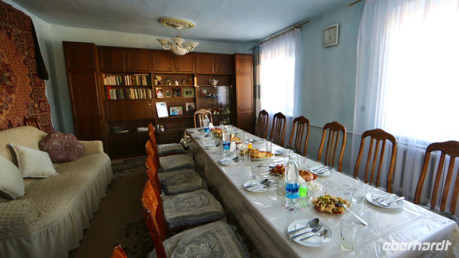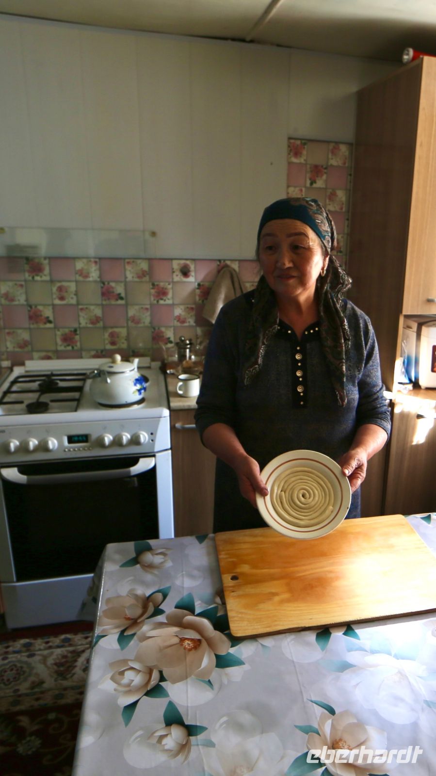 Zum Abendessen werden wir heute bei einer uigurischen Familie erwartet. Laghman steht auf dem Speiseplan, von dem wir zunächst erfahren sollen, wie er (sie, es) entsteht. Getränke, so man sich nicht mit Tee begnügen möchte, werden auf dem Weg dorthin erworben. Olja, eine ältere Uigurin, empfängt uns freundlich im Hof ihres Hauses. Sie hat uns erwartet und bereits verschiedenes vorbereitet. Behende formt sie aus einem Teig eine Art Nudeln. Wer möchte, darf sich versuchen, es ihr gleich zu tun. Es gelingt nicht schlecht. Dann werden wir ins Wohnzimmer gebeten, wo uns der bereits gedeckte Tisch erwartet. Wir werden bestens umsorgt und es mundet allen. Oljas Mann, der später hinzukommt, war, wie es sich erweist, vor Jahren in Deutschland. Schnell finden sich Gesprächspartner und Themen. Ein inhaltsreicher Tag, ein gastfreundlicher Abend, nach welchen wir noch einmal in Karakol übernachten.