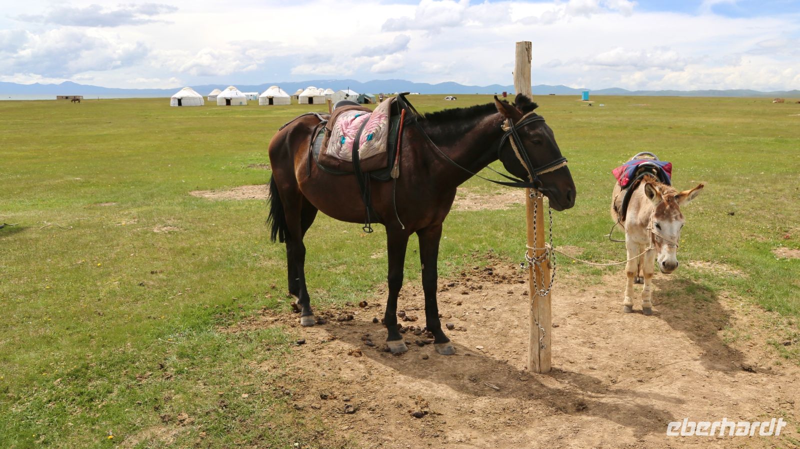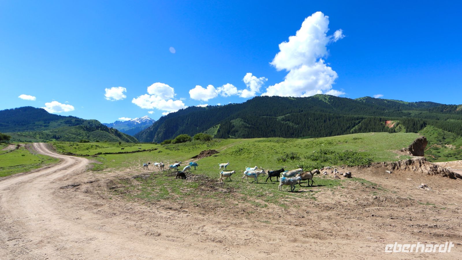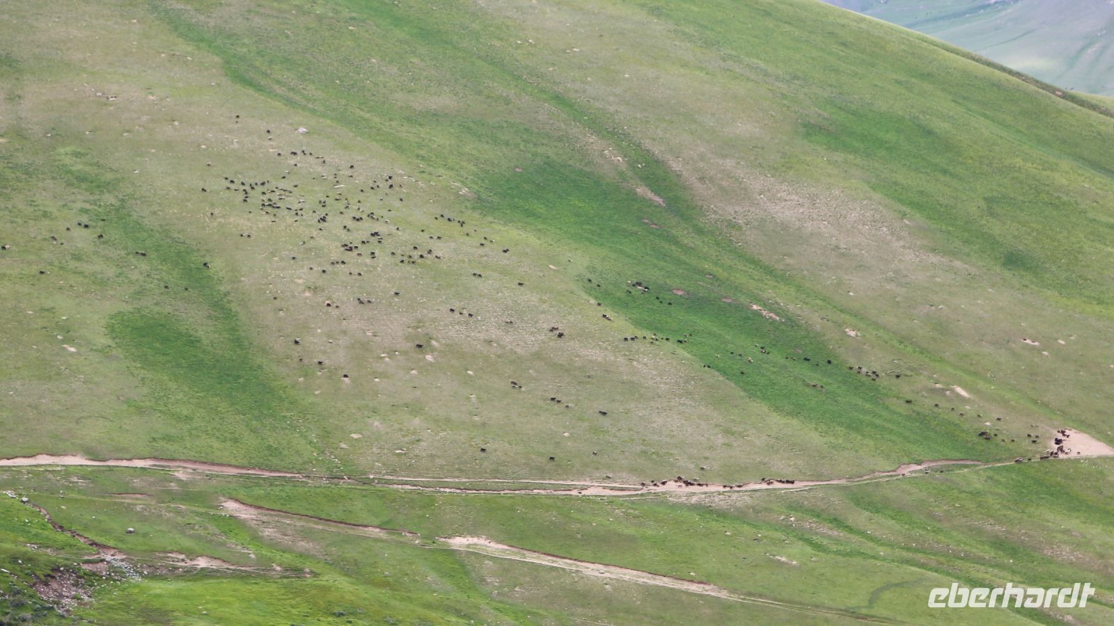 Die Gebirgspisten sind ausgefahren, es geht bedächtig voran. Reichlich Bodenwellen erschweren die Fahrt. Zuweilen regnet es ein wenig. Aber die Landschaft ist großartig. Wir machen zahlreiche Fotostops, treffen viele Hirten mit Pferden, Schafen und Yaks.