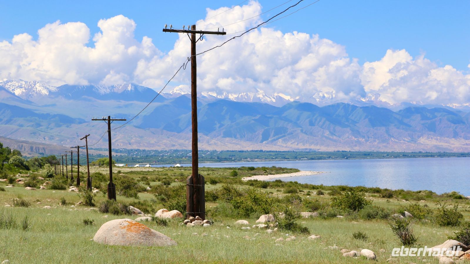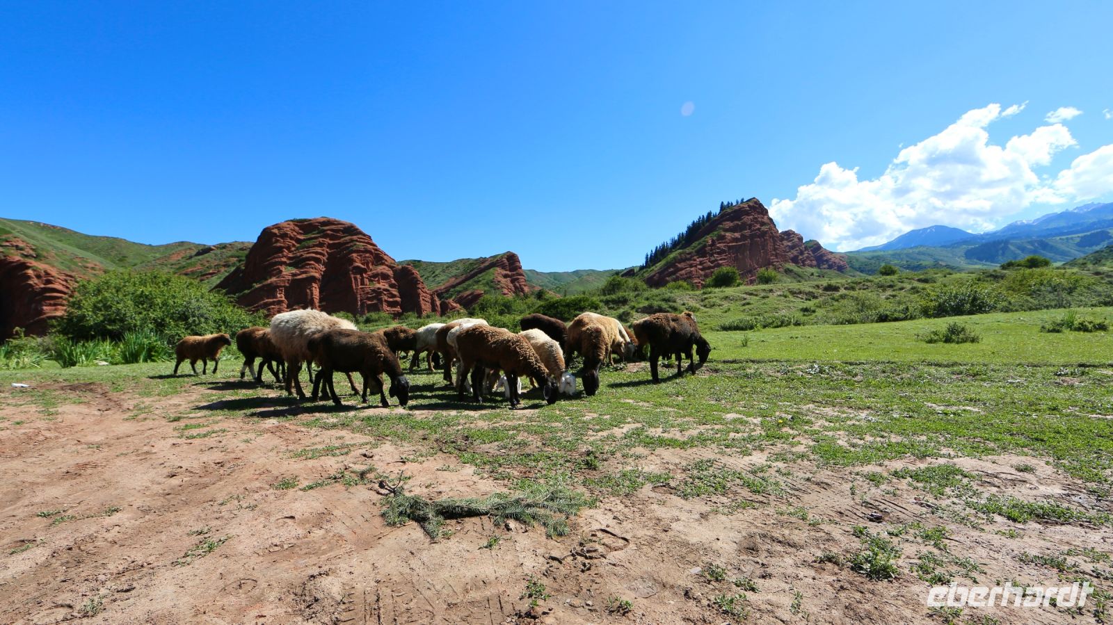 Auf dem Weg ins Jety-Oguz-Tal, in welches wir nach dem Frühstück aufbrechen, versorgen wir uns zunächst in einem Supermarkt mit Proviant. Das Tal erreichen wir schon wenig später. Die Fotoapparate haben Schwerstarbeit zu leisten. Die Sieben Stiere, das Gebrochene Herz, Schafherden, Jurten, Edelweiß Wiesen – das faszinierende Tal inmitten der grandiosen Gebirgslandschaft fordert seinen Tribut. Ein Spaziergang führt auf eine benachbarte Anhöhe – beeindruckende Sichten und eine ebensolche Pflanzenwelt. Später setzen wir unsere Fahrt fort. Die Straße führt entlang des Südufers des Issyk-Kul. Sie ist teilweise im Bau. Zur Kür, Sanitärpause- und Fotopause, halten wir in freiem Gelände am Seeufer.