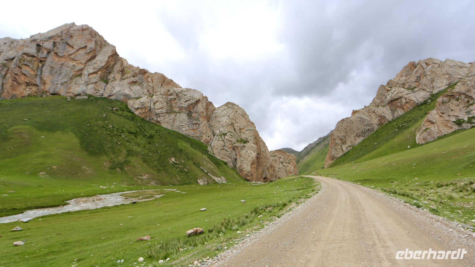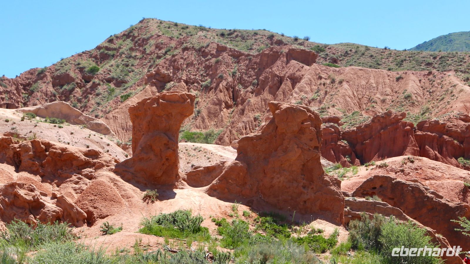 Traditionelle Reiterspiele stehen heute zunächst auf dem Programm. Die dafür vorgesehene Wiese ist kaum einige Minuten Fahrt entfernt. Bei unserer Ankunft am „Reitfeld“ ist der Regen so stark, dass wir uns entschließen im Bus zu bleiben. Ein Ausstieg scheint unmöglich. Wir vereinbaren, die Vorführung auf die Rückfahrt zu verlegen und fahren dann weiter. Alsbald hört der Regen auf. Der Weg führt durch eine imposante Landschaft – beständig wechseln Berg, Schluchten, Steppe und wüstenartige Abschnitte einander ab. Schließlich gelangen wir an die Ufer des Issyk-Kul. Nach Sanitärhalt und Supermarkt erreichen wir am frühen Nachmittag die Grigorjew-Schlucht. Der hier beständig von Fahrzeugen aufgewirbelte Staub auf dem Weg durch das Tal bremst alsbald unseren Wanderdrang und wir beschließen nach kurzem Aufstieg lieber am Fluss zu bleiben. Bei Tee und Supermarkt-Proviant ist Mittagsrast, bevor wir nach Karakol weiterfahren.