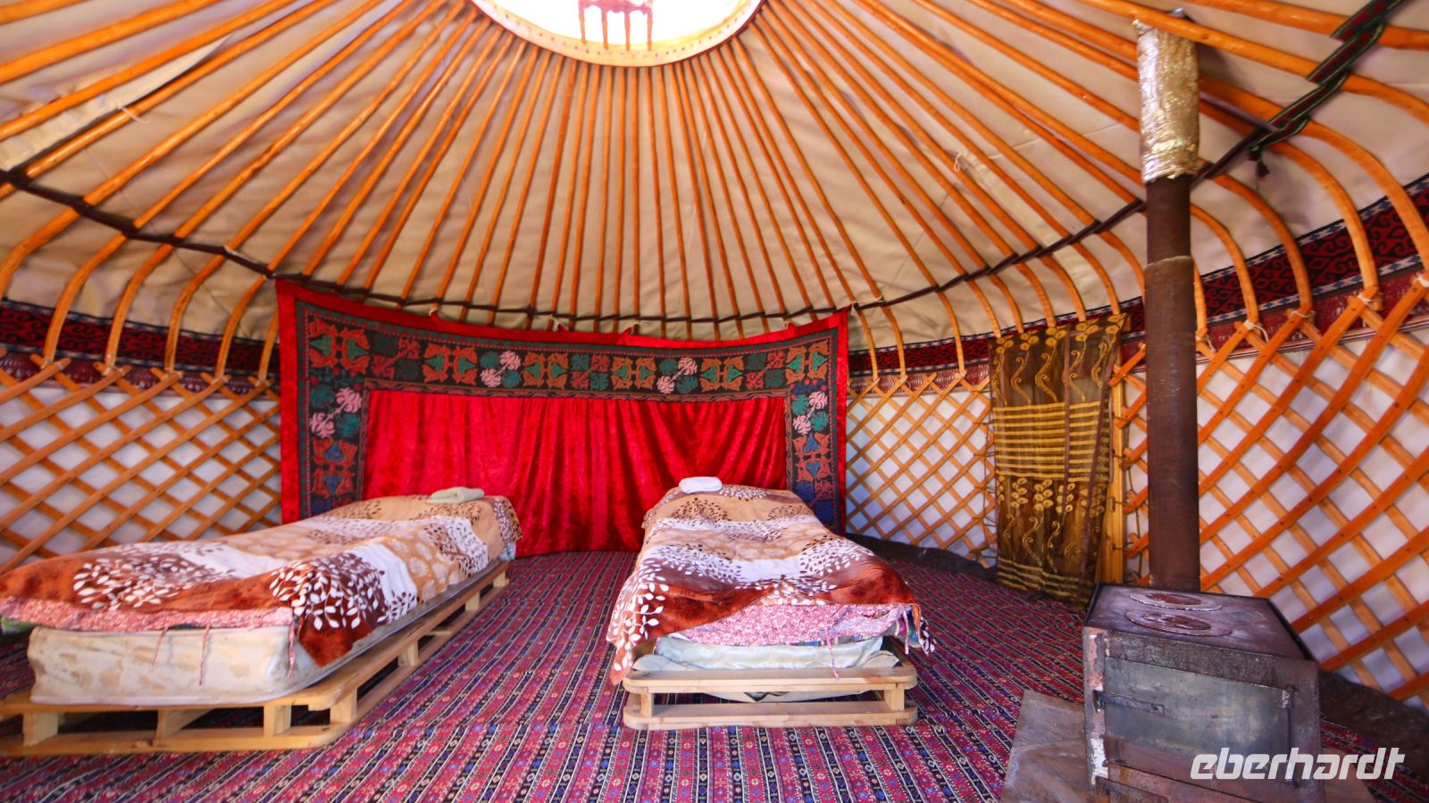 Aufmerksamkeit erhalten auch hier zunächst wieder die kirgisischen „Biotoiletten“. Lena reserviert zwischenzeitlich unsere Teestunde und organisiert die Eintrittskarten für die Karawanserei. Die Bewohner der umliegenden Jurten eröffnen im Angesicht der touristischen Ankömmlinge flugs einen Souvenirstand am Parkplatz. Es wird reichlich vom Angebot Gebrauch gemacht. Dann geht es in die Karawanserei. Lenas Führung ist interessant wie kurzweilig. Erneut gibt es viel vom Leben der Einheimischen aus längst vergangenen Zeiten zu erfahren.