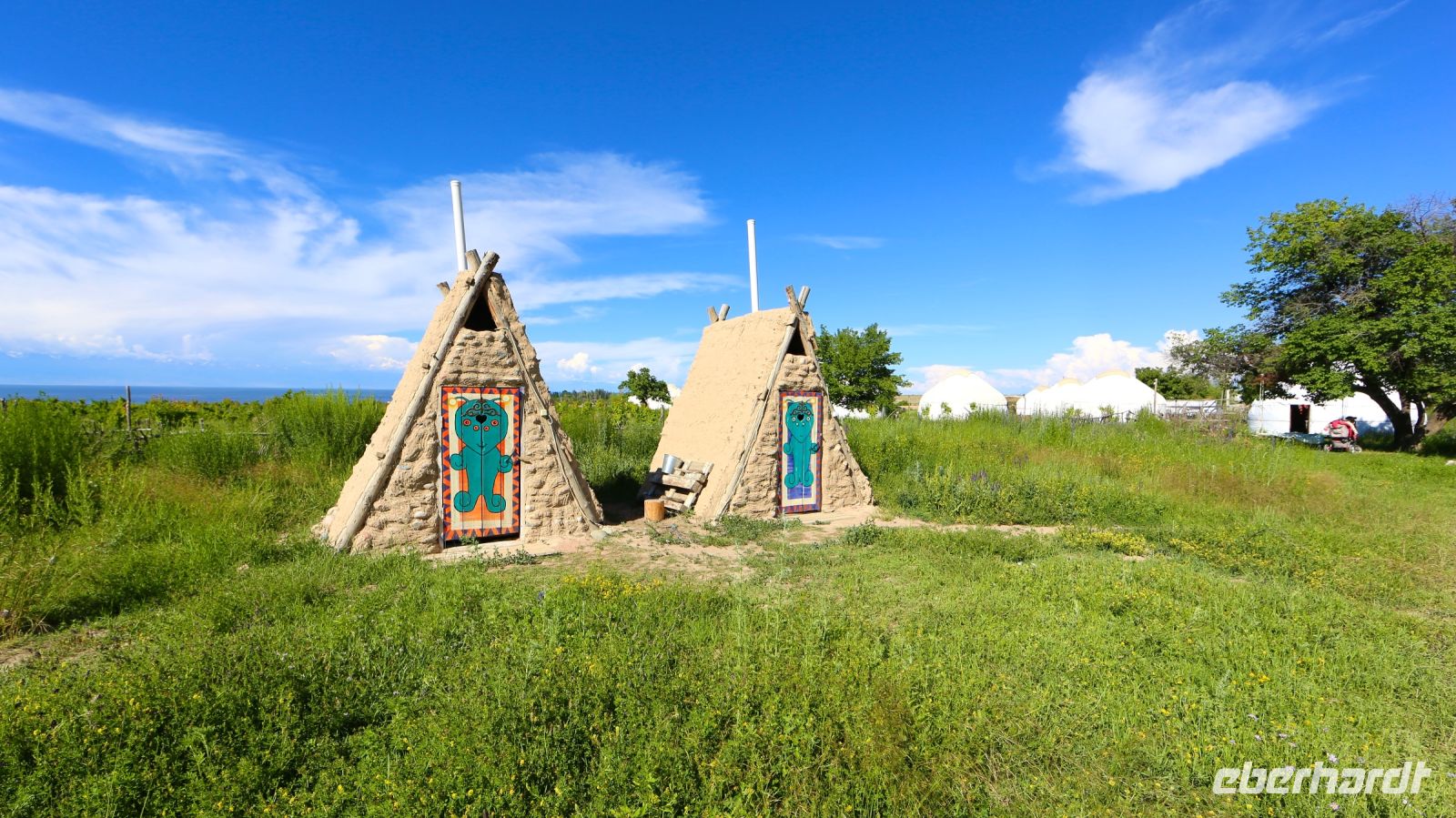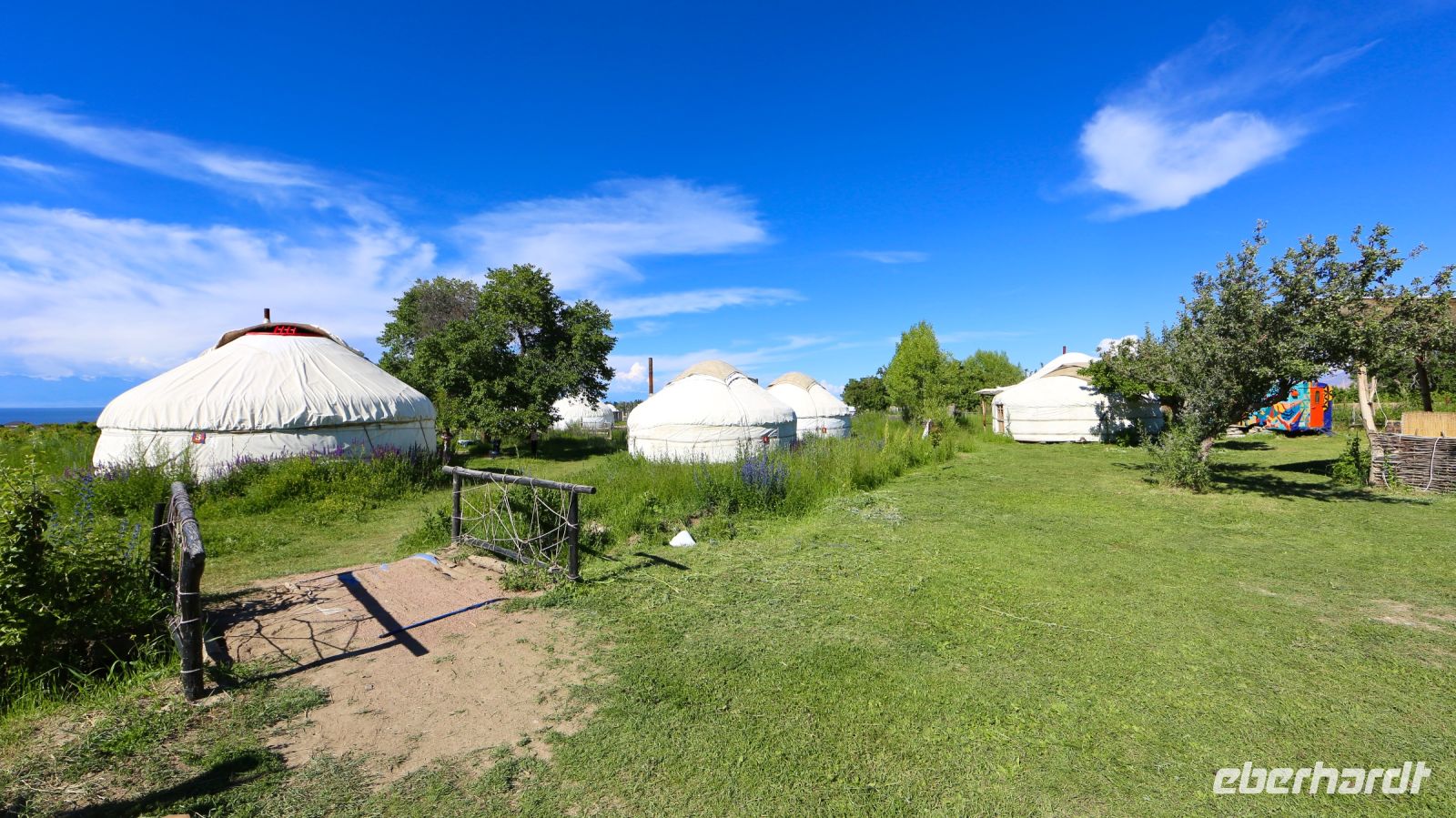Nur eine kurze Fahrt trennt uns später vom Jurtendorf. Unserem tollkühner Fahrer fordert sie sein ganzes Können ab, denn die Zufahrt ist für Busse im Travego-Format nicht sonderlich geeignet. Am späteren Nachmittag beziehen wir die Jurten unweit des Seeufers. Sie sind nicht ungemütlich, jedoch einfach und übersichtlich. Der Komfort ist auf die Romantik beschränkt, Duschhäuschen und kirgisische „Bio-Toiletten" auf dem Dorfgelände stellen die sanitären Einrichtungen.