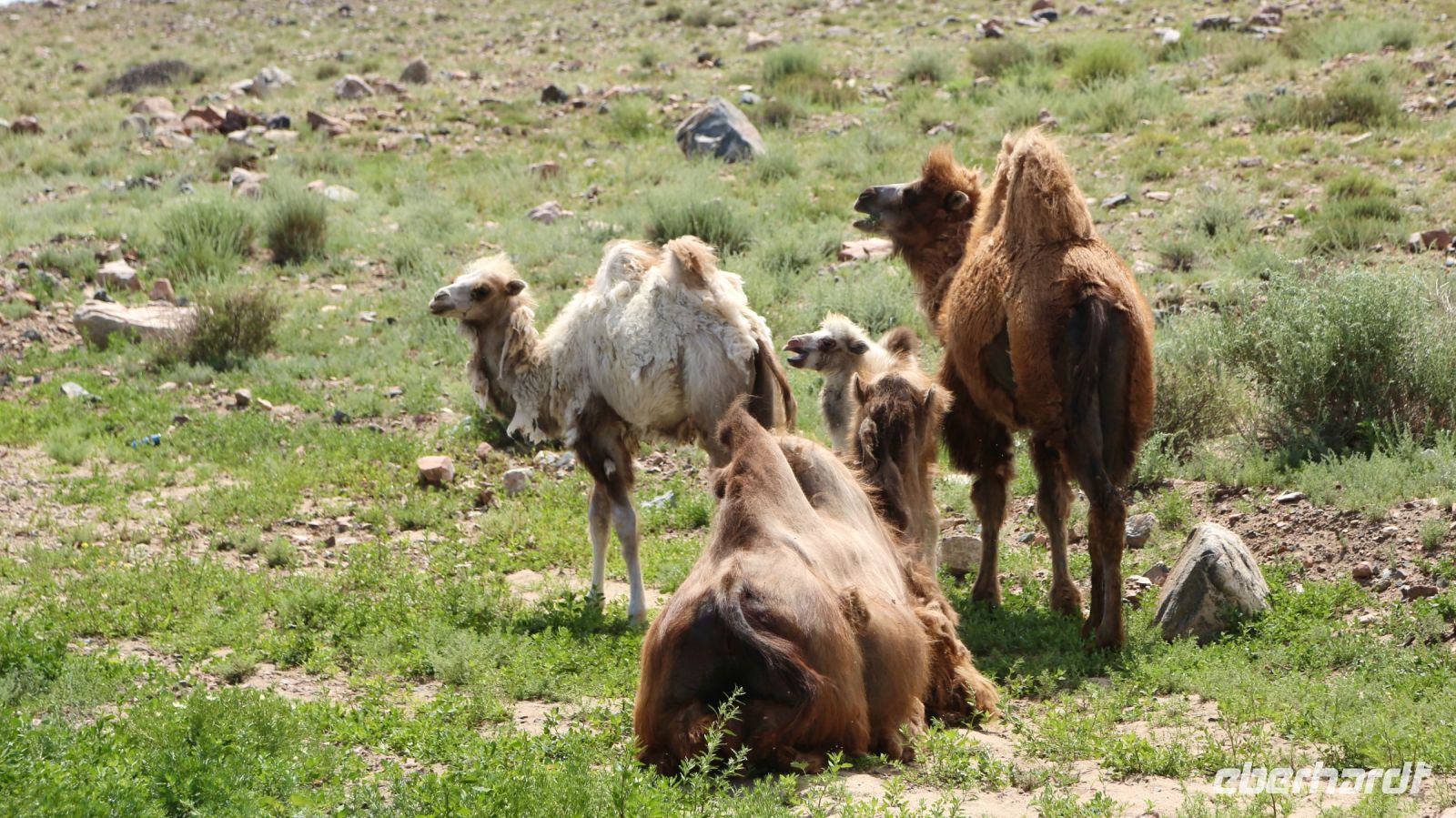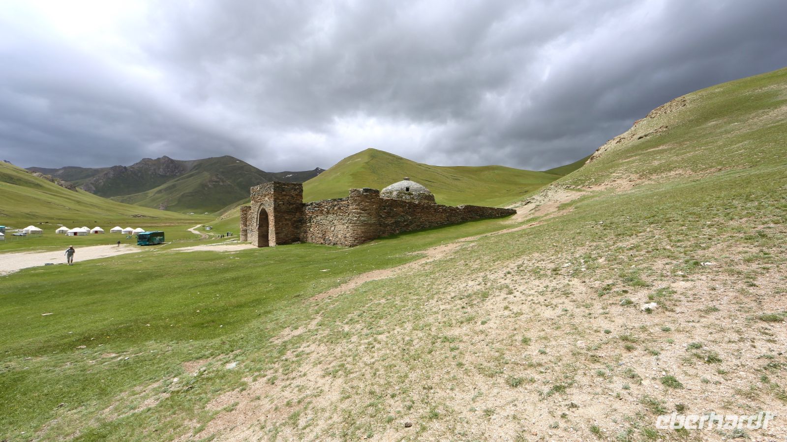 Ein gutes Stück Fahrt weiter biegen wir von der befestigten Straße auf eine Schotterpiste ein. Nun geht es wieder gemächlich vorwärts. Zahllose Murmeltiere, die auch am Vortag bereits wahrnehmbar waren, kreuzen und säumen den Weg. Ihr Ruf ist beim nächsten Fotostopp deutlich vernehmbar, ihre Anzahl schier unglaublich. Die Bergwelt beeindruckt. Bald passieren wir ein großes „Felsentor“. Es gibt den Weg frei ins Kara-Kojun. Jurten der Nomaden und wohl auch solche, die als Camps genutzt werden, begleiten die Fahrt. Dann erreichen wir die Karawanserei.