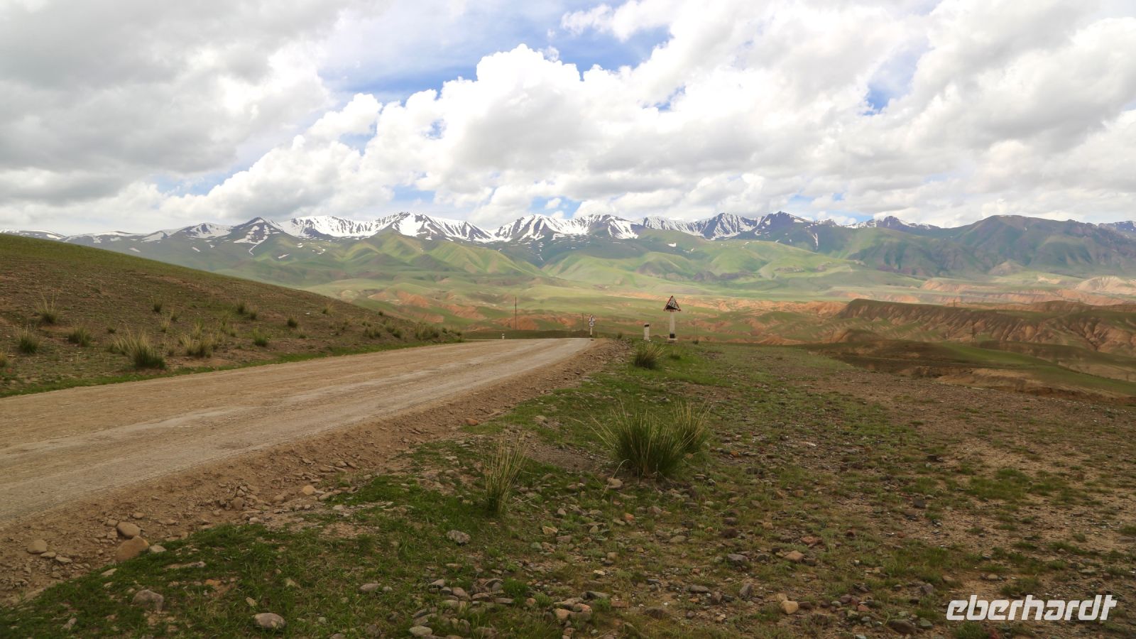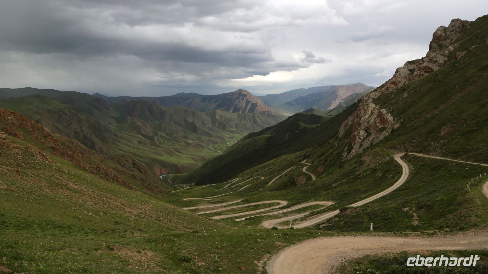 Schließlich geht es weiter auf der Hochebene über die ausgefahrenen und ausgespülten Pisten. So manche „Umleitung“ führt ins Steppeninnere, um weggeschwämmte Pistenstücke zu umfahren. Die Aussicht auf Steppe und die Gebirgszüge bleibt unverändert grandios. In der Ferne grollen Gewitter. Tiefschwarz hängen die Wolken über den Bergen und hinterlassen bei ihrem Abzug frisch geweißte, schneebedeckte Gipfel. An einer „Kreuzung“ stoppt unser Bus, der Fahrer übergibt einem dort Wartenden irgendwelche Utensilien, die regionale Post, wie wir später erfahren. Bald darauf erreichen wir erneut einen Pass und steigen zum heute letzten Fotostop aus. Gelegenheit, den Weg festzuhalten, welchen wir in Kürze bergab fahren wollen. In schier endlosen Serpentinen windet sich die Piste am Hang entlang. 33 Kehren, welche uns in der Übersetzung als Papageien benannt werden, erwarten uns, insbesondere jedoch den Fahrer. Am Ende der Schlaufenfahrt gibt es spontan Applaus. Lena verkündet, dass wir nun im Prinzip an unserem Bus wären. Optimistisch gestimmt fahren wir noch geraume Zeit durch die Gebirgslandschaft und erklimmen ein weiteres Mal Höhen von über 3000 Metern.