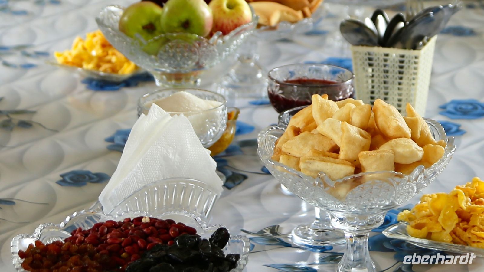 Kühl ist es an diesem Morgen, es regnet ein wenig. Frühstück gibt es auf der Terrasse des Gästehaus-Restaurants an einer Tafel. Käse, Butter und Wurst sind anfänglich knapp, treffen dann jedoch reichlich bei Tisch ein. Hungrig bleibt keiner.