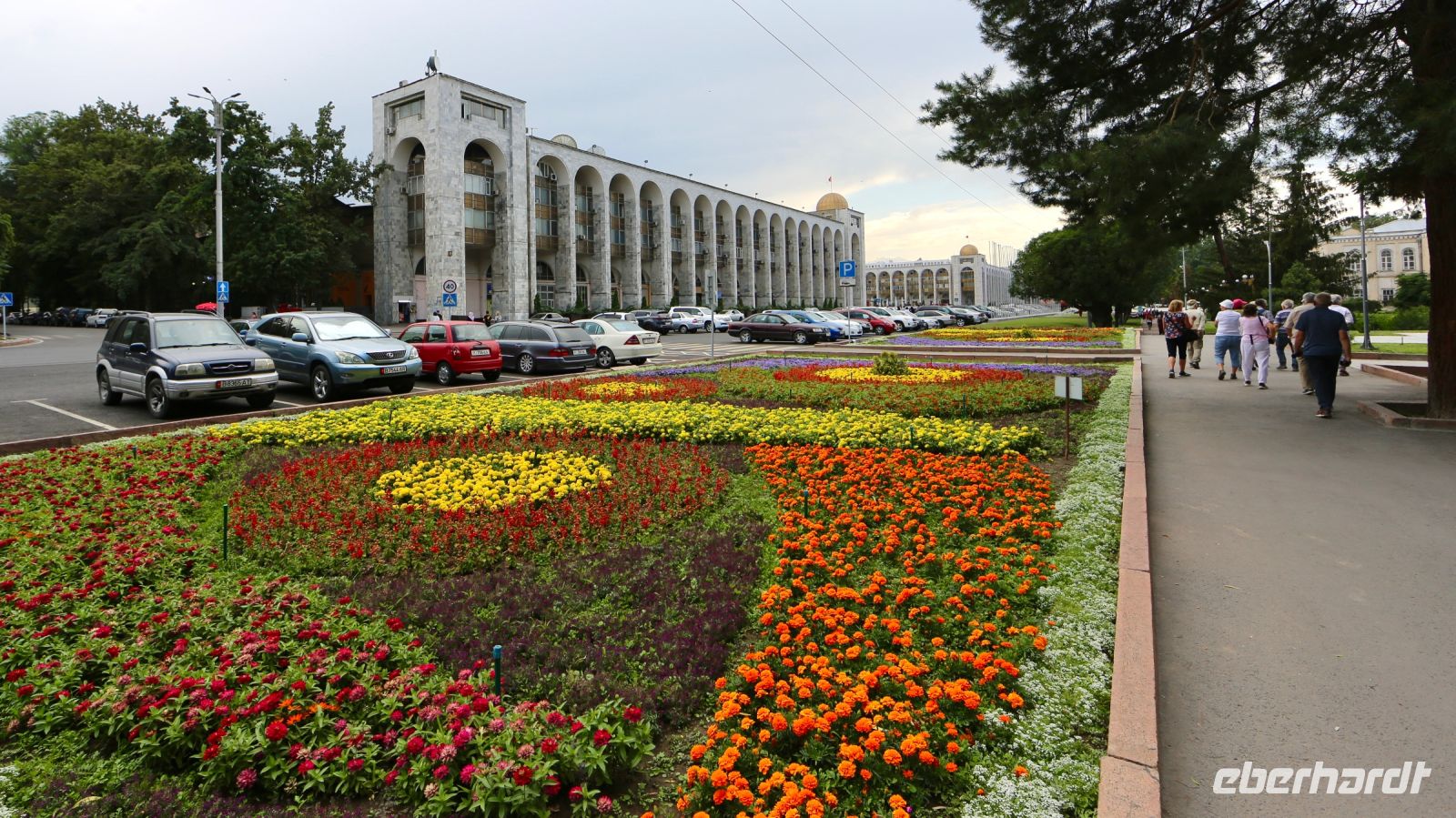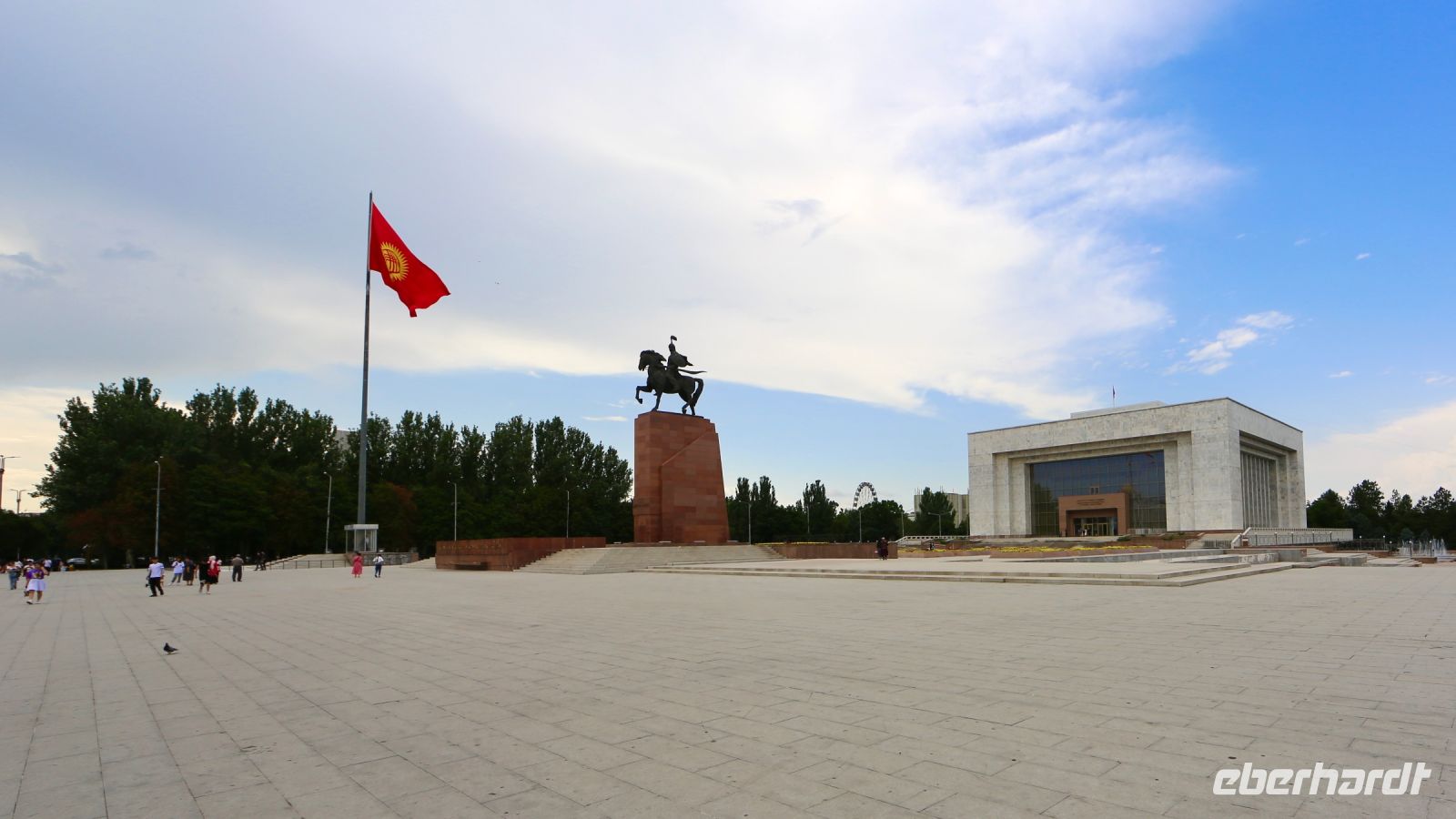 Viel Verkehr und kleinere Staus lassen uns nur zögerlich nach Bischkek kommen – wir nähern uns der Großstadt. Auf einem Stadtrundgang macht uns Lena nach Ankunft mit den wesentlichsten Sehenswürdigkeiten im Zentrum der kirgisischen Hauptstadt bekannt. Dann checken wir im recht modernen Plaza ein. Als wir uns zum Abendessen in der Lobby treffen überrascht Lena alle mit einem Andenken an Kirgisistan, einem traditionellen gemusterten Sitzkissen aus gewalkter Wolle.
