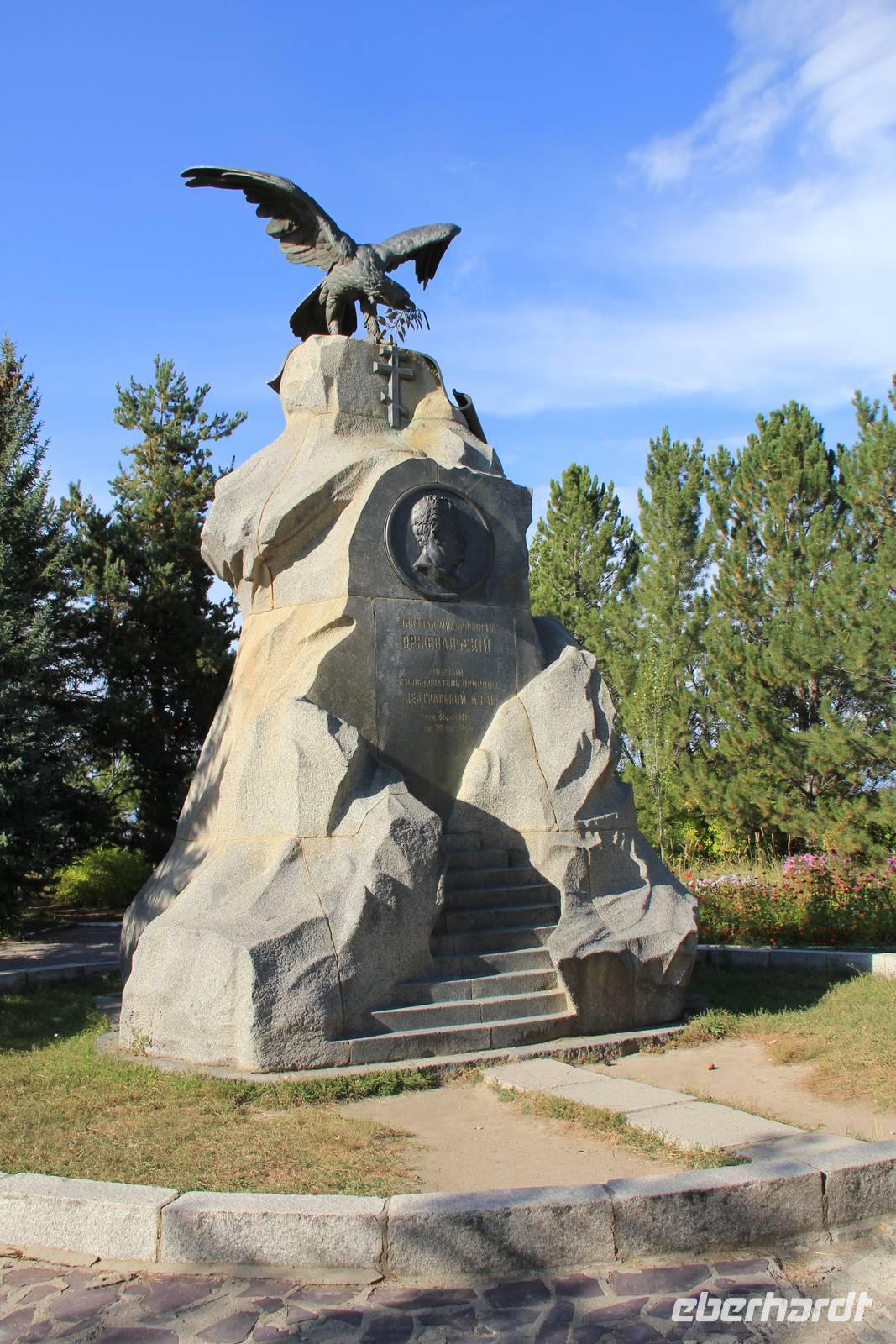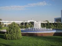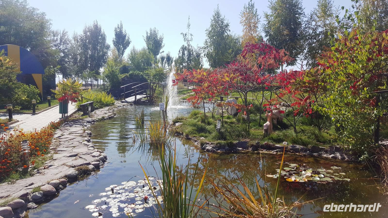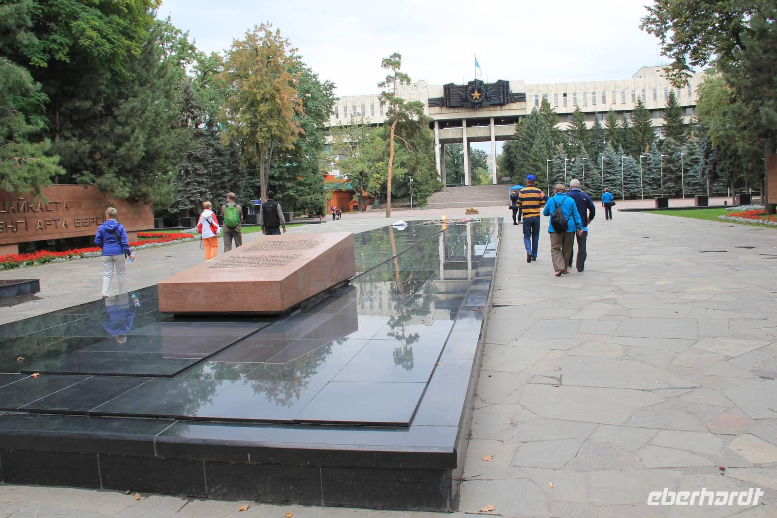 Nach dem Mittagessen unternahmen wir dann unsere Stadtbesichtigung in Almaty. Wir starteten mit einem Rundgang durch den Panfilov Park, der den 28 Soldaten von Panfilov gewidmet ist. Hier befindet sich auch die schönste Kathedrale der Stadt, die russisch-orthodoxe Senkov Kathedrale. Weiter ging es entlang der Tannenallee der Staatschefs zum Denkmal der 28 Panfilov-Soldaten, wo sich auch die ewige Flamme und Denkmäler der Heldenstädte befinden. Mit dem Bus ging es weiter zum Hotel Kasachstan mit dem gegenüberliegenden Pusteblumen-Springbrunnen und zum Platz der Republik, heute auch neuer Platz genannt.