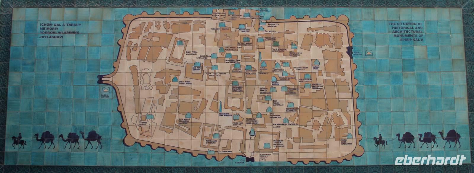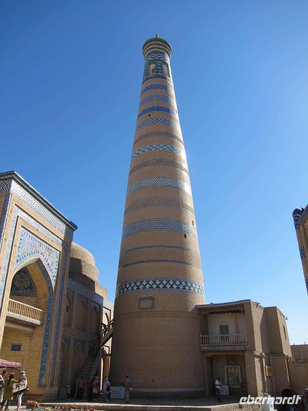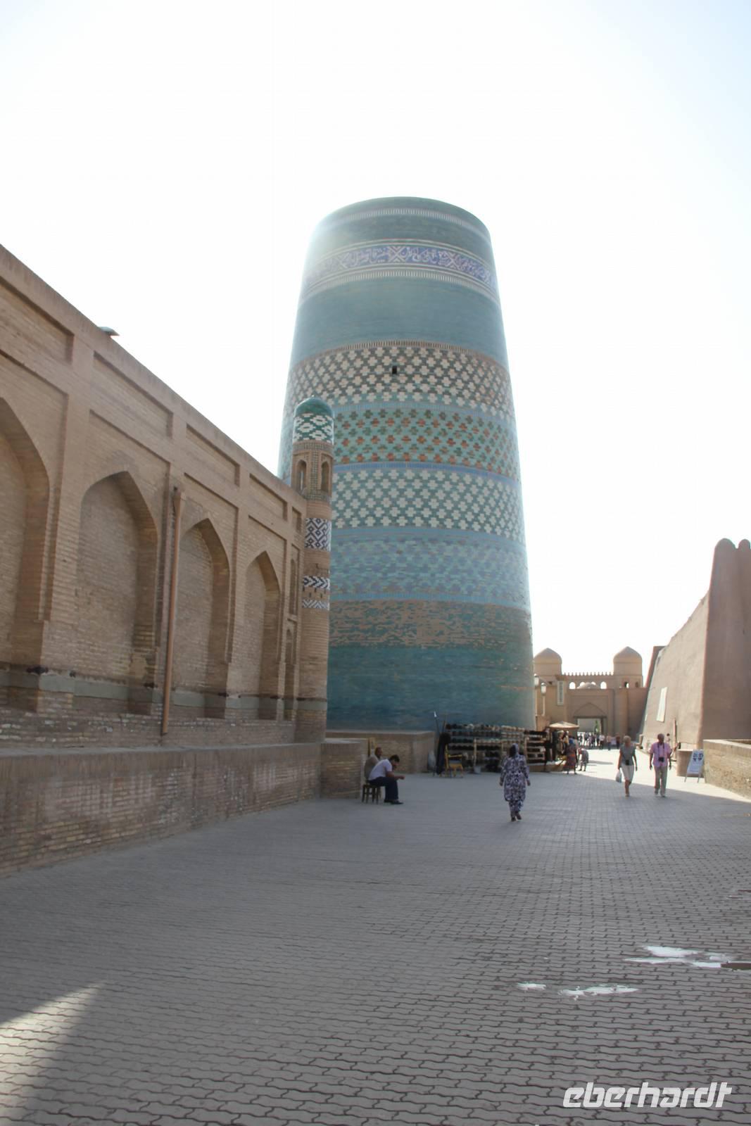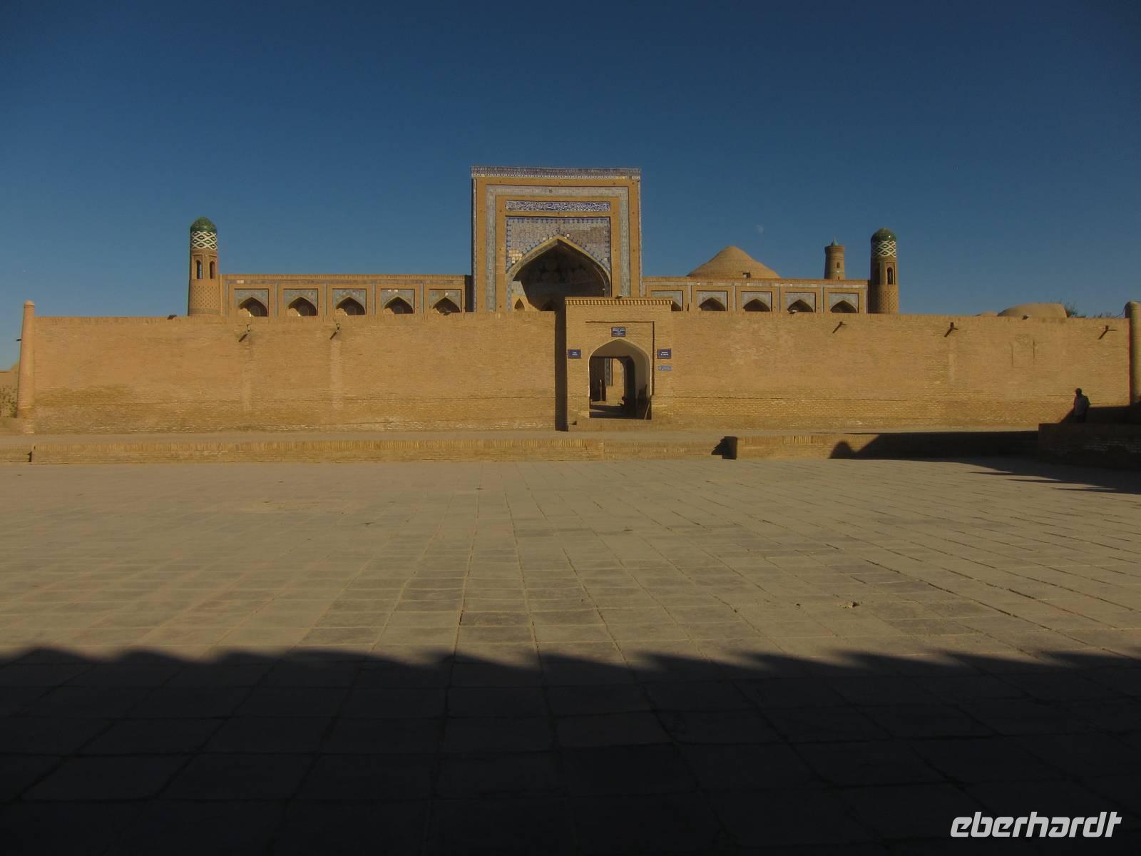 Nach dem Mittagessen in der Altstadt von Chiwa stand die Besichtigung dieser wunderschönen Altstadt auf dem Plan. Dabei wurden unter anderem die hiesige Zirkusfamilie, die Djuma Moschee (Freitagsmoschee), der Tash Hauli Palast sowie die alte Festung Chiwas besucht. Auch bei einer Teppichknüpferei, wo Teppiche noch aus reiner Seide in Handarbeit hergestellt werden, sowie bei einer kleinen Holzstube, wo unter anderem Koranständer gebaut werden, wurde vorbei geschaut.