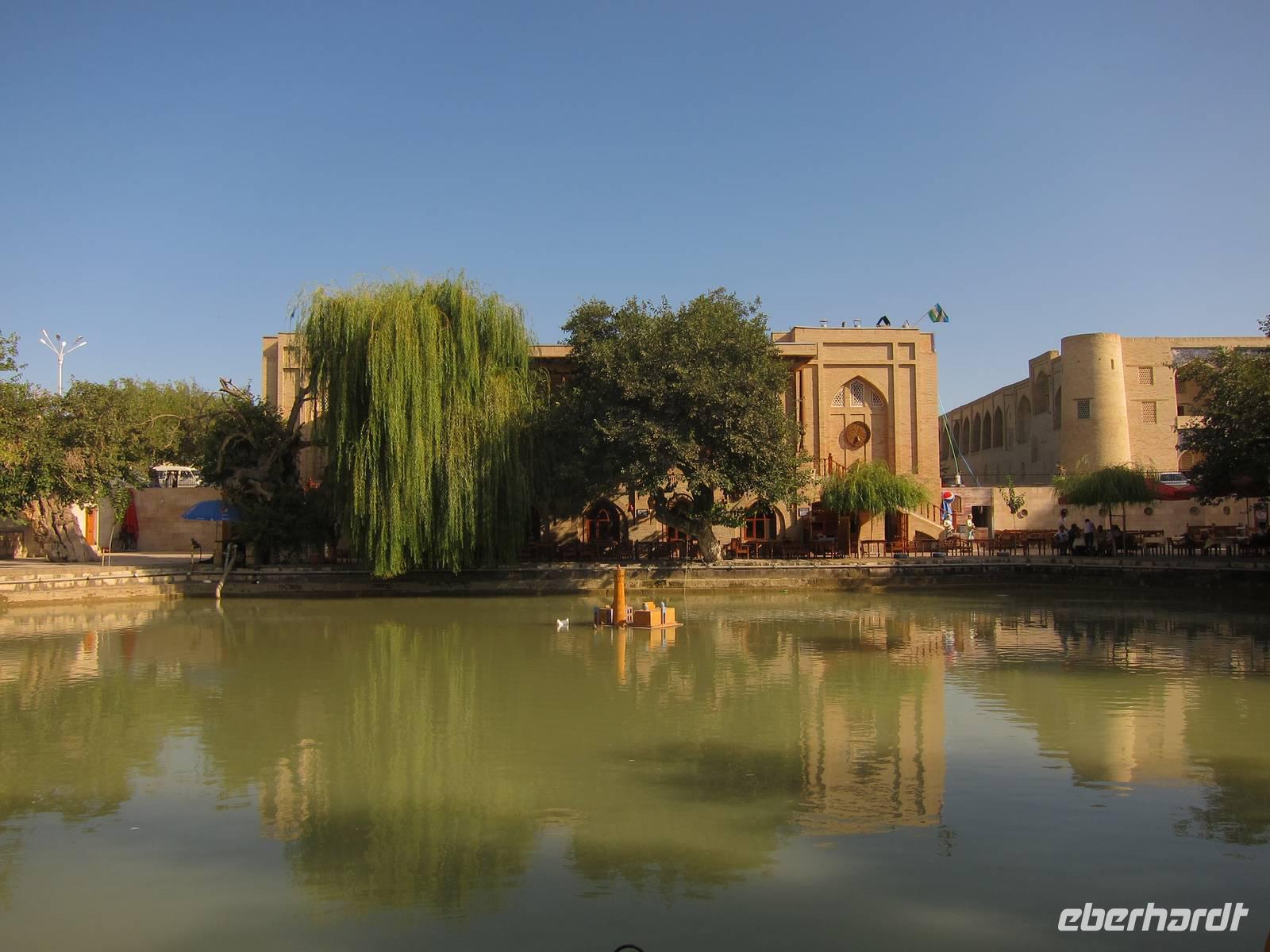 Dieser Tag stand ganz im Zeichen von Buchara, einer der schönsten Städte des Landes. Während der Stadtbeischtigung sahen wir die Medrese Nodir Devon Begi sowie den auf dem Esel sitzende Hodja. Weiter ging es mit dem Bus zum Samaniden-Park, mit dem gleichnamigen Museum. Weiter ging es zur Hiobsquelle, wo Zika etwas zur heutigen Wasserversorgung der Stadt und des Landes erklärte. Später ging es dann auf den Markt von Buchara. Später wurde die Moschee mit den 40 Säulen sowie die ehemaligen Festung Bucharas beischtigt.