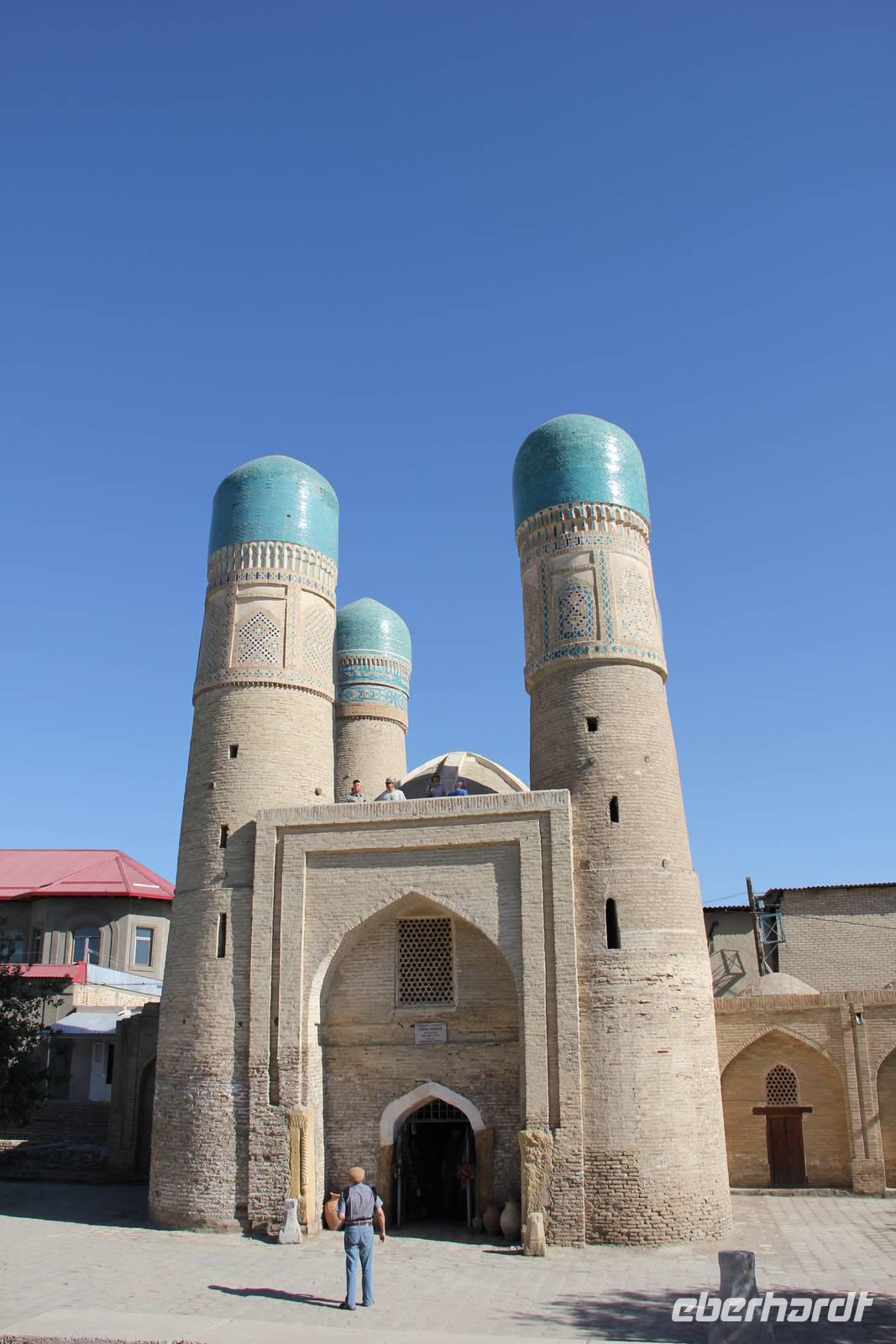 Am Nachmittag stand die Besichtigung des Poi-Kalon Komplexes mit Kalon Moschee, Kalon Minarett und Medrese Miri Arab auf dem Plan. Dieser Komplex gilt als eine der Hauptsehenswürdigkeiten der Stadt. Danach führte Zika die Gruppe durch die Handelshöfe der Stadt, wo man Storchenscheren, Tücher, Tischdeckchen und vieles mehr kaufen konnte.