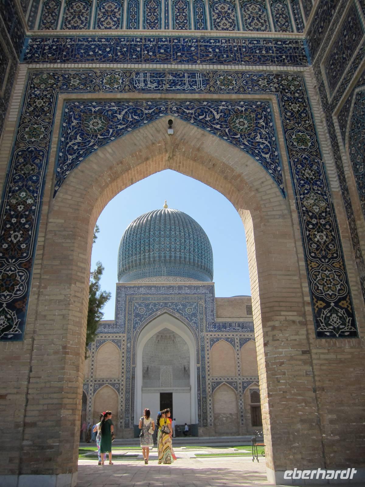 Dieser Tag wurde ganz Samarkand gewidmet. Bei einer ausführlichen Stadtbesichtigung wurden das Gur Emir Mausoleum mit seiner melonenartige Kuppel besucht und die drei Medresen des Registan Platzes ausführlich besichtigt. Weiter ging es zu Fuß über die Taschkent Street zur Moschee Bibi Hanim, wo heute leider nur noch die Überreste der einstig prächtigen Moschee erhalten sind. Zudem wurde dem Basar der Stadt natürlich ein Besuch abgestattet.