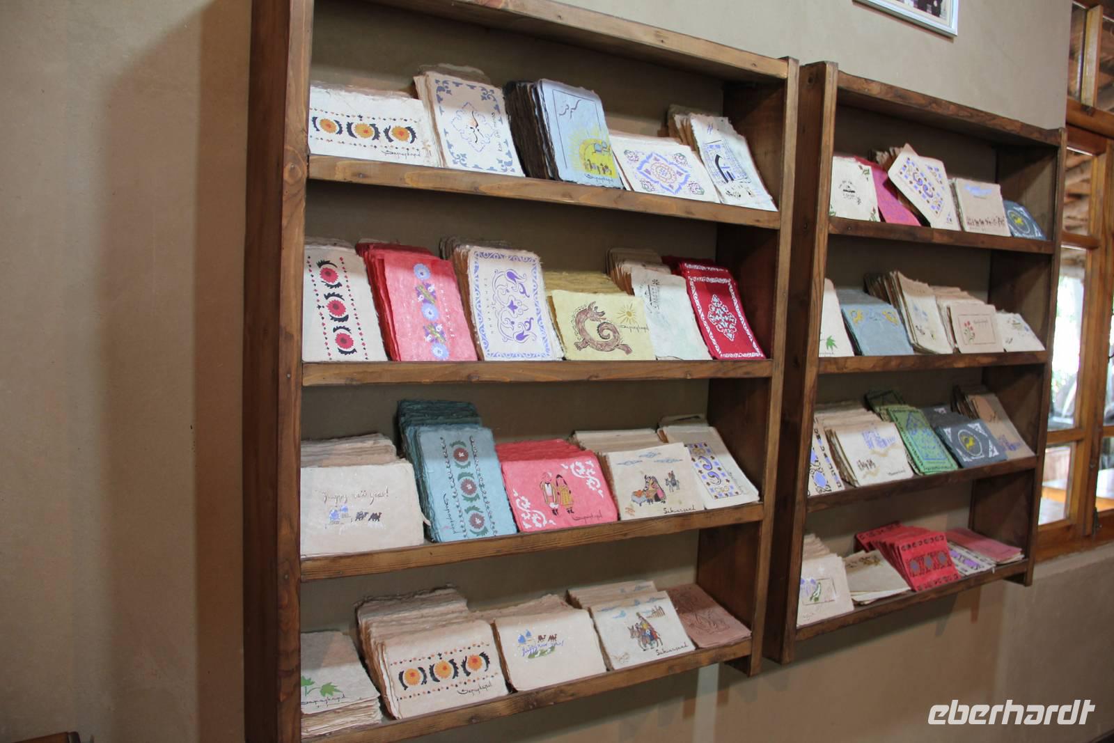 Nach der Besichtigung der Gräberstraße und Nekropole Shoshi Zinda an diesem Vormittag ging es zu einer Seidenpapierfabrik in Samarkand. Hier wurde erklärt, wir noch heute Seidenpapier traditionell in Handarbeit hergestellt wird.
