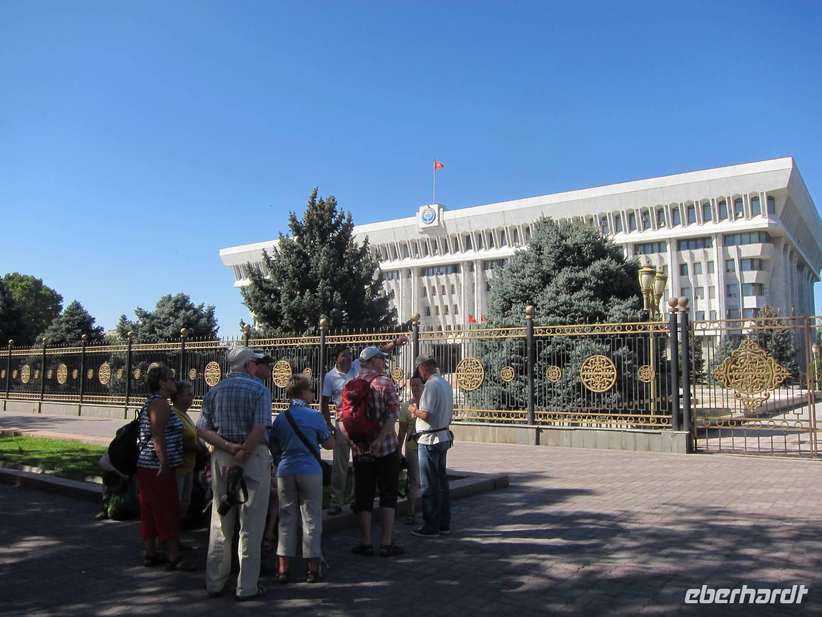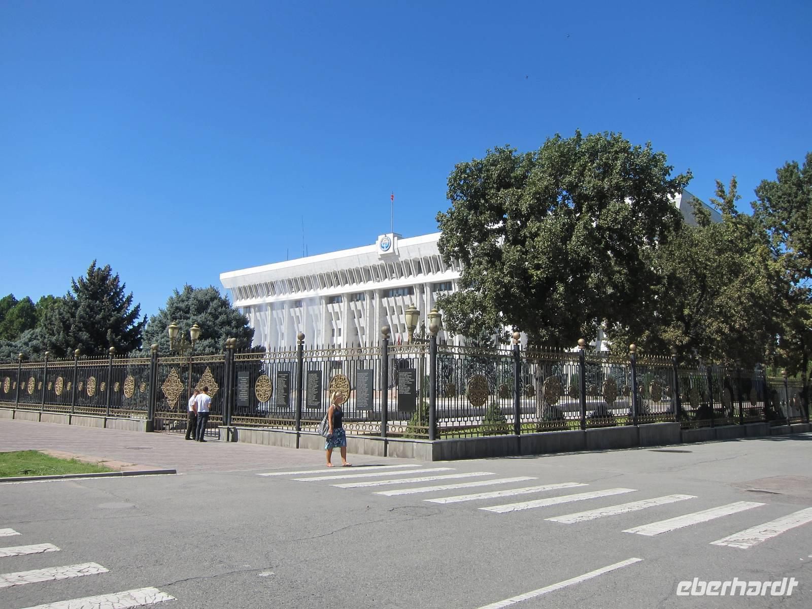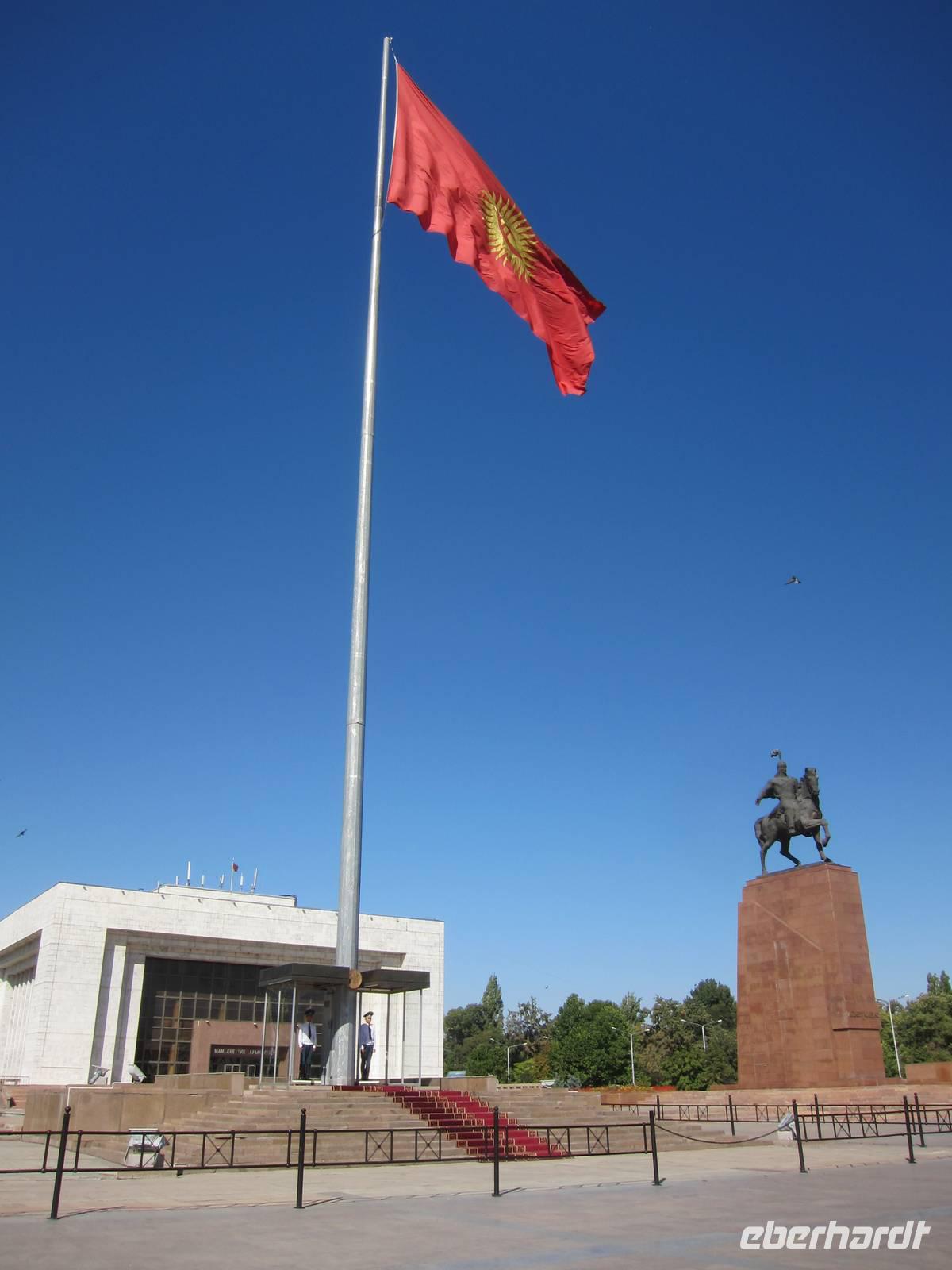 Dem Nachmittag verbrachten wir dann mit einem Stadtrundgang durch Bishkek. Dabei sahen wir die Statue von Kurmanjan Datka im Eichelpark. Weiter ging es durch den Eichelpark zur einst glühenden ewigen Flamme. Direkt daneben befindet sich das von außen weniger anschauliche russische Drama-Theater. Hier werden sowohl moderne, als auch klassische Stücke aufgeführt, jedoch immer auf Russisch. Vorbei am Theater für Oper und Ballett sowie an der Bibliothek der Stadt gingen wir in Richtung Regierungspalast. Dabei sahen wir noch die amerikanische Universität der Stadt, das heutige Nationalmuseum mit der Lenin-Statue davor. Der Regierungspalast wird auf Grund seines Aussehens auch das Weiße Haus von Bishkek genannt. Auf dem Ala Too Platz angekommen, sahen wir die bewachte kirgisische Flagge sowie ein Reiterstandbild des kirgisischen Nationalhelden Manas. Laut einem Nationalepos soll er die 40 kirgisischen Stämme vereint haben.