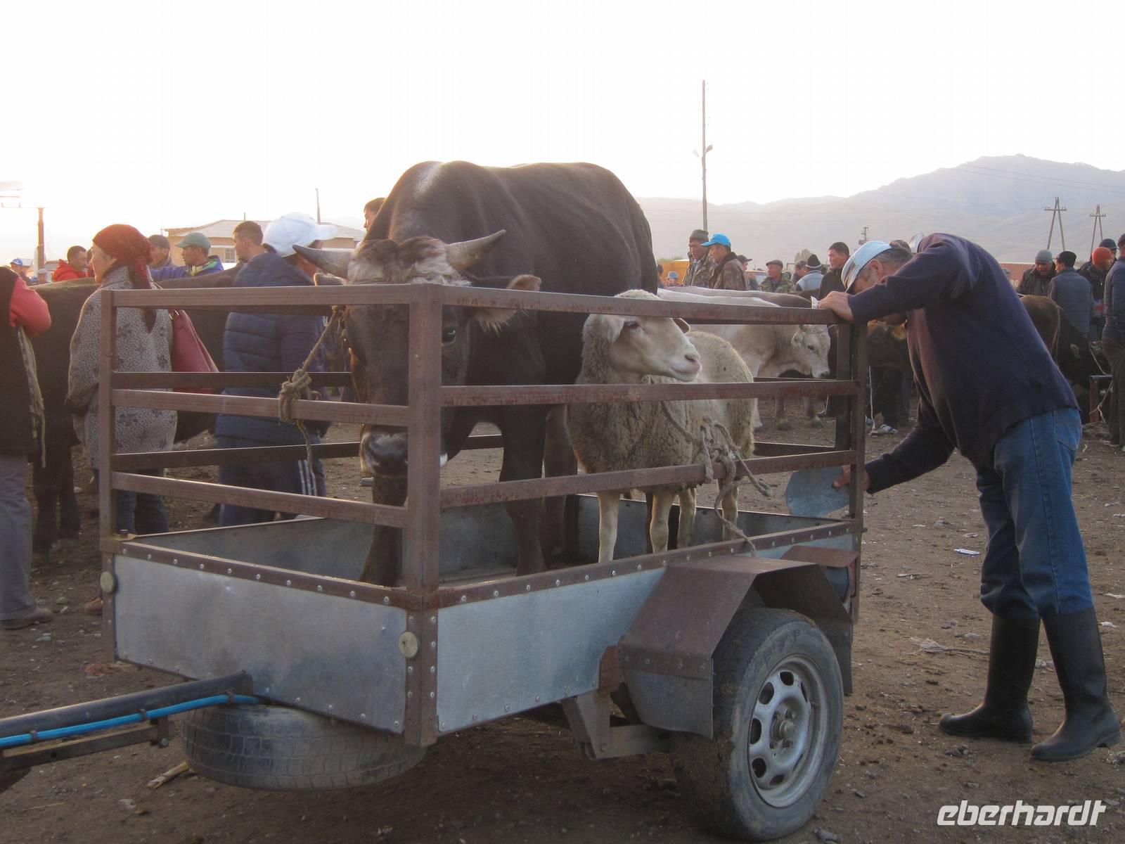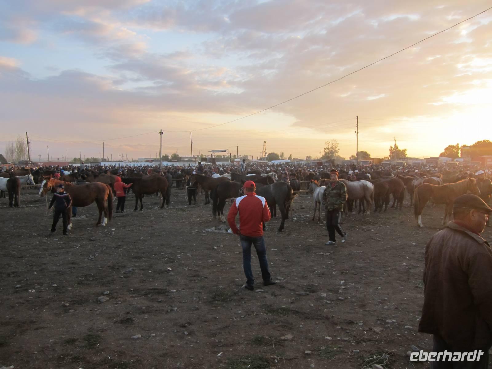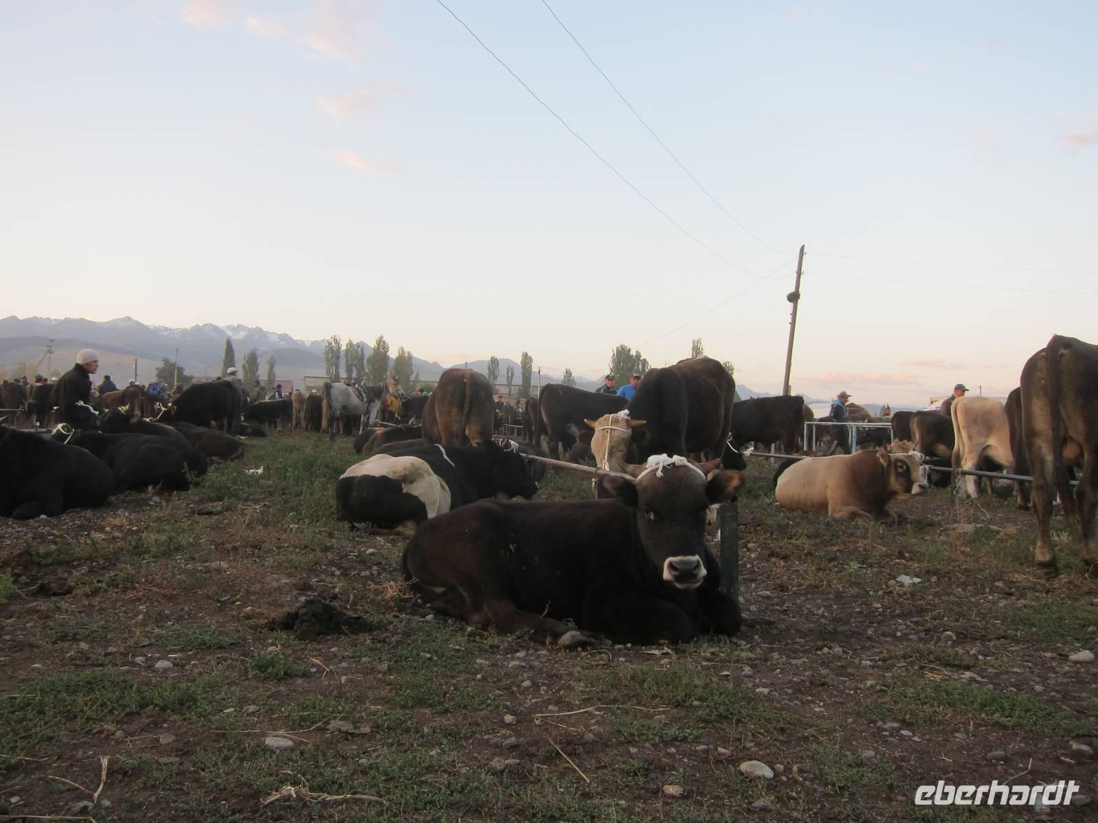 Für den Großteil der Gruppe hieß es heute früh aufstehen, da es zum hiesigen Viehmarkt ging. Mit dem Sonnenaufgang kamen wir dort an und konnten das spektakuläre Treiben aus handelnden Kirgisen und Tier von Pferden über Rinder und Ziegen bis hin zu Schafen beobachten. Dabei ging es teilweise heiß her und man musste auch aufpassen, wo man hintrat.