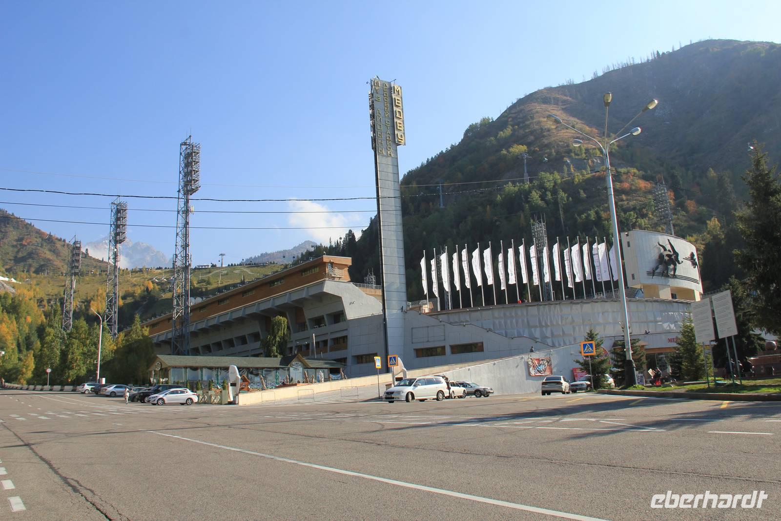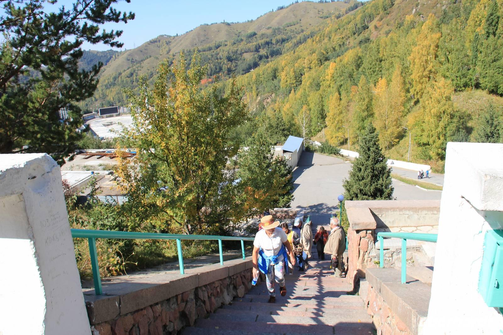 Nach einem leckeren letzten zentralasiatischen Mittagessen fuhren wir nachmittags etwas raus aus der Stadt. Zuerst ging es hoch auf den Aussichtsberg Koktobe, wo sich auch der Fernsehturm der Stadt befindet. Hier genossen wir die Aussicht bei strahlendem Sonnenschein. Weiter ging es dann in die Medeo Schlucht. Wir fuhren bis zum Eisstadion von Medeo, wo wir die Freizeit vor allem mit Treppensteigen verbrachten. Denn hier führen 841 Stufen hoch hinauf zum Medeo-Damm. Nicht alle wagten den Aufstieg bis ganz hoch, aber die Aussicht auf das Stadion und die umliegende Natur lohnt sich auch schon von etwas weiter unten! Nachdem alle wieder gut am Stadion angekommen waren, durfte ein nachmittäglicher Kaffee im Café hier natürlich bei unserer Gruppe nicht fehlen.