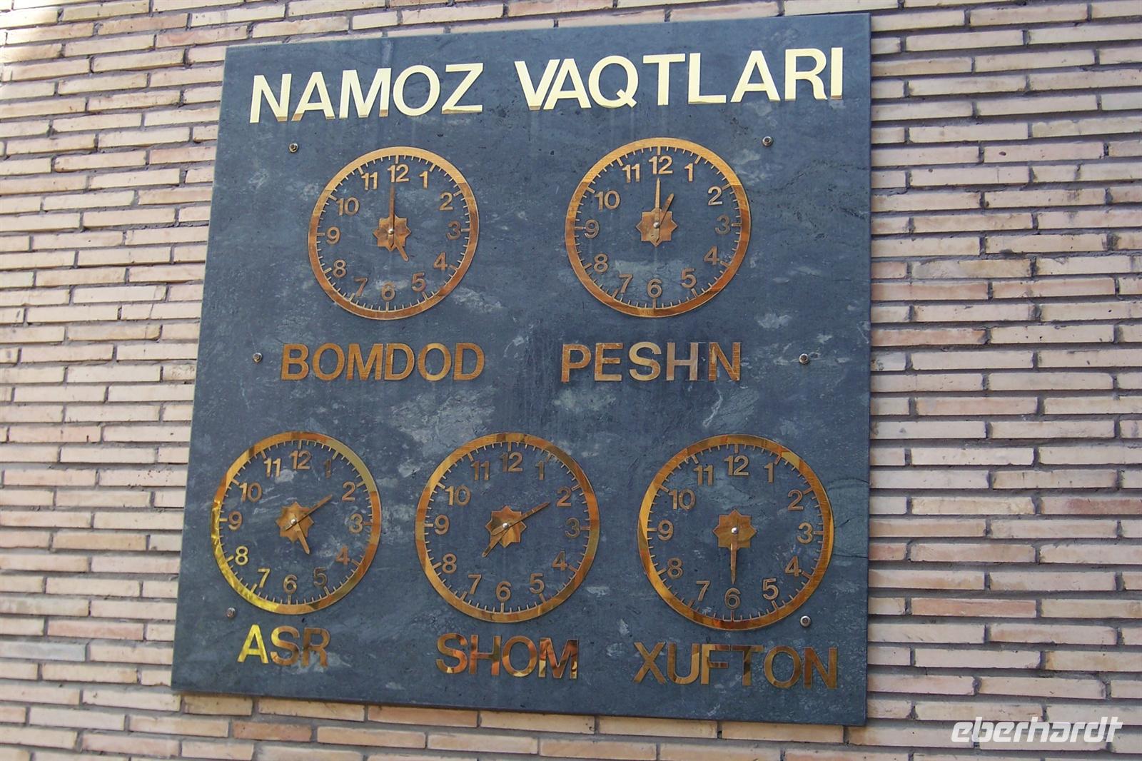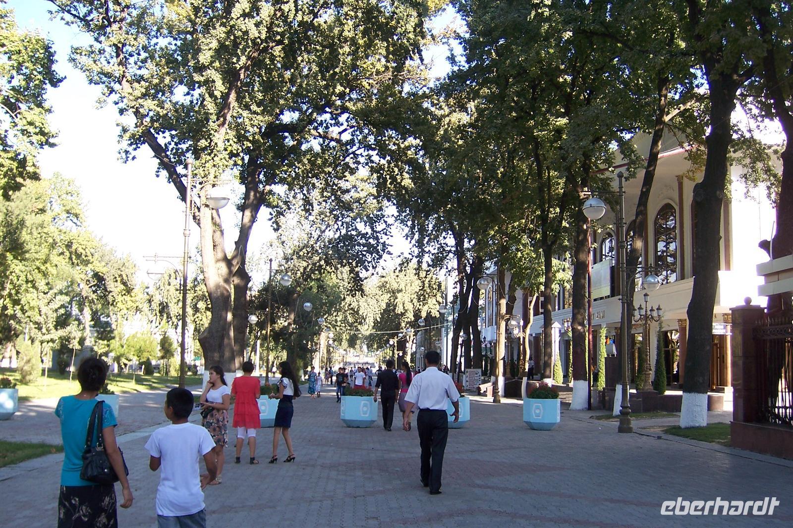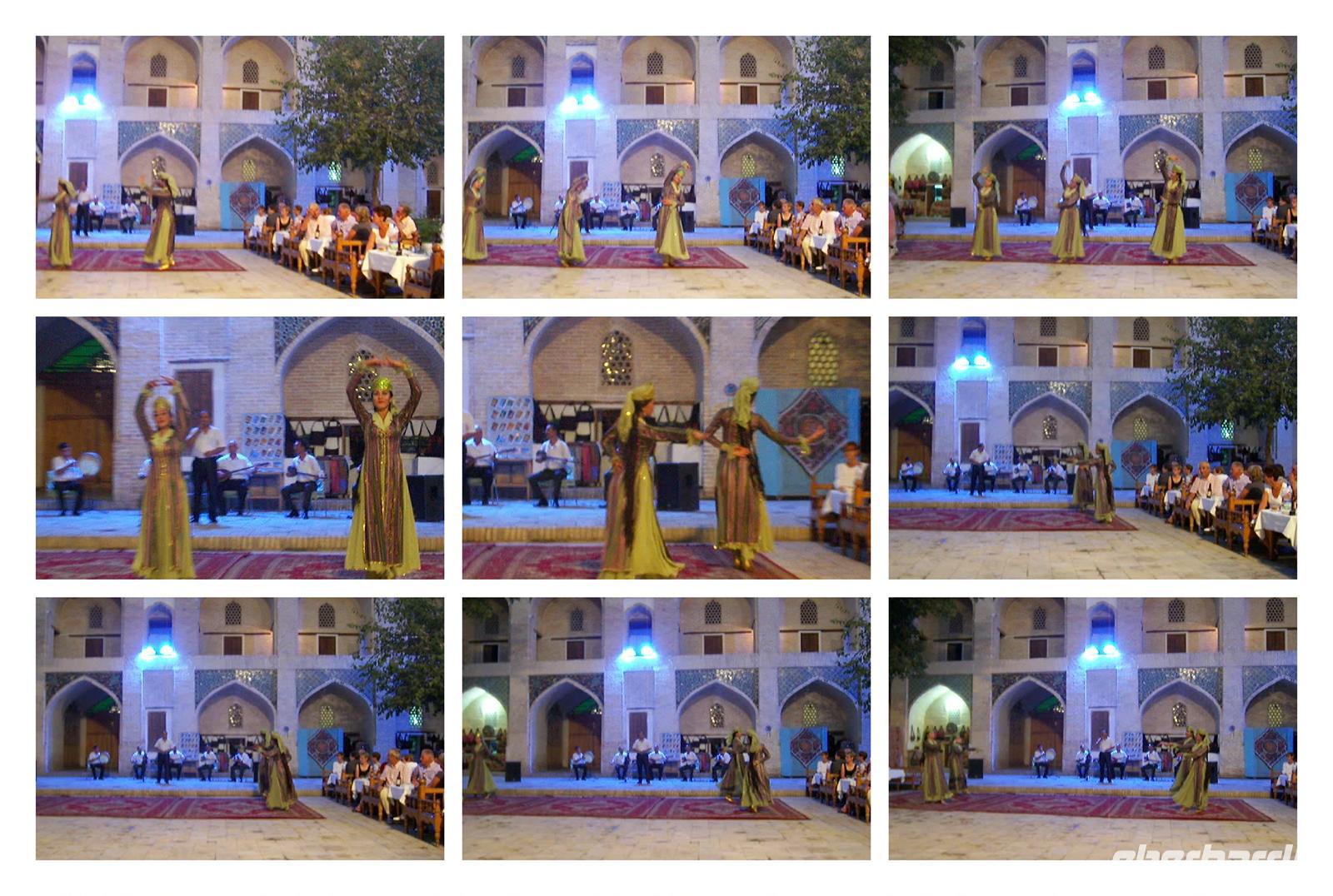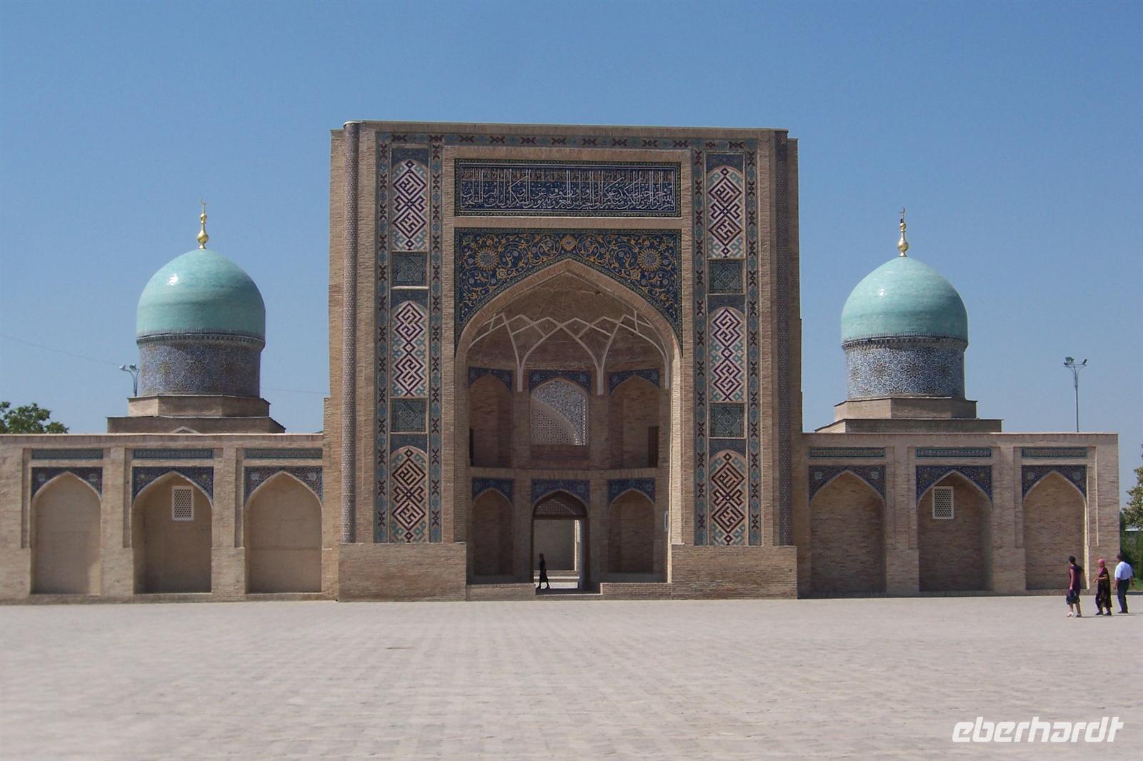 und der Medrese Barak Chan. Nach einem kurzen Bummel durch die einfachen Wohnhäuser fahren wir zum Restaurant, um Mittag zu essen. Hier werden wir mit schönen Tänzen unterhalten und ein Teil der Gruppe tanzt mit. Das Essen ist ganz hervorragend. Danach besichtigen wir die Kukeldasch-Medrese und bummeln gemeinsam über den Bazar. Da heute Ende des Ramadan ist, feiern viele Usbeken und auf dem Markt sind wenig Händler vertreten. Danach fahren wir mit der Tashkenter U-Bahn uns sehen einzelne interessante Stationen. Wir steigen um Unanhängigkeitsplatz aus und spazieren über die Fußgängerzone zum Hotel zurück. Zum Abschluss bietet sich ein tolles Fotomotiv mit dem Denkmal des Amir Timur vor unserem Hotel. Zum Abendessen fahren wir in ein usbekisches Restaurant und stoßen mit einem „Wässerchen“ auf den Beginn unserer Reise an.