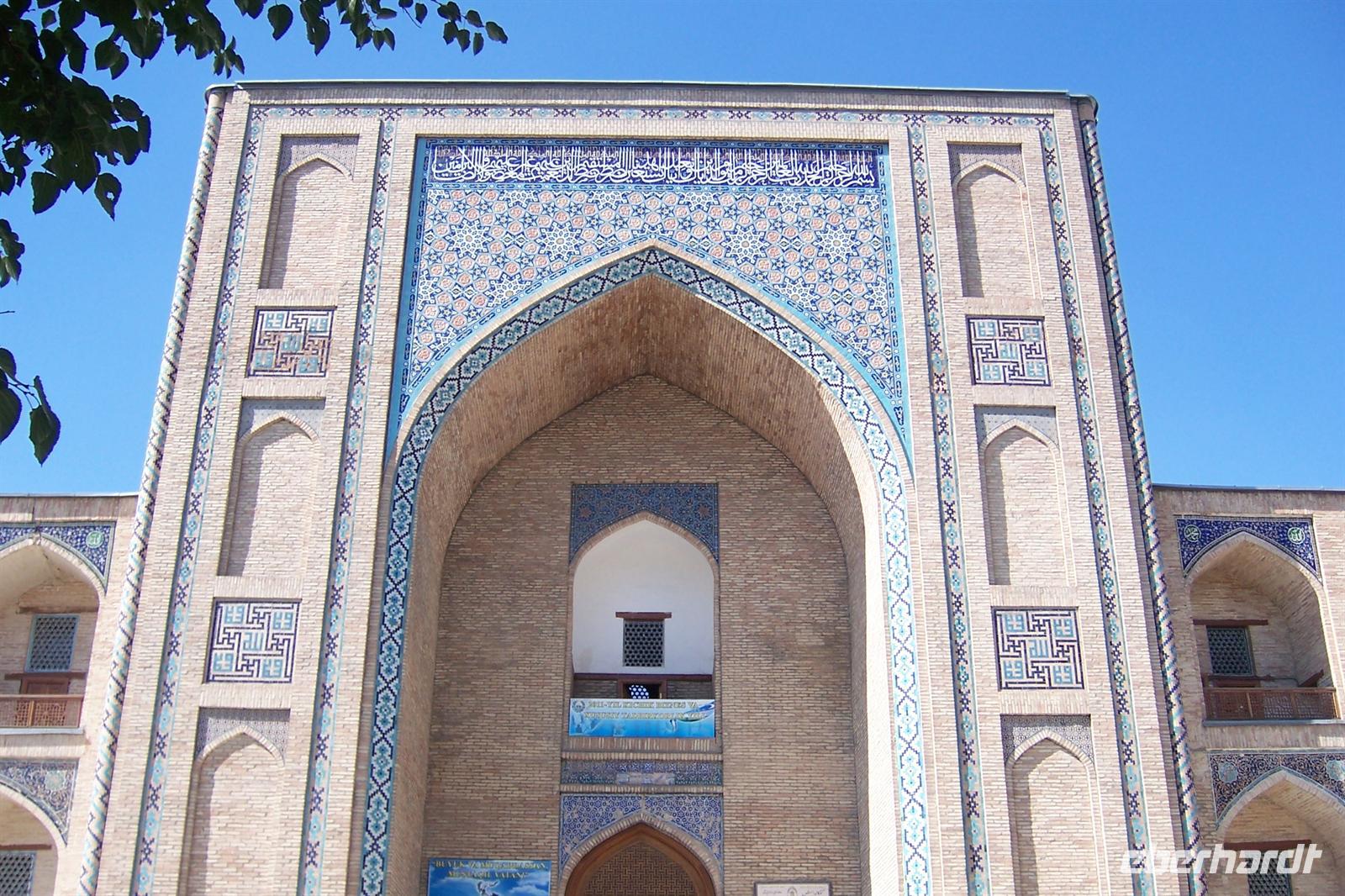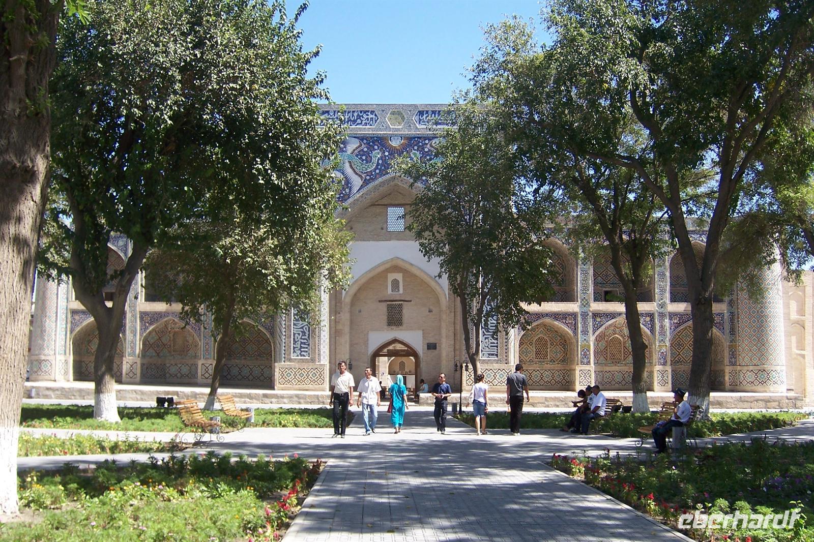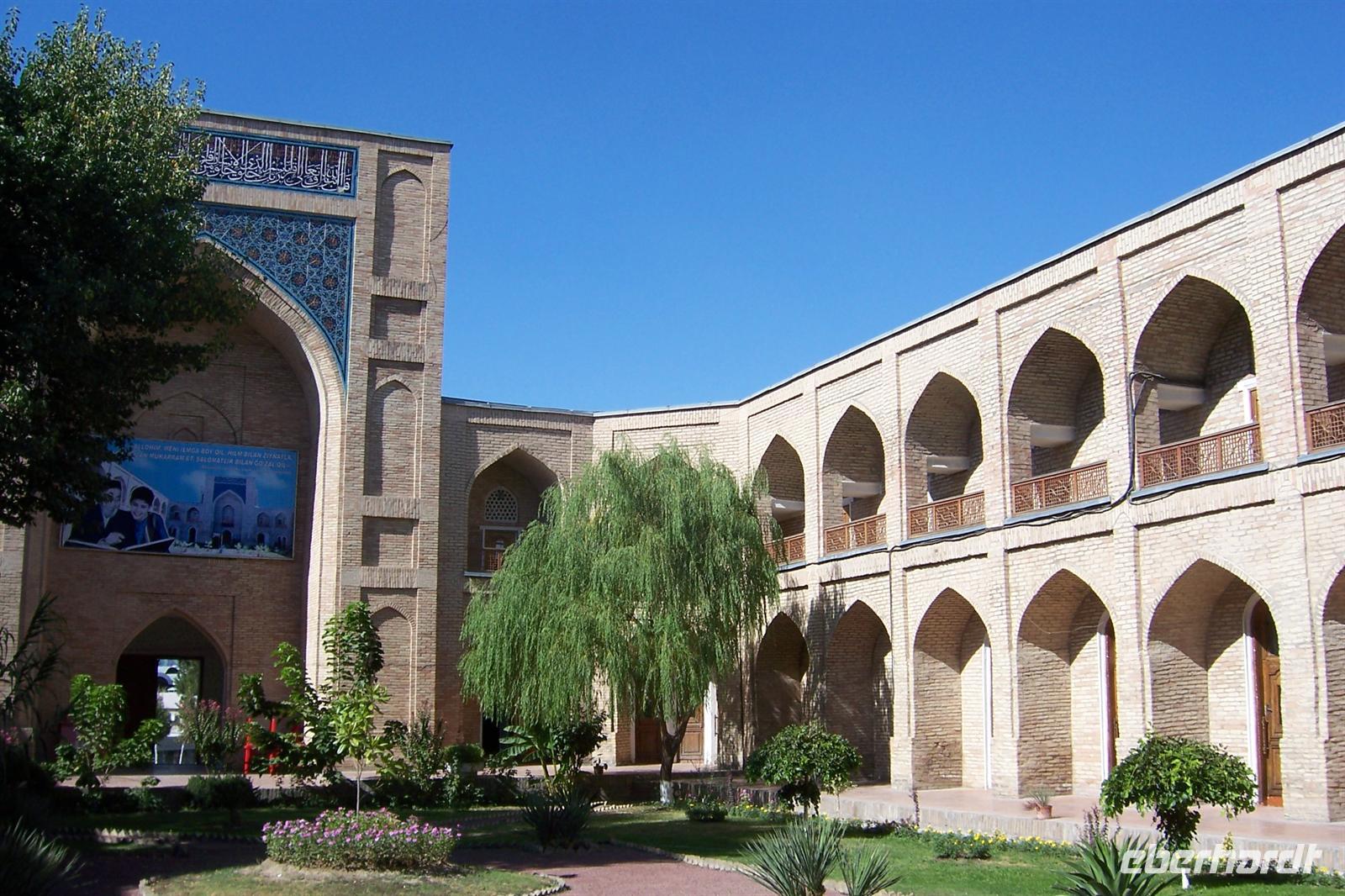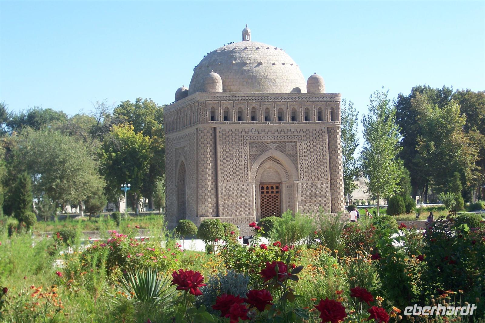 Wir starten unser Besichtigungsprogramm nach einem stärkenden Frühstück mit dem Besuch der aktiven Djubor-Frauenmedrese. Hier studieren 70 Schülerinnen den Koran, verschiedene Sprachen und Handwerkskunst. Die Lehrerinnen beantworten unsere neugierigen Fragen und wir dürfen einen Blick in die Unterrichtsräume werfen, in denen gerade unterrichtet wird. Etwas außerhalb der Altstadt spazieren wir durch den Park zum Mausoleum der Samaniden.