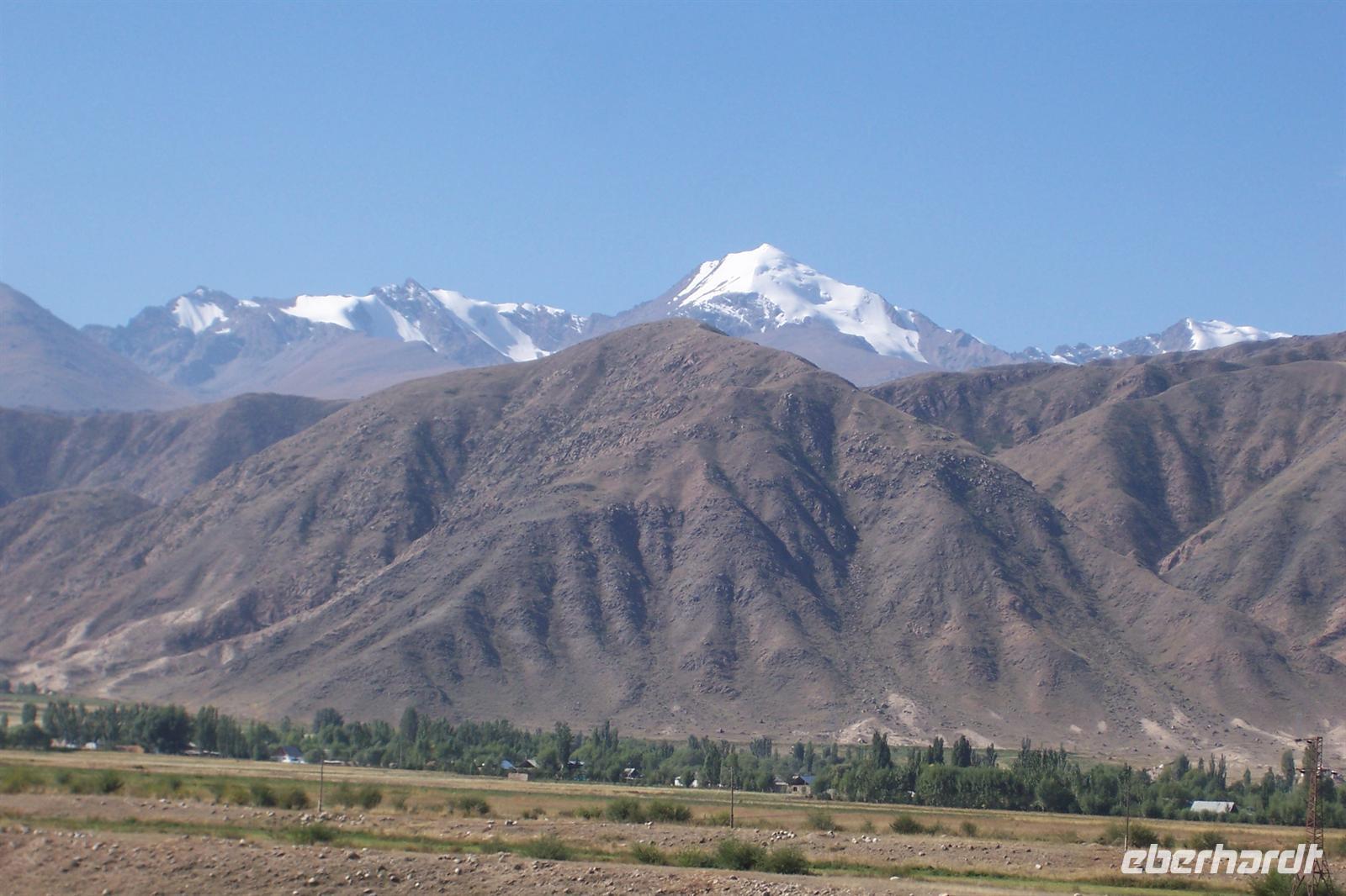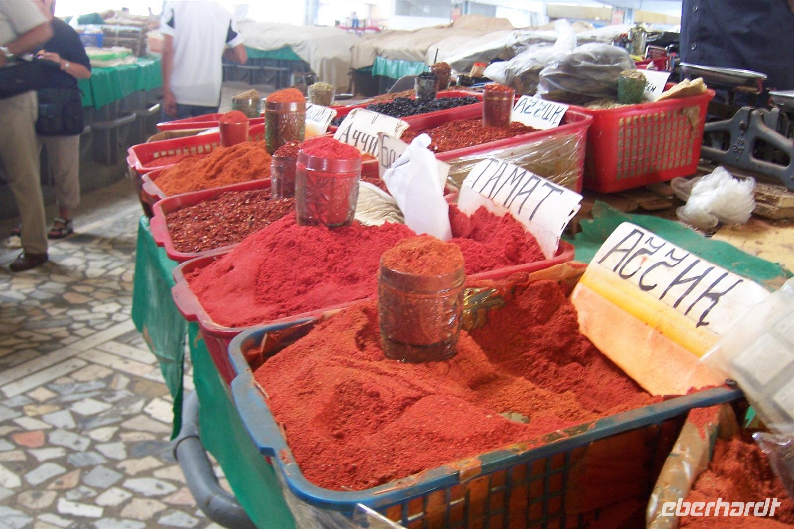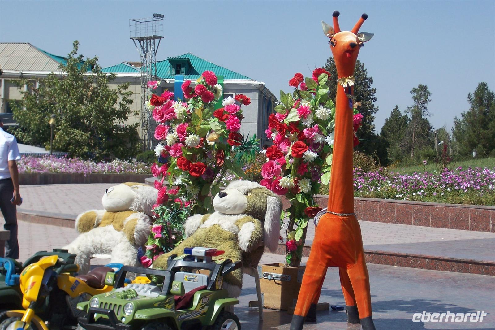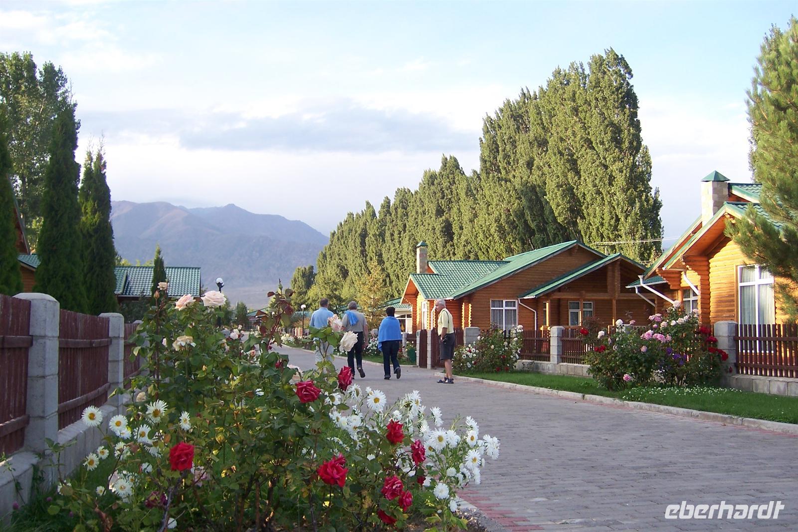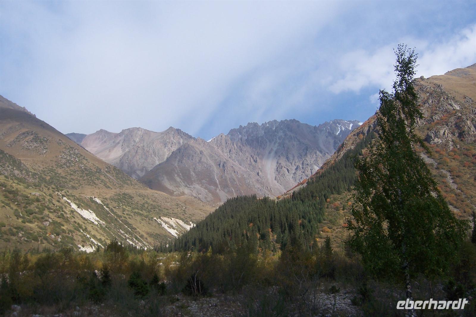 den Hauptplatz mit der Ehrenwache an der Nationalfahne und dem Parlamentsebäude. Da das Nationalmuseum noch geschlossen hat, entscheiden wir uns für den kurzen Besuch des Osch-Marktes. Wir bummeln durch die gehäuften Stände mit Nüssen, Reis und Süßwaren und wagen uns in die Fleischhalle. Danach fahren wir zum Zentrum zurück und besichtigen kurz das Nationalmuseum. Nach dem Mittagessen fahren wir in den Naturpark „Ala Arca“. Auch wenn die Wegstrecke nicht bis zu tiefen Schluchten und Gletschern führt, genießen wir die Natur und frische Luft. Leider bemerke ich, dass die Ausführungen von Irina nicht dem Anspruch unserer Gäste genügen und so entscheide ich, den örtlichen Reiseleiter zu tauschen.