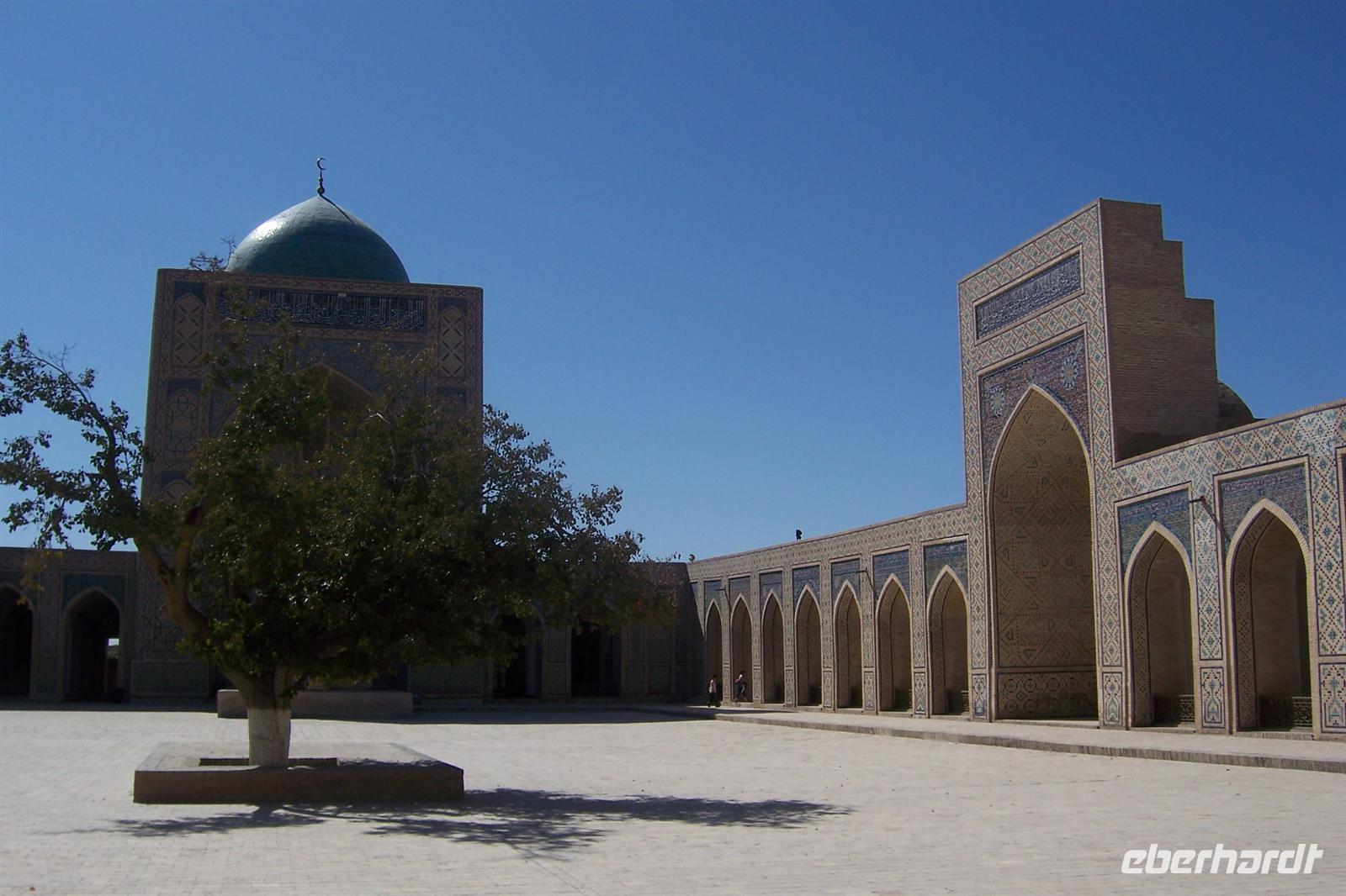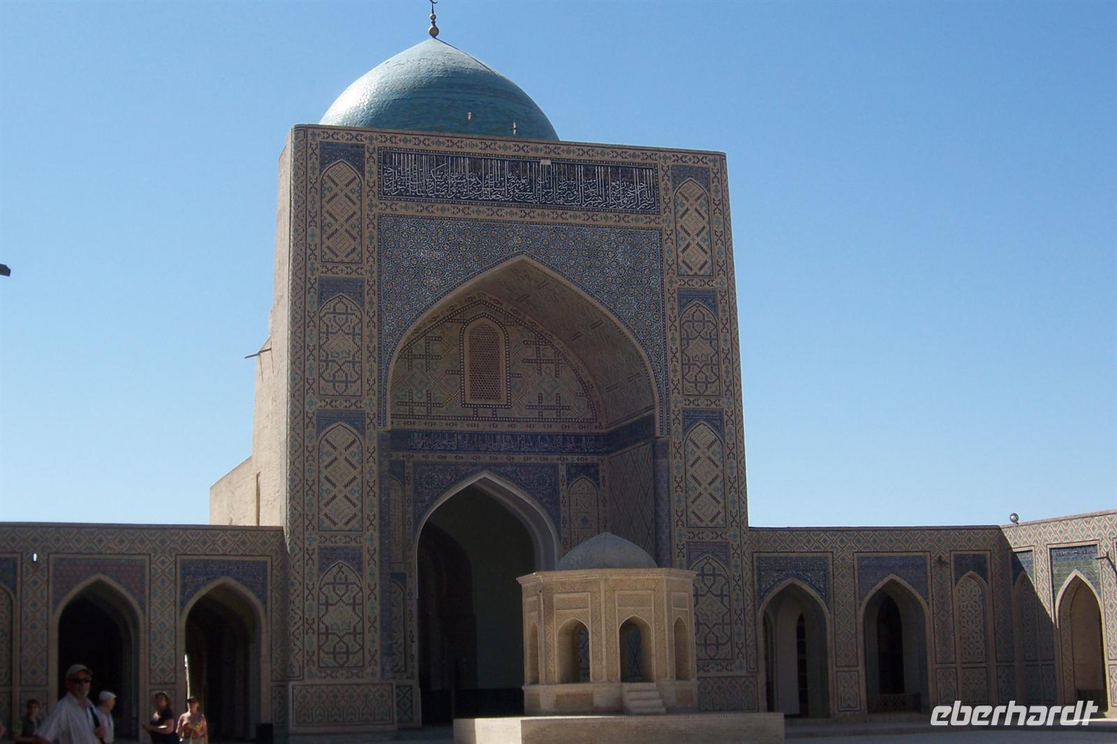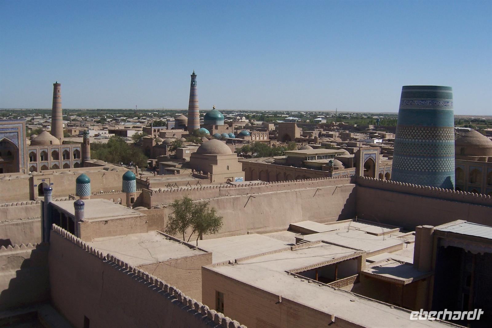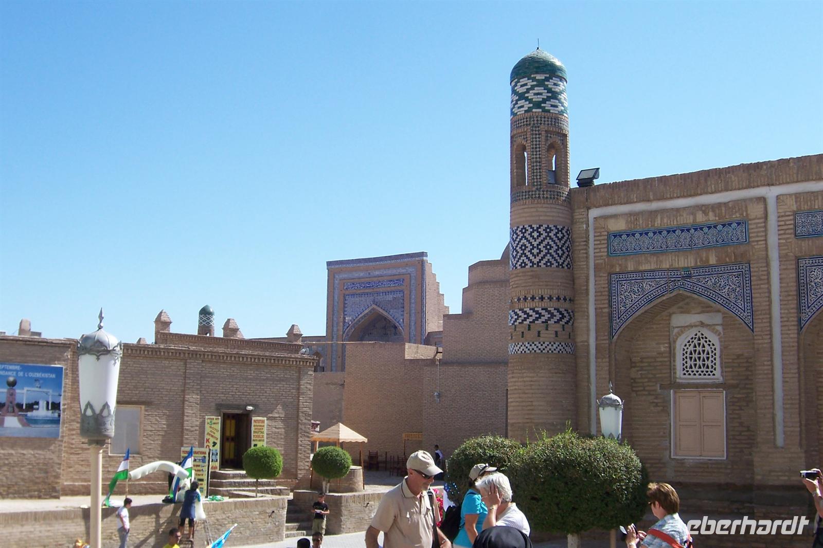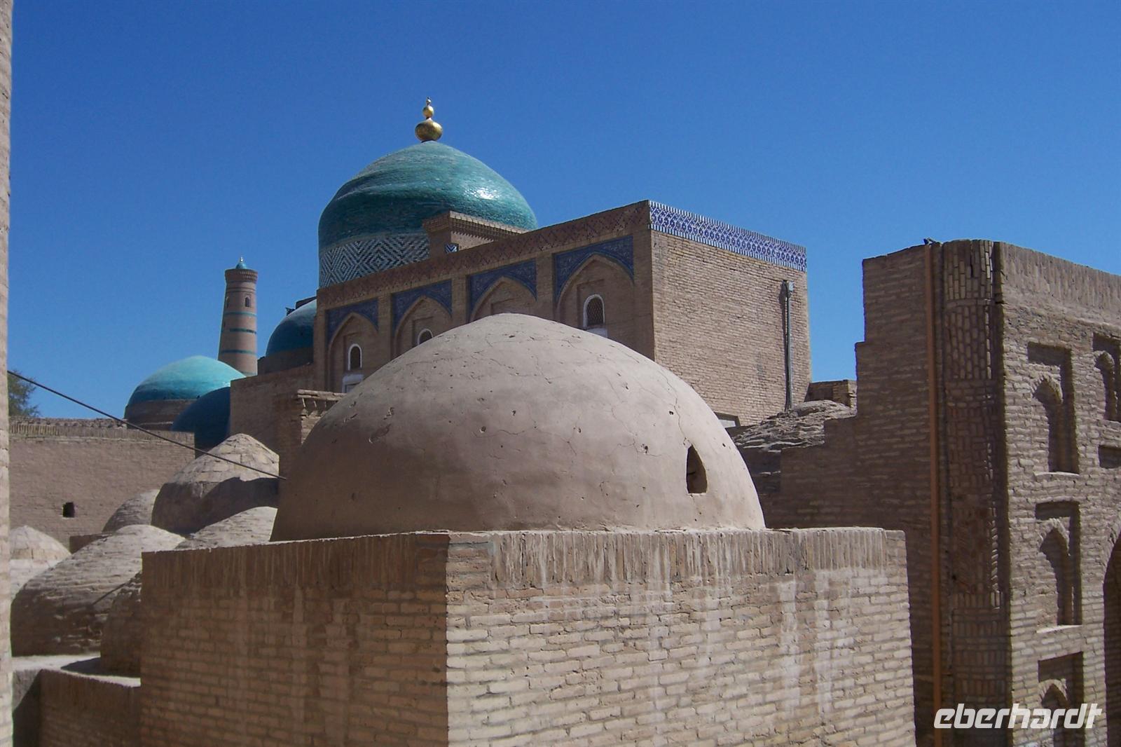 Nach einem kurzen Stopp an der Medrese Amin Chan bummeln wir durch die Gassen und Zika erklärt uns die zauberhaften Majolika-Muster und die Geschichte der Stadt. Wir laufen zum Tash Hauli-Palast. Die wunderschön verzierten Kacheln sind mit typisch choresmischen Ornamenten verziert. Wir sehen die Wohnräume des Chans uns seiner vier Frauen. Danach ist Mittagszeit und wir genießen ein schmackhaftes Mahl bei einer usbekischen Familie. Weiter schlendern wir durch die Innenstadt und erreichen das Pahlavon-Maxmud-Mausoleum. In dieses kommen zahlreiche Pilger und auch Brautpaare um zu beten. Wir haben Glück, dass genau während unseres Besuchs auch ein Brautpaar kommt und wir sehen können, welche Bräuche es gibt. Wir verfolgen das Gebet des Imams und sehen das Mausoleum. Weiter gehen wir zur Islom-Xo´ja-Medrese und besichtigen das Stadtmuseum. Durch die Gassen der Stadt erreichen wir die Djuma-Moschee, die von außen nüchtern aussieht, im Inneren aber einen tolle Säulenhalle mit geschnitzten Holzsäulen beherbergt, was ihr auch den Namen „Cordoba des Ostens“ brachte. Nun sind wir langsam auch aufgrund der hohen Temperaturen schon etwas fußlahm, werden aber zum Abschluss mit einem tollen Ausblick belohnt. Kox´na Ark, die Zitadelle bietet ein schönen Blick über die Kuppeln der Stadt.