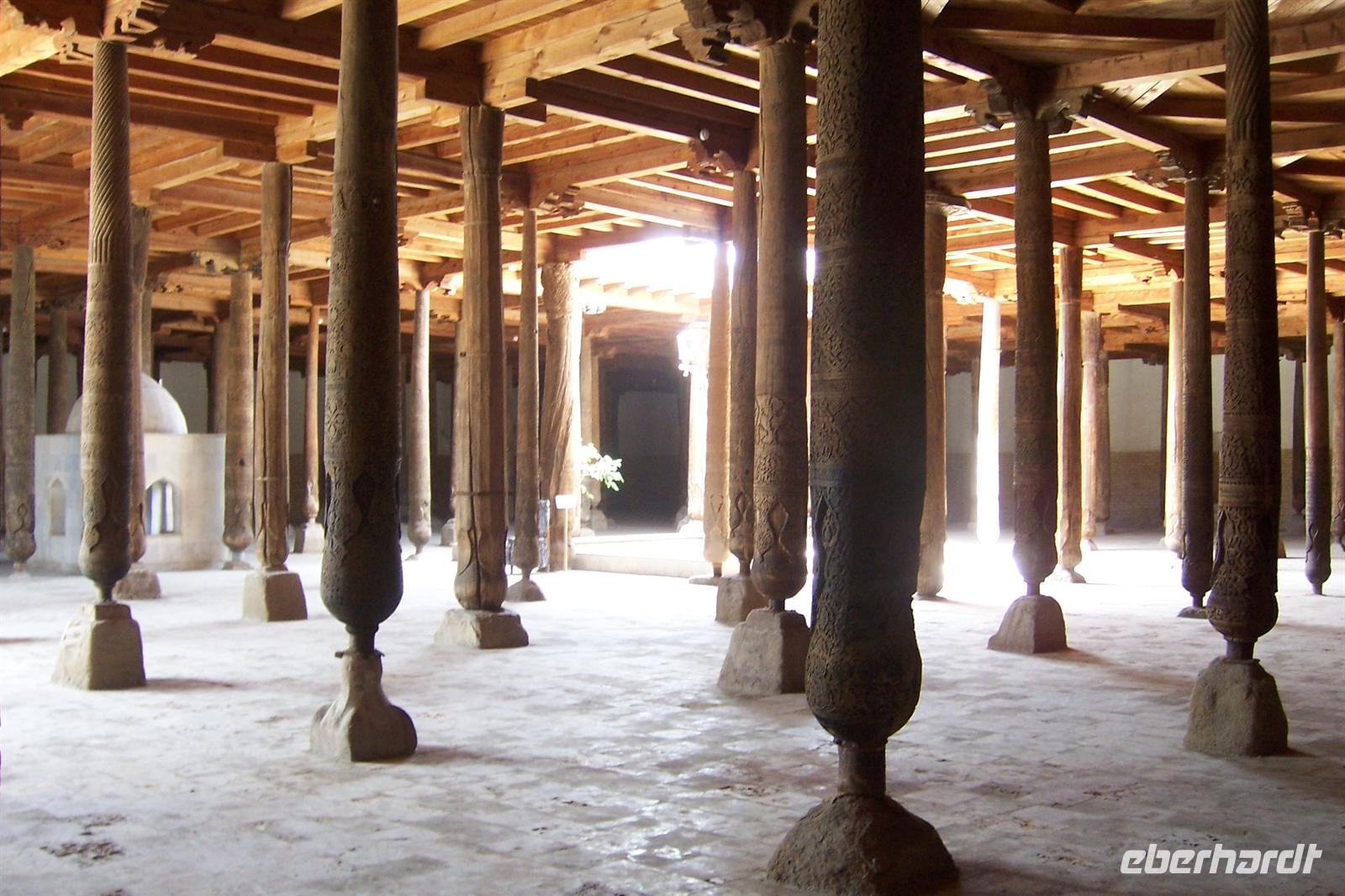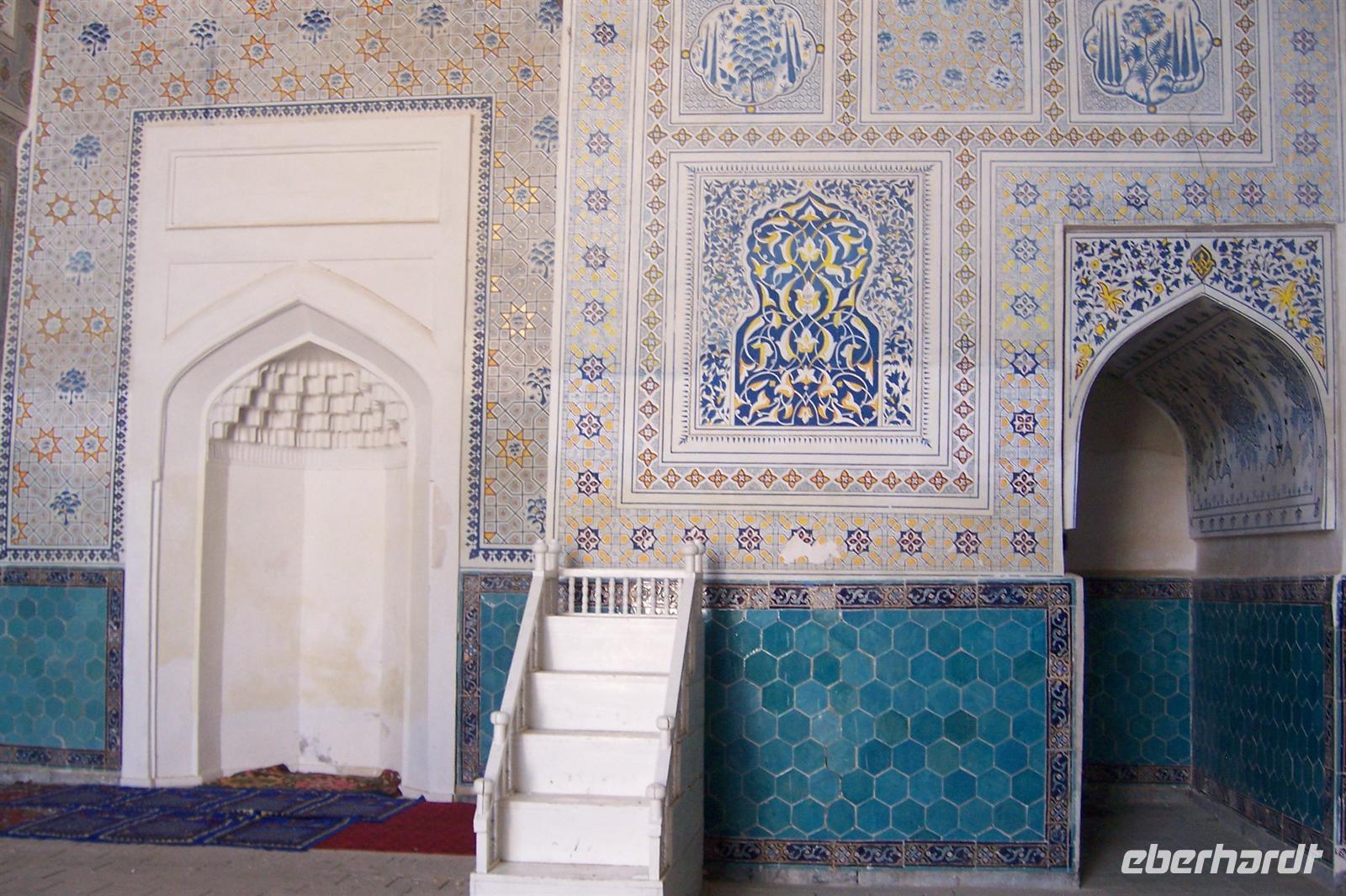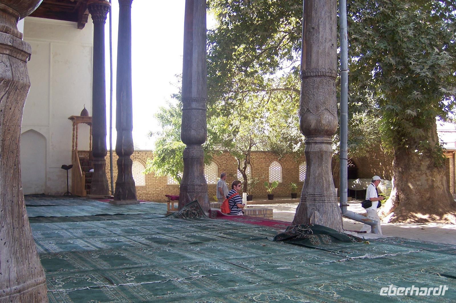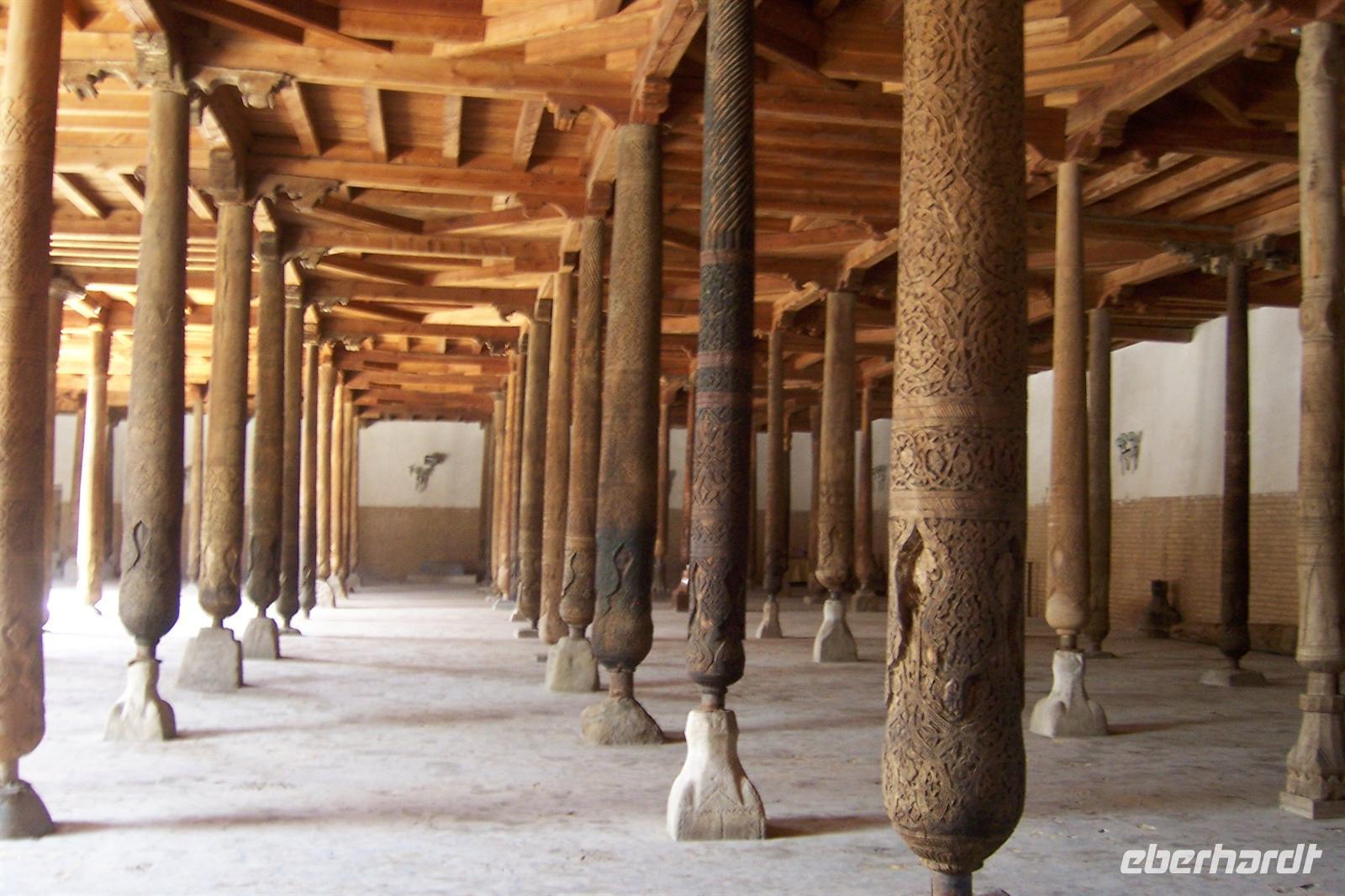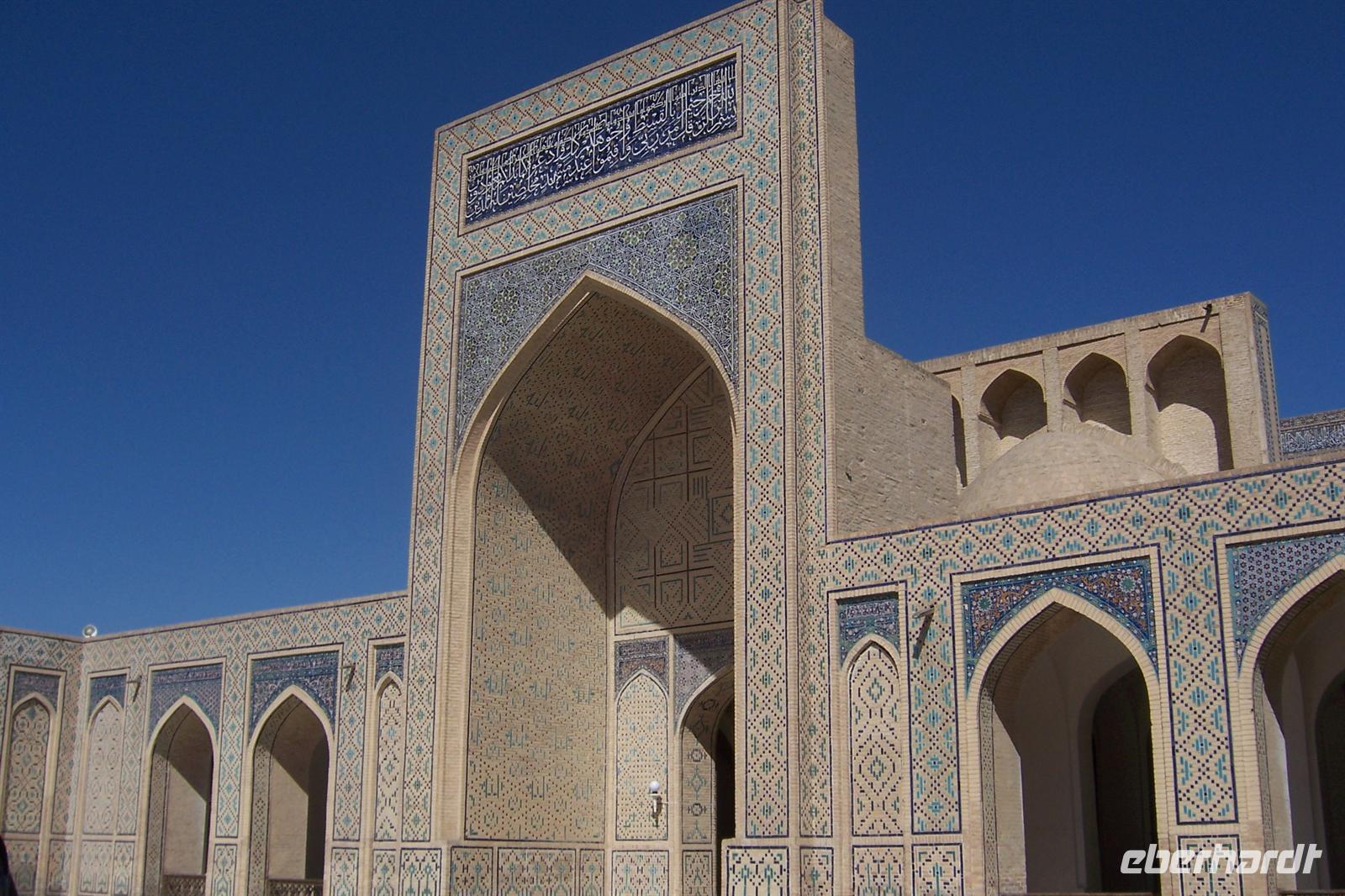 Nach einem kurzen Stopp an der Medrese Amin Chan bummeln wir durch die Gassen und Zika erklärt uns die zauberhaften Majolika-Muster und die Geschichte der Stadt. Wir laufen zum Tash Hauli-Palast. Die wunderschön verzierten Kacheln sind mit typisch choresmischen Ornamenten verziert. Wir sehen die Wohnräume des Chans uns seiner vier Frauen. Danach ist Mittagszeit und wir genießen ein schmackhaftes Mahl bei einer usbekischen Familie. Weiter schlendern wir durch die Innenstadt und erreichen das Pahlavon-Maxmud-Mausoleum. In dieses kommen zahlreiche Pilger und auch Brautpaare um zu beten. Wir haben Glück, dass genau während unseres Besuchs auch ein Brautpaar kommt und wir sehen können, welche Bräuche es gibt. Wir verfolgen das Gebet des Imams und sehen das Mausoleum. Weiter gehen wir zur Islom-Xo´ja-Medrese und besichtigen das Stadtmuseum. Durch die Gassen der Stadt erreichen wir die Djuma-Moschee, die von außen nüchtern aussieht, im Inneren aber einen tolle Säulenhalle mit geschnitzten Holzsäulen beherbergt, was ihr auch den Namen „Cordoba des Ostens“ brachte. Nun sind wir langsam auch aufgrund der hohen Temperaturen schon etwas fußlahm, werden aber zum Abschluss mit einem tollen Ausblick belohnt. Kox´na Ark, die Zitadelle bietet ein schönen Blick über die Kuppeln der Stadt.