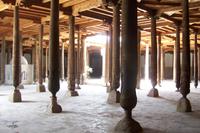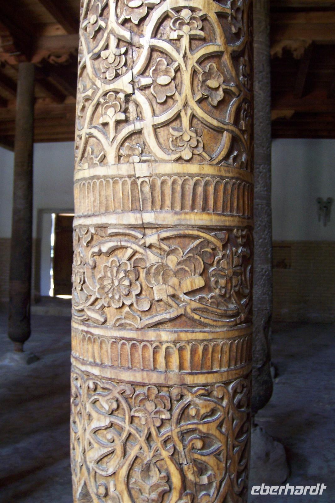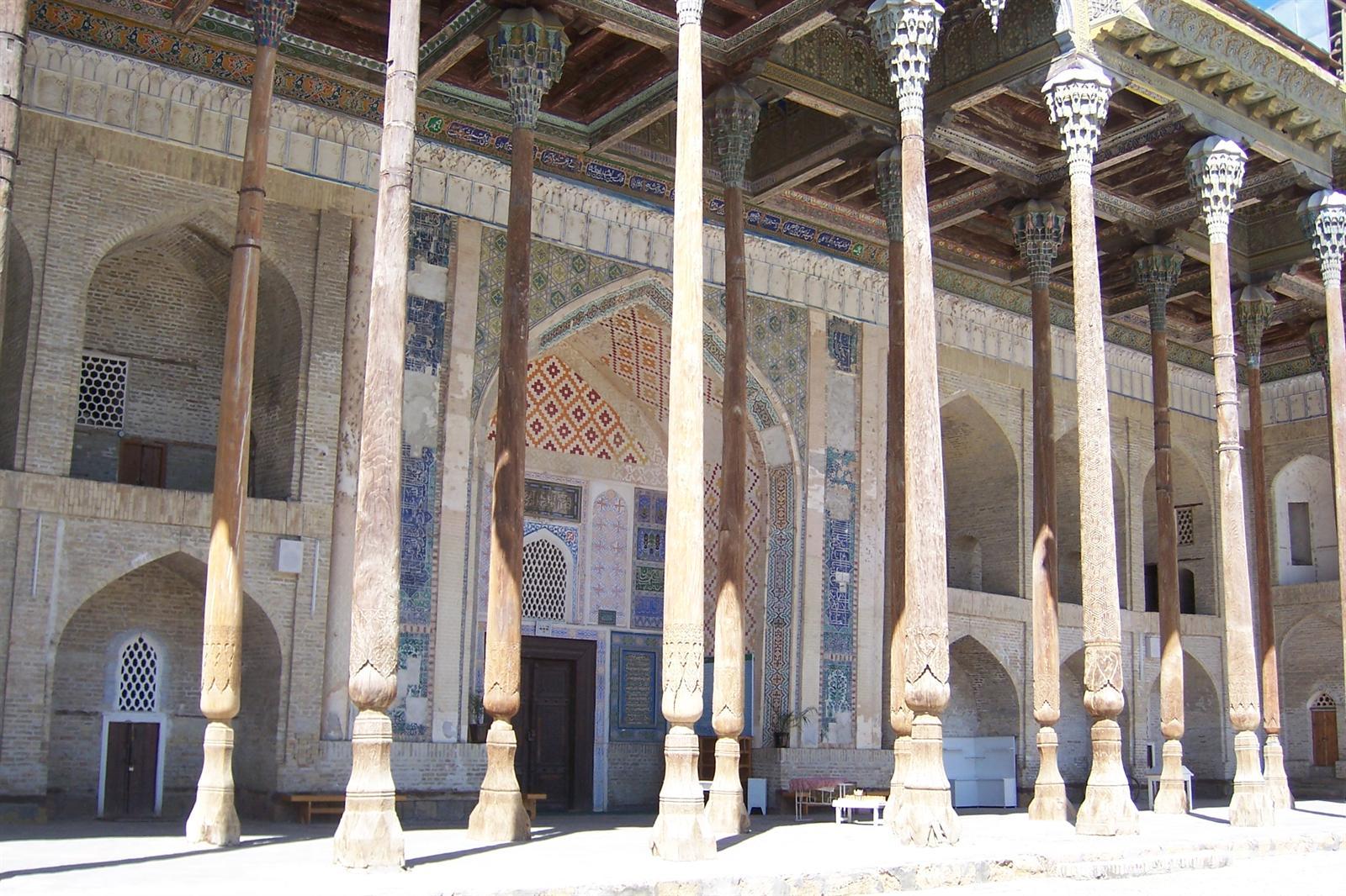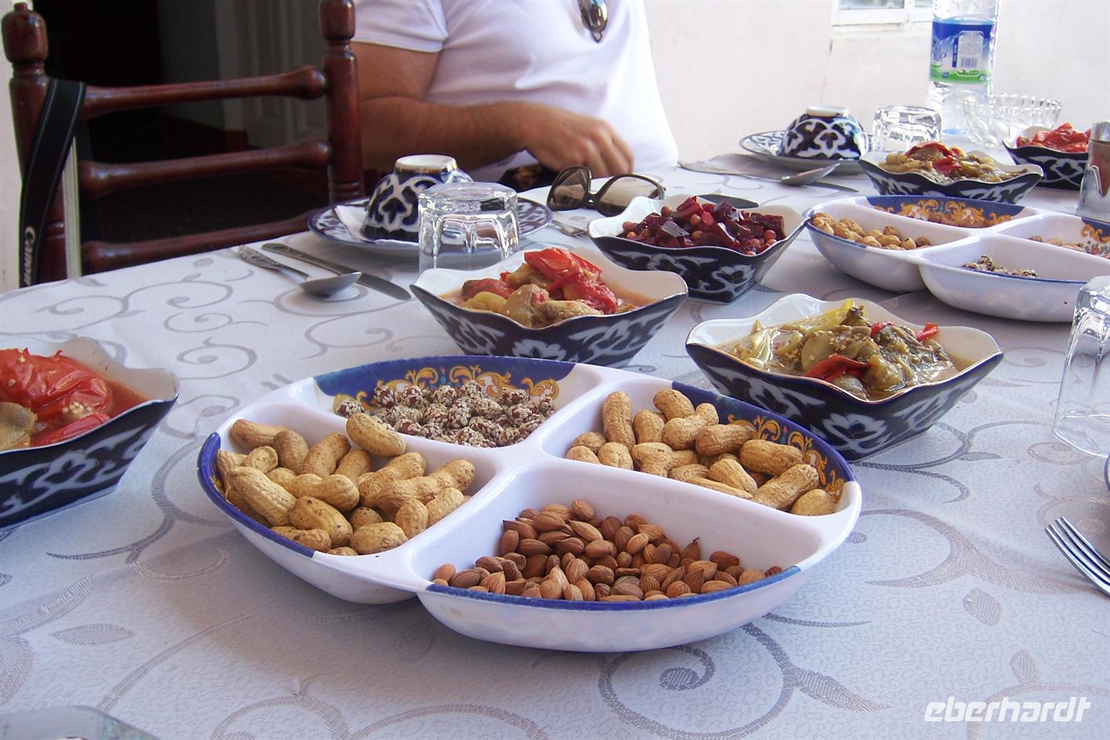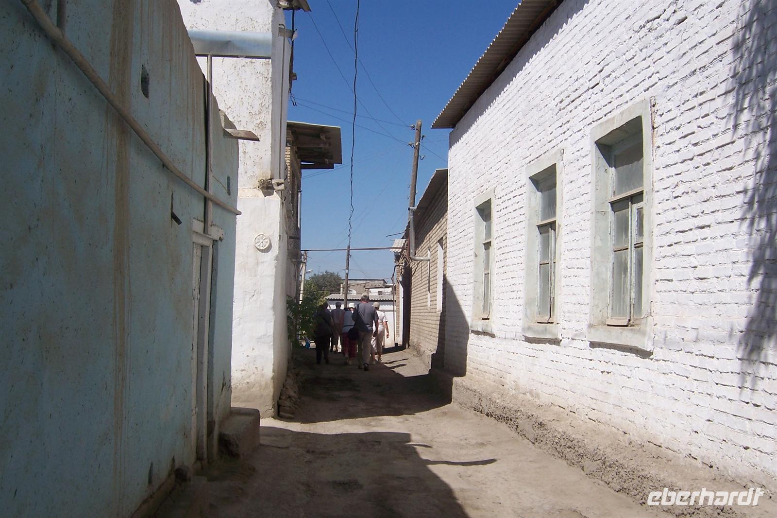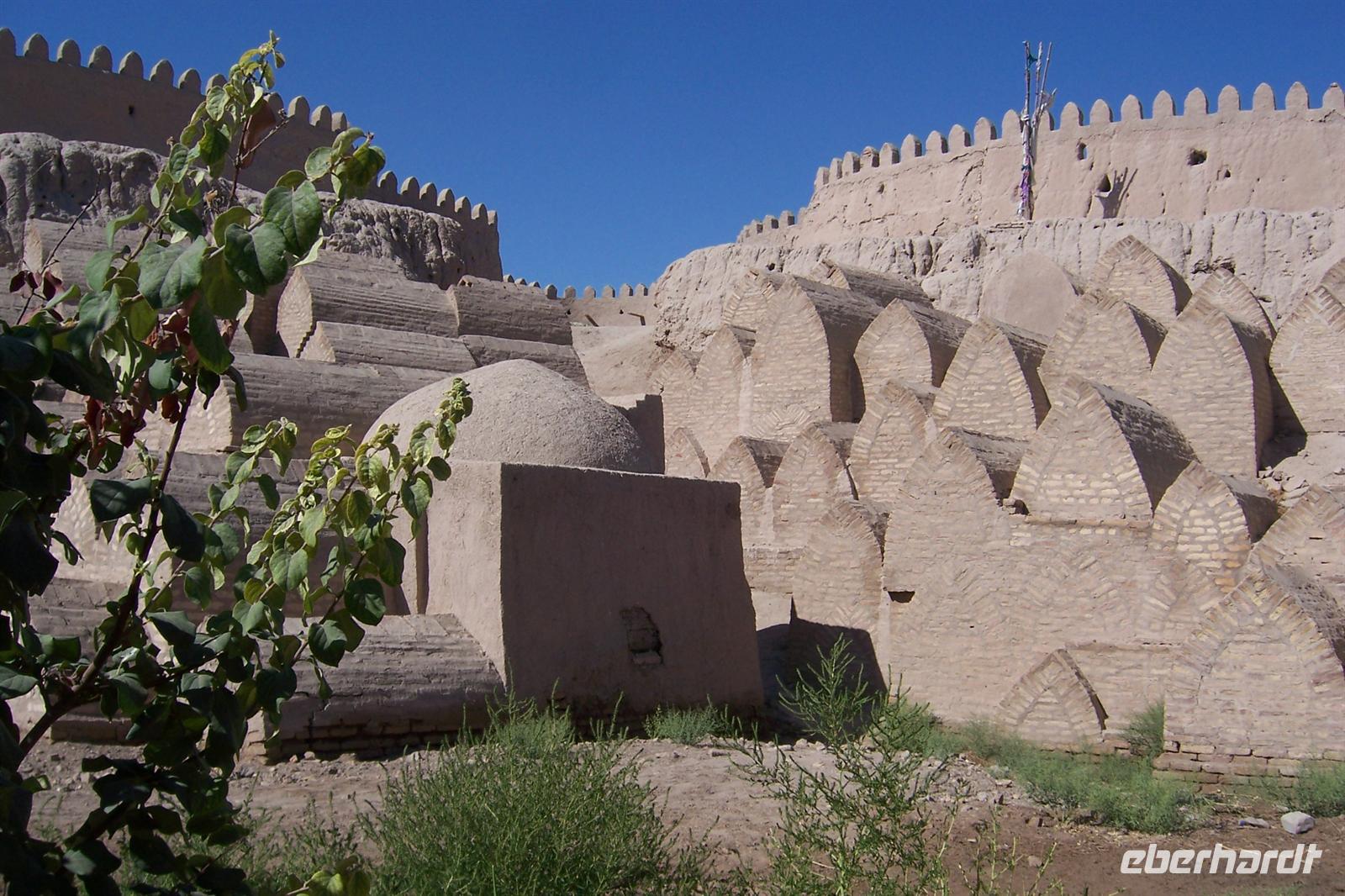 Nach einem kurzen Stopp an der Medrese Amin Chan bummeln wir durch die Gassen und Zika erklärt uns die zauberhaften Majolika-Muster und die Geschichte der Stadt. Wir laufen zum Tash Hauli-Palast. Die wunderschön verzierten Kacheln sind mit typisch choresmischen Ornamenten verziert. Wir sehen die Wohnräume des Chans uns seiner vier Frauen. Danach ist Mittagszeit und wir genießen ein schmackhaftes Mahl bei einer usbekischen Familie. Weiter schlendern wir durch die Innenstadt und erreichen das Pahlavon-Maxmud-Mausoleum. In dieses kommen zahlreiche Pilger und auch Brautpaare um zu beten. Wir haben Glück, dass genau während unseres Besuchs auch ein Brautpaar kommt und wir sehen können, welche Bräuche es gibt. Wir verfolgen das Gebet des Imams und sehen das Mausoleum. Weiter gehen wir zur Islom-Xo´ja-Medrese und besichtigen das Stadtmuseum. Durch die Gassen der Stadt erreichen wir die Djuma-Moschee, die von außen nüchtern aussieht, im Inneren aber einen tolle Säulenhalle mit geschnitzten Holzsäulen beherbergt, was ihr auch den Namen „Cordoba des Ostens“ brachte. Nun sind wir langsam auch aufgrund der hohen Temperaturen schon etwas fußlahm, werden aber zum Abschluss mit einem tollen Ausblick belohnt. Kox´na Ark, die Zitadelle bietet ein schönen Blick über die Kuppeln der Stadt.