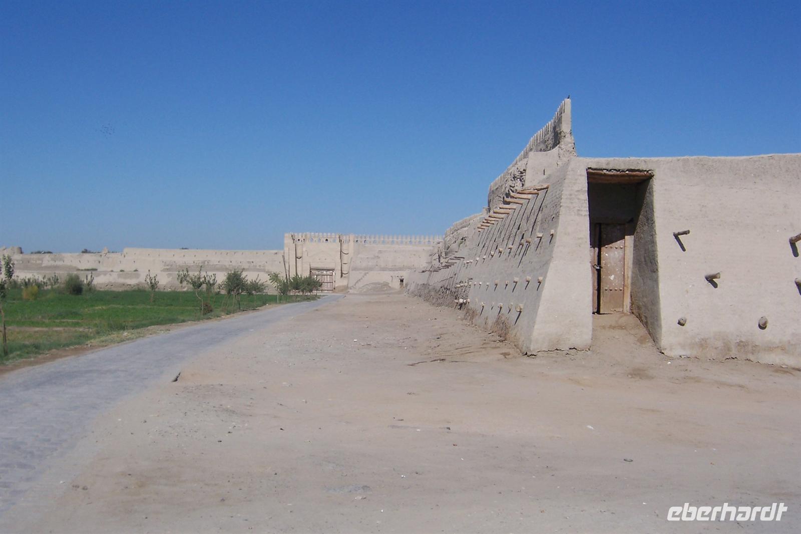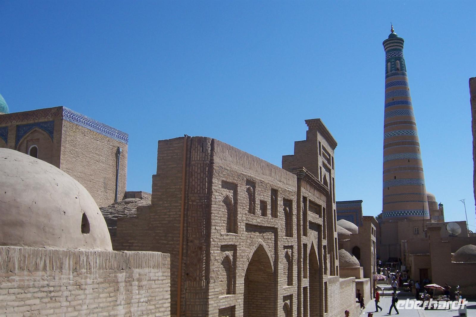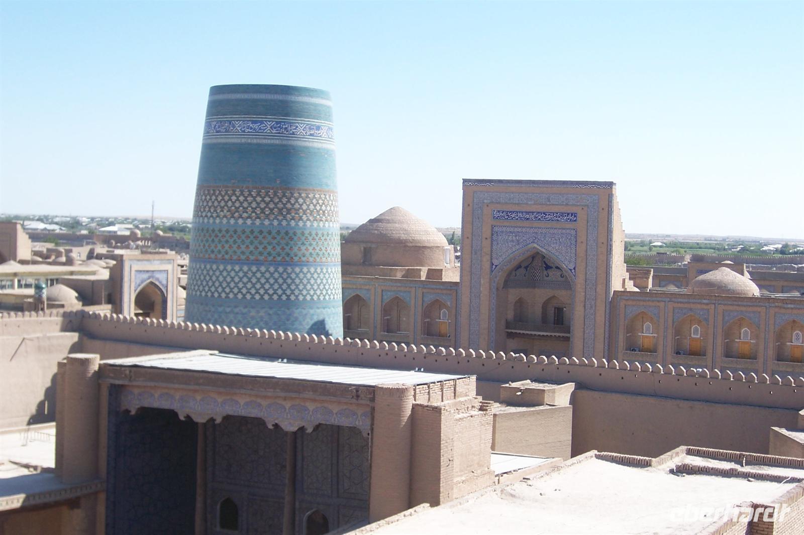 Den Nationalfeiertag beginnen wir sehr früh. Dennoch erhalten wir ein Frühstück um Hotel und fliegen am Morgen nach Urgentsch. Eine halbe Fahrtstunde später kommen wir in unserem Hotel in Chiva an. Nach einer Erfrischungspause im Hotel beginnen wir unser Besichtigungsprogramm in Chiva. Bis zum Südtor sind es nur einige Schritte von Hotel entfernt und entlang der Stadtmauer laufen wir bis zum Westtor. Schon wenig später erblicken wir das Kalta Minor (das kurze Minarett).