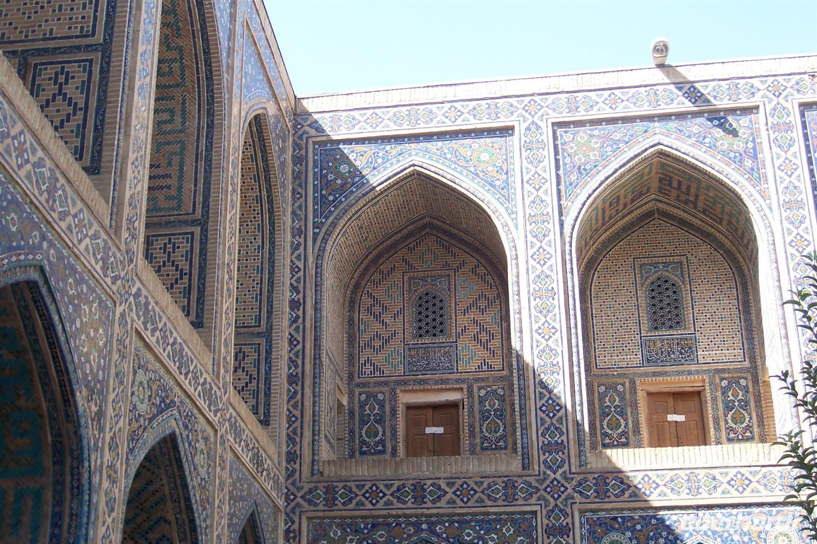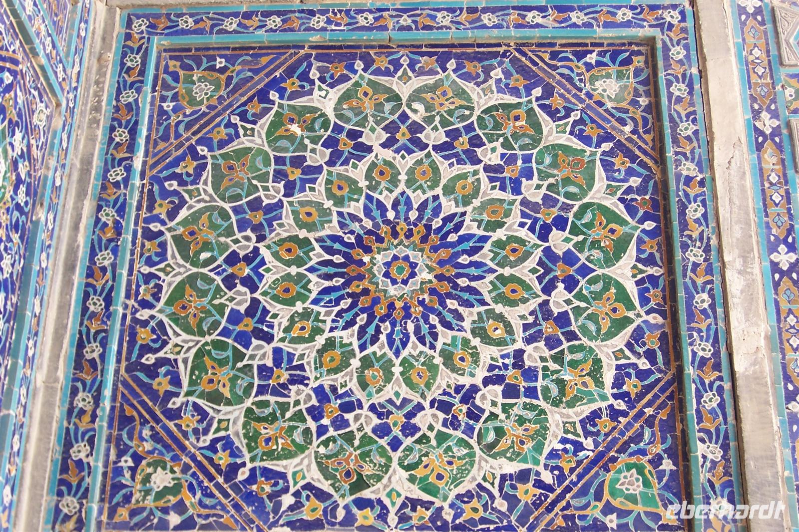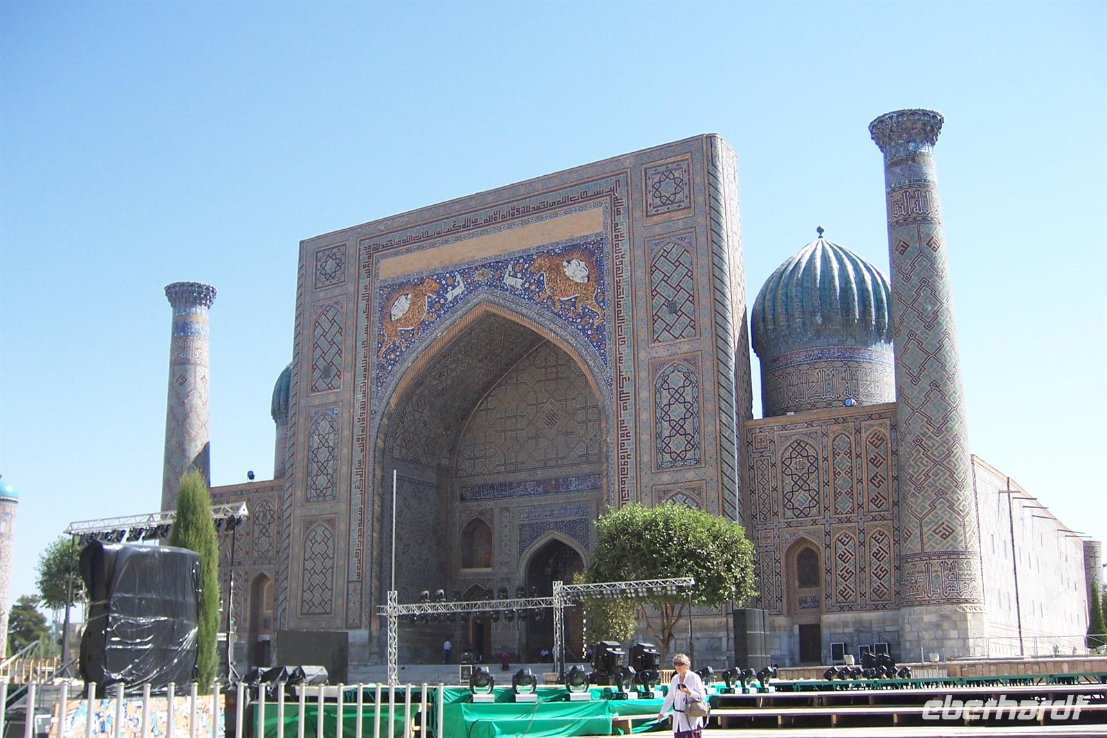 Wir freuen uns bereits auf den bevorstehenden Stadtrundgang, bei dem wir nun endlich das prächtige Ensemble des Registan mit den drei berühmten Medresen sehen wollen. Doch zuerst besichtigen wir das palastartige Mausoleum Timurs - Gur-Emir. Beeindruckend sind das Hauptportal sowie die leuchtend blaue Melonen-Kuppel, die wie eine Zitronenpresse in der Sonne leuchtet. Im Inneren des Mausoleums beeindrucken das Licht reflektierende Alabasterfliesen, vergoldete Pappe, ein Schriftenbad aus Jaspis sowie Wandflächen voll mit geometrischen Mustern. Am Registan angekommen, versperren leider etliche Scheinwerfer und Kabel einer Bühne die tolle Sicht. Wir suchen nach brauchbaren Fotomotiven. Aber sicher wird es im Inneren weitere schöne Motive geben! Zuerst besichtigen wir die Medrese Ulug Bek. Sie gehört zu den ältesten Medresen Zentralasiens. Sie ist passend zu den Interessen Ulug Begs mit Sternmotiven verziert. In ihr lebten ca. 100 Studenten, die in Islamkunde und anderen Disziplinen unterrichtet wurden. Einer Legende nach soll sogar Ulug Beg selbst sein Lieblingsfach Astronomie unterrichtet haben. In der Medrese sehen wir verschiedene Handwerkskünste und Zika zeigt uns die typische Hochzeitskleidung. In einer Handwerksstube werden nach traditionellem Vorbild Mosaikkacheln hergestellt. Danach