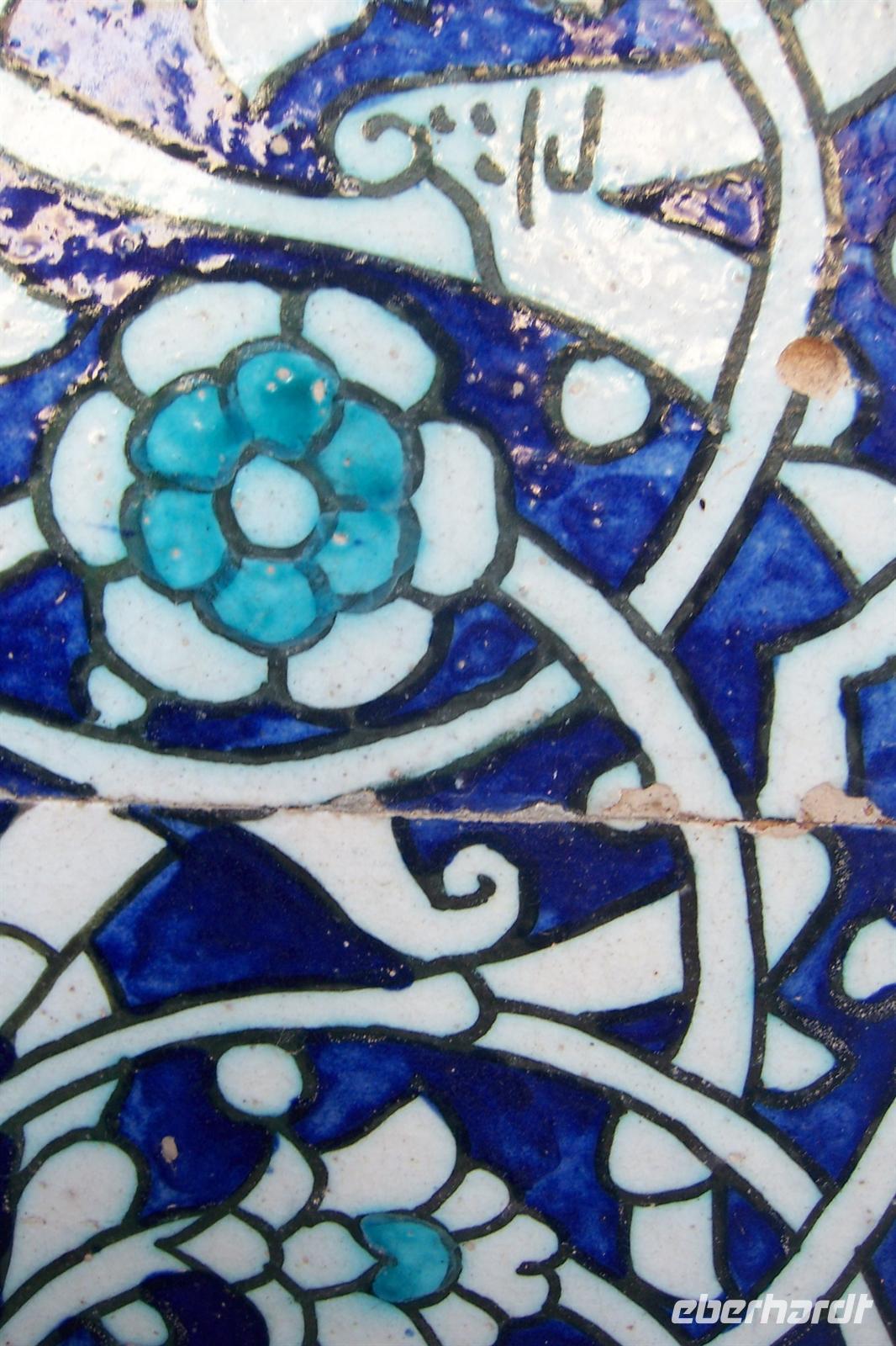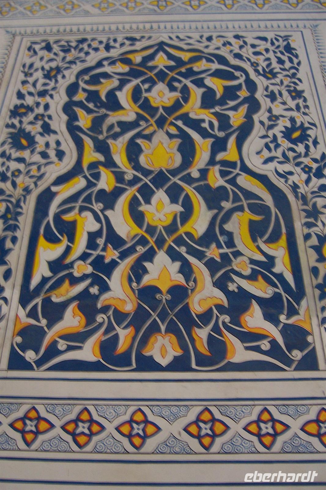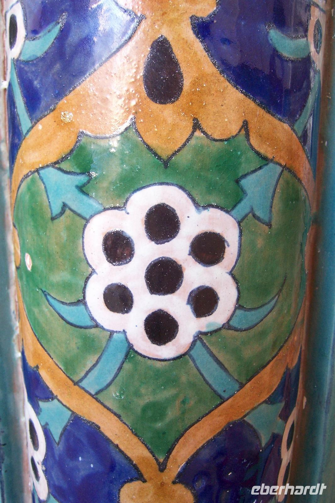 Wir freuen uns bereits auf den bevorstehenden Stadtrundgang, bei dem wir nun endlich das prächtige Ensemble des Registan mit den drei berühmten Medresen sehen wollen. Doch zuerst besichtigen wir das palastartige Mausoleum Timurs - Gur-Emir. Beeindruckend sind das Hauptportal sowie die leuchtend blaue Melonen-Kuppel, die wie eine Zitronenpresse in der Sonne leuchtet. Im Inneren des Mausoleums beeindrucken das Licht reflektierende Alabasterfliesen, vergoldete Pappe, ein Schriftenbad aus Jaspis sowie Wandflächen voll mit geometrischen Mustern. Am Registan angekommen, versperren leider etliche Scheinwerfer und Kabel einer Bühne die tolle Sicht. Wir suchen nach brauchbaren Fotomotiven. Aber sicher wird es im Inneren weitere schöne Motive geben! Zuerst besichtigen wir die Medrese Ulug Bek. Sie gehört zu den ältesten Medresen Zentralasiens. Sie ist passend zu den Interessen Ulug Begs mit Sternmotiven verziert. In ihr lebten ca. 100 Studenten, die in Islamkunde und anderen Disziplinen unterrichtet wurden. Einer Legende nach soll sogar Ulug Beg selbst sein Lieblingsfach Astronomie unterrichtet haben. In der Medrese sehen wir verschiedene Handwerkskünste und Zika zeigt uns die typische Hochzeitskleidung. In einer Handwerksstube werden nach traditionellem Vorbild Mosaikkacheln hergestellt. Danach