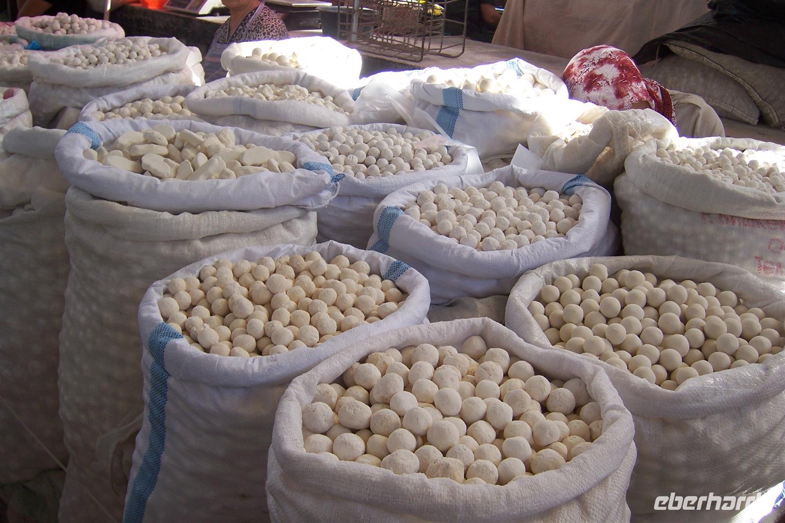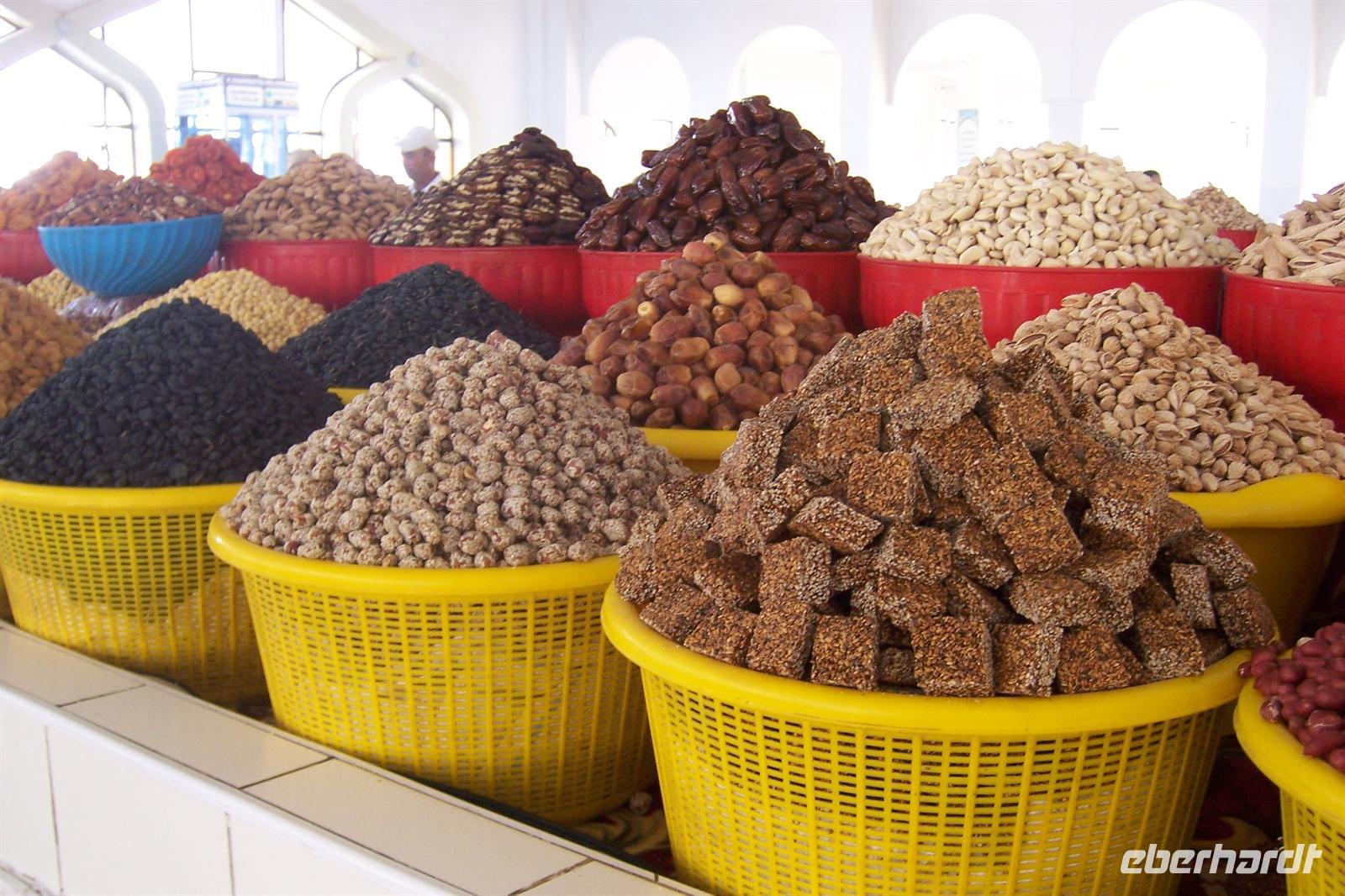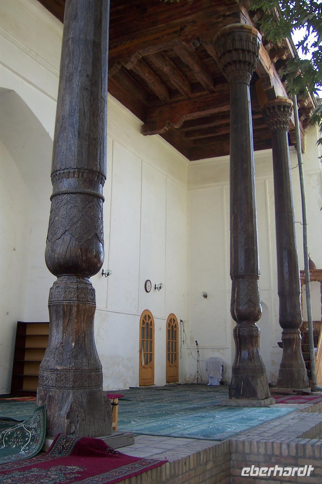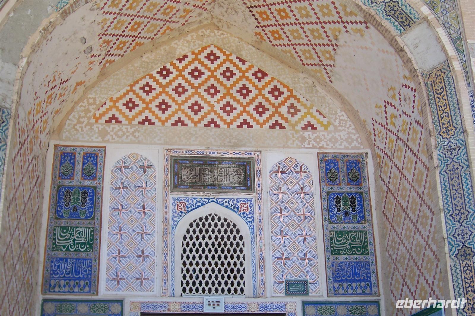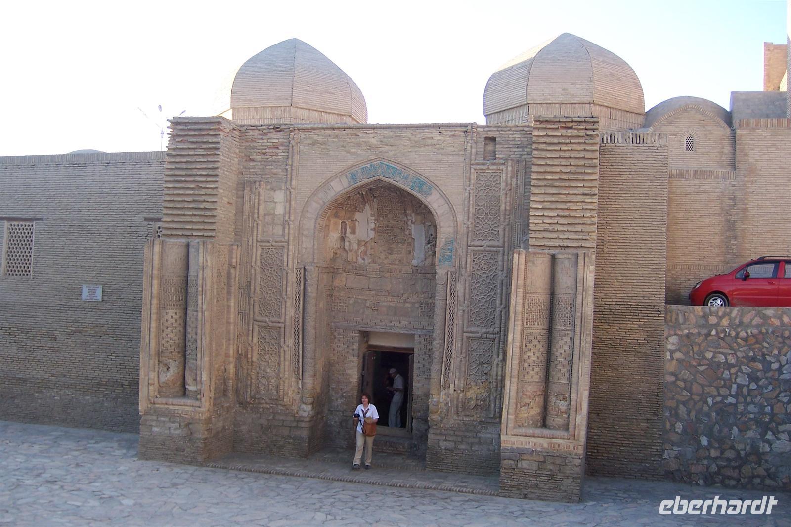 Seine einzigartige Dekoration ist ein Meisterwerk der frühen islamischen Architektur. Alle vier Fassaden aus Backstein sind identisch. Einer Legende nach soll die mehrfache Umrundung des Mausoleums Glück bringen, was einige von uns nun testen werden. Durch den Park bummeln wir weiter zur alten Stadtmauer und die Markthallen. Frisches Obst und Gemüse sowie frische Backwaren werden angeboten und wir kaufen frische Feigen, Nüsse und Aprikosenkerne zum Knappern. Danach erreichen wir den Hiobsbrunnen. Die Kuppel des Gebäudes erinnert an die für Choresm typische Bauweise. Danach erreichen wir die Bolo Hauz-Medrese, deren