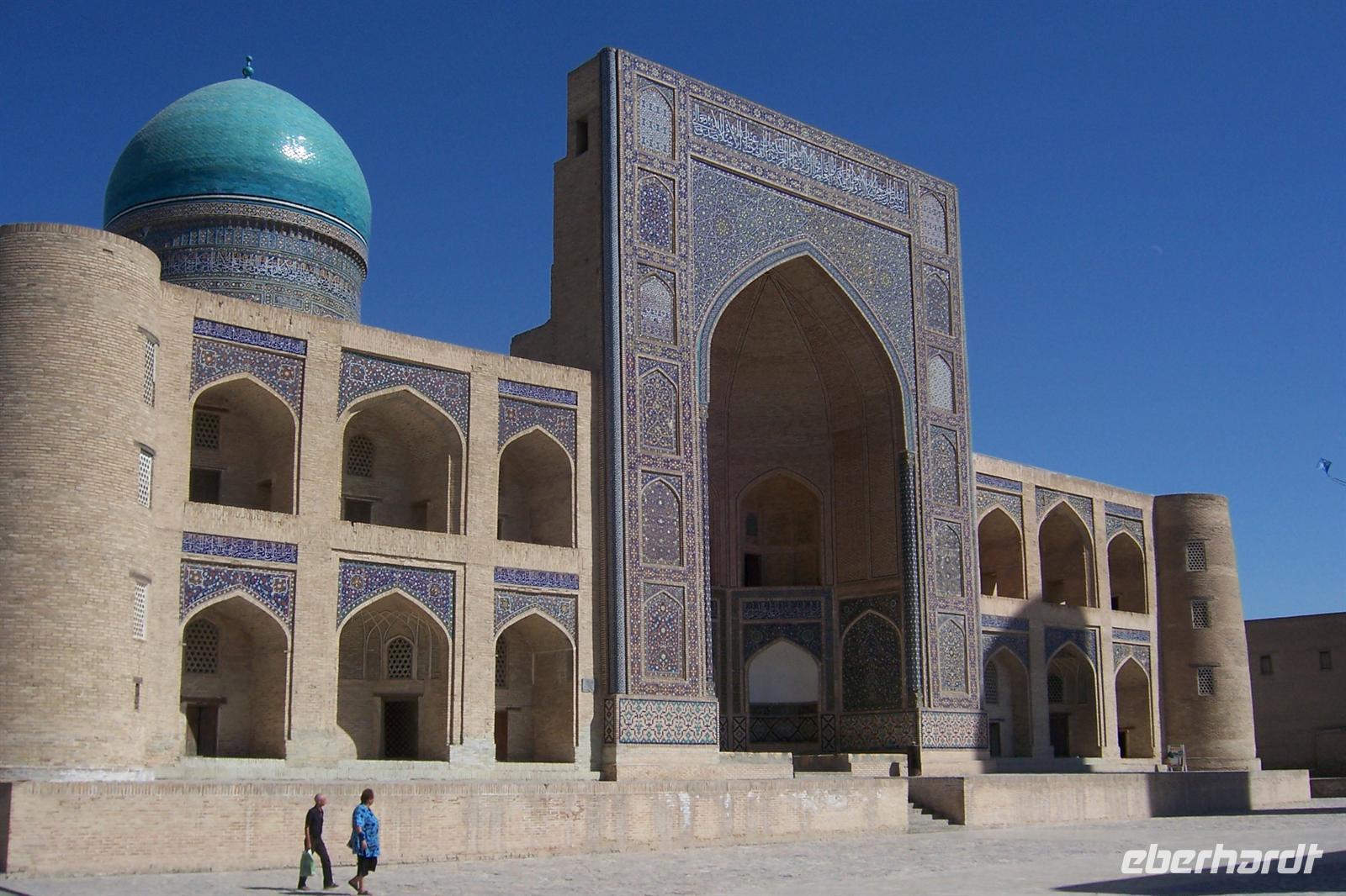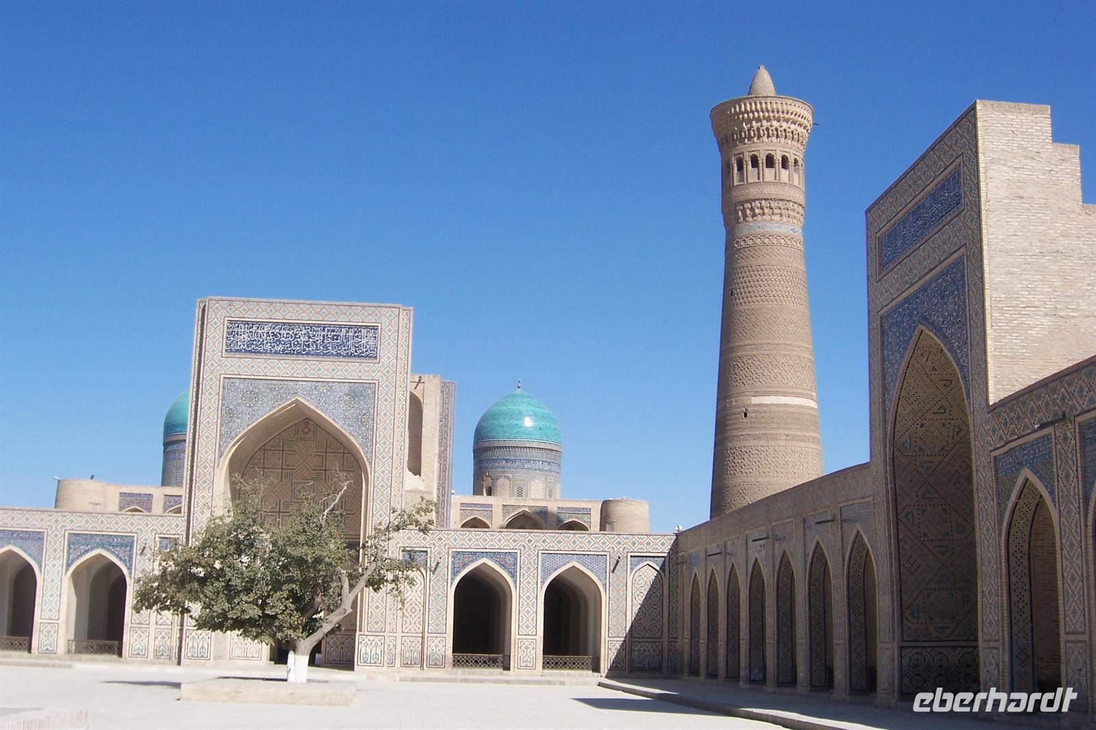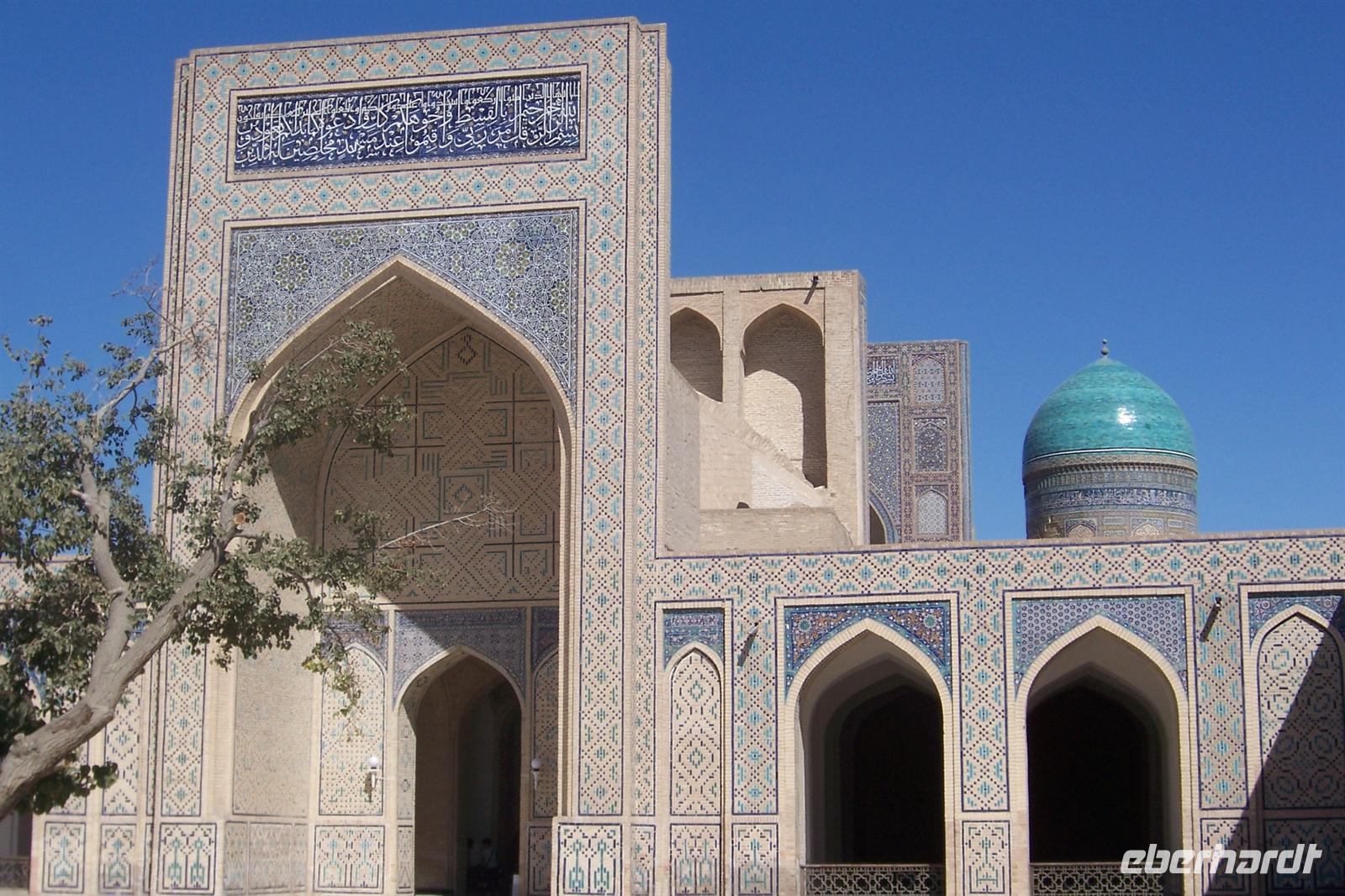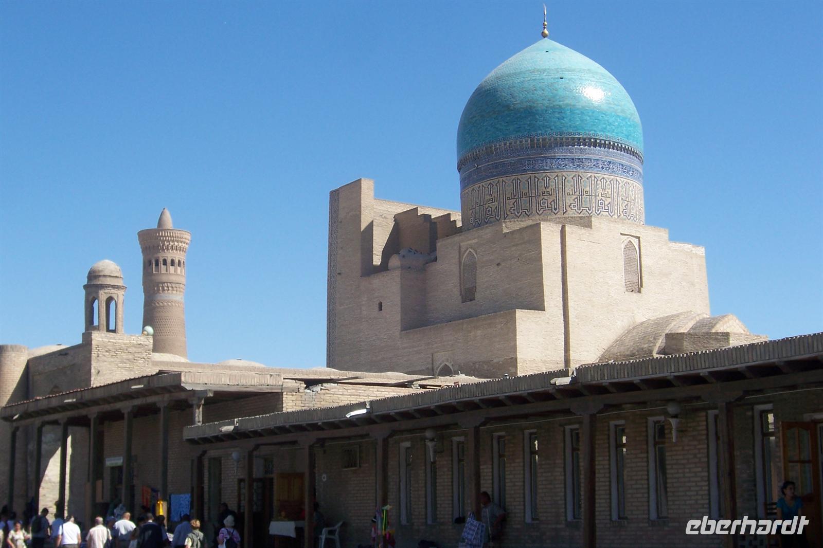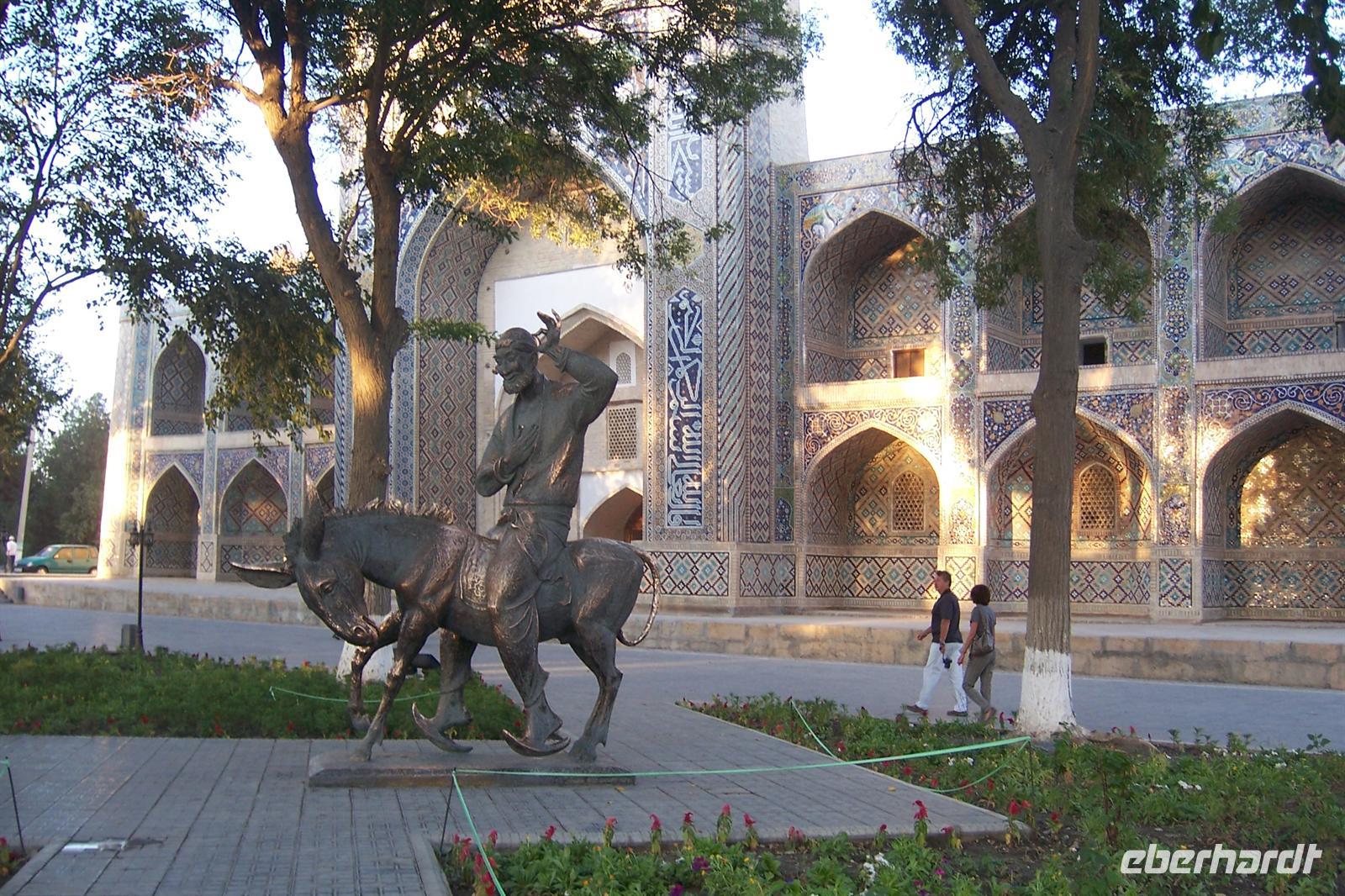 bunte Kacheln und Holzornamente wir bestaunen. Gleich gegenüber erreichen wir am Registan den Ark. Die Zitadelle war mehrfach zerstört wurden und wurde im 7. Jhd. Wieder aufgebaut. Wir besichtigen die Zitadelle mit deren Museum und sehen auch hier in den Höfen wieder zahlreiche Händler. Besonders eine ältere Dame mit sehr guter deutscher Sprache fasziniert uns und sie freut sich sehr über die deutschen Gäste. Ihre hervorragenden Deutschkenntnisse hat sie als Lehrerin sammeln können und war auch bei einem Studienaufenthalt in Chemnitz. Weiter erwirbt der Großteil unserer Gruppe wunderschöne Kaligrafien. Unser Vormittagsprogramm ist beendet und wir essen zu Mittag vom Buffet am Labi-Hauz. Danach geht es etwas außerhalb zur Moschee Chor Minor (vier Minarette). Ihre Bauweise weicht vom traditionellen Baustil ab und orientiert sich am indischen Taj Mahal. So wurde sie für Buchara zum Wahrzeichen. Zurück im Zentrum laufen wir zur prächtigen Fassade der Medrese Abdulasiz Chan. Die türkisfarbenen Kuppeln leuchten in der Sonne. Gemeinsam mit dem Minarett Kalon sowie der Medrese Ulug Beg ergibt sie fantastische Fotomotive, die sich auch bei der Besichtigung der Medrese Ulug Beg fortsetzen. Fast jeder Winkel bietet neue, schöne Motive und das Auge kann sich an der fast märchenhaften Farbigkeit der Kacheln und Kuppeln kaum satt sehen. Weiter spazieren wir zu den Handelsgewölben der Mützenmacher und Seidenhändler. Schnell sind einige Souvenirs wie Seidenschals, Gewürztee oder Scheren erstanden und nach dem kurzen Besuch eines Hammam erreichen wir unser Hotel. Hier kann ein Jeder ausruhen, etwas trinken oder den erfrischenden Pool testen. Zum Fuß gehen wir am Abend vorbei an der unterirdischen Moschee sowie den ehemaligen Karawansereien zur Medrese Nodir Devon Begi. Das Denkmal für Hodscha Nasreddin wird zum vielfachen und lustigen Fotomotiv und wir verpassen fast den Beginn der Abendvorstellung. Unsere Tische direkt in der Mitte gewähren uns einen tollen Blick auf die Folkloreshow und Modenschau, während wir leckere Gerichte zu uns nehmen. Wir lassen den lauen Sommerabend bei Bier und Wein genussvoll ausklingen.