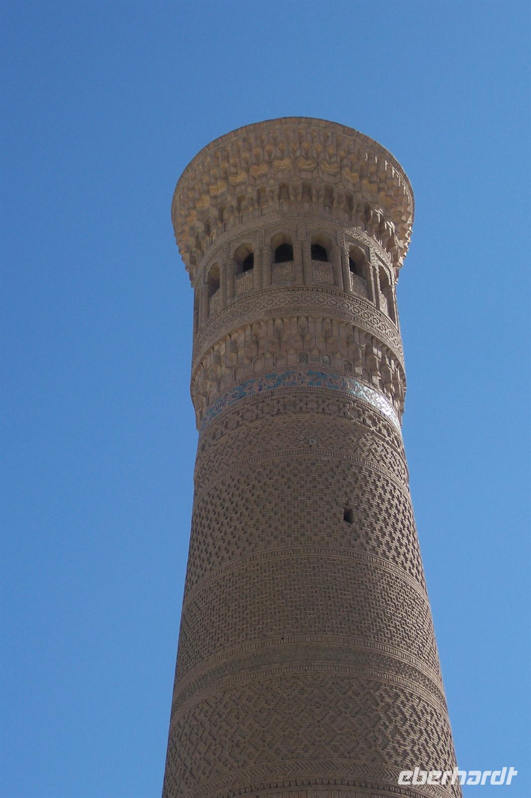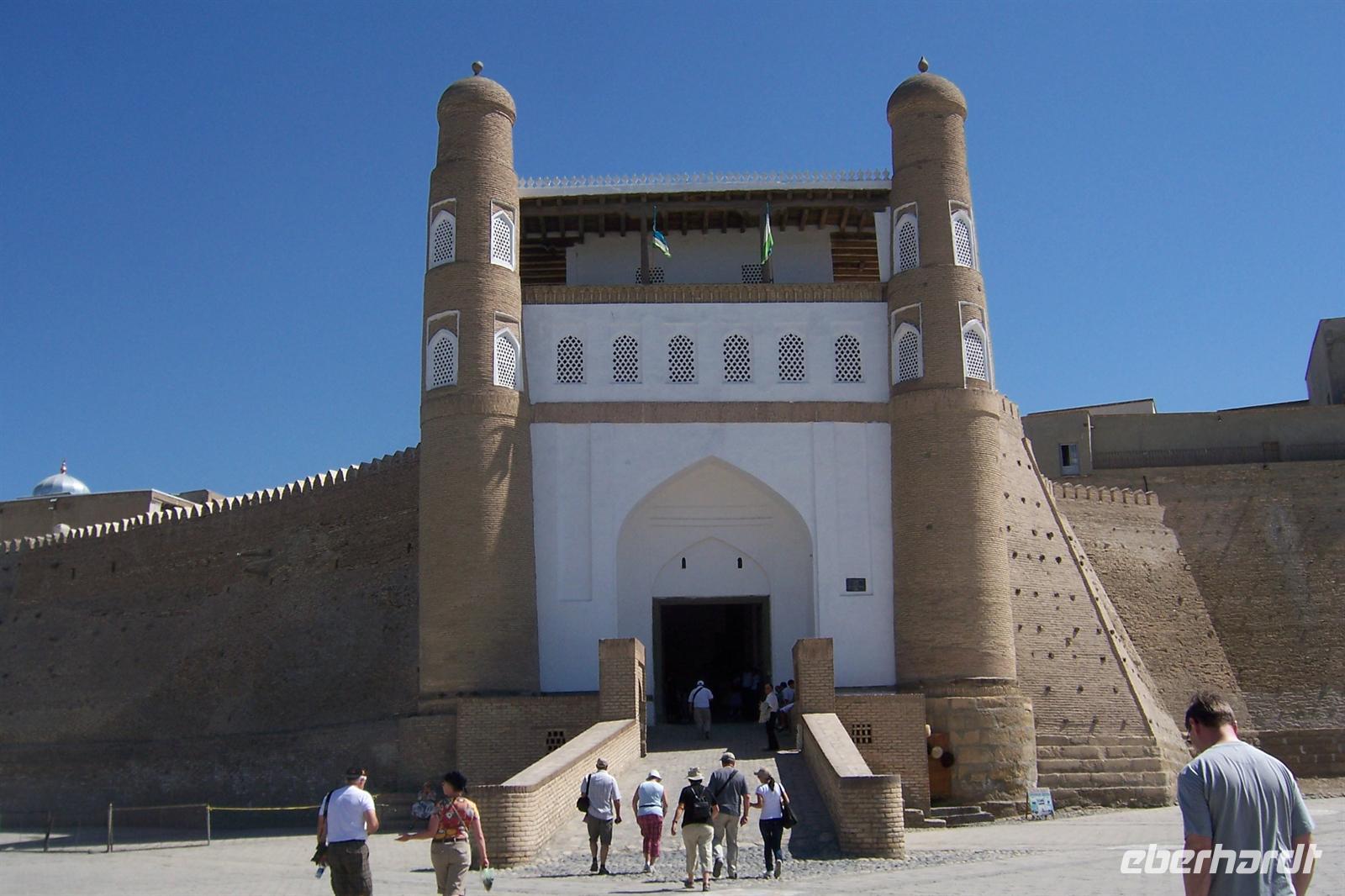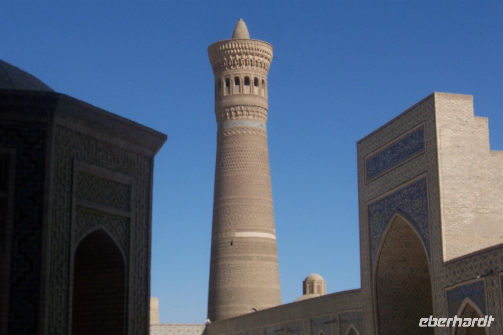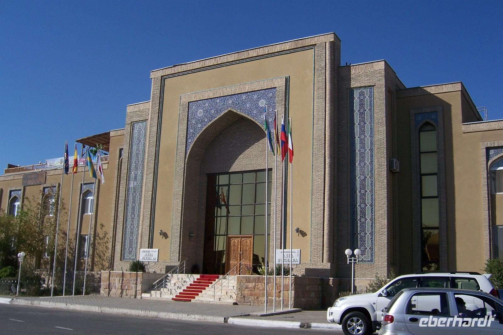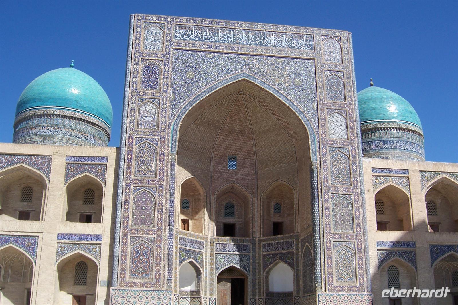 bunte Kacheln und Holzornamente wir bestaunen. Gleich gegenüber erreichen wir am Registan den Ark. Die Zitadelle war mehrfach zerstört wurden und wurde im 7. Jhd. Wieder aufgebaut. Wir besichtigen die Zitadelle mit deren Museum und sehen auch hier in den Höfen wieder zahlreiche Händler. Besonders eine ältere Dame mit sehr guter deutscher Sprache fasziniert uns und sie freut sich sehr über die deutschen Gäste. Ihre hervorragenden Deutschkenntnisse hat sie als Lehrerin sammeln können und war auch bei einem Studienaufenthalt in Chemnitz. Weiter erwirbt der Großteil unserer Gruppe wunderschöne Kaligrafien. Unser Vormittagsprogramm ist beendet und wir essen zu Mittag vom Buffet am Labi-Hauz. Danach geht es etwas außerhalb zur Moschee Chor Minor (vier Minarette). Ihre Bauweise weicht vom traditionellen Baustil ab und orientiert sich am indischen Taj Mahal. So wurde sie für Buchara zum Wahrzeichen. Zurück im Zentrum laufen wir zur prächtigen Fassade der Medrese Abdulasiz Chan. Die türkisfarbenen Kuppeln leuchten in der Sonne. Gemeinsam mit dem Minarett Kalon sowie der Medrese Ulug Beg ergibt sie fantastische Fotomotive, die sich auch bei der Besichtigung der Medrese Ulug Beg fortsetzen. Fast jeder Winkel bietet neue, schöne Motive und das Auge kann sich an der fast märchenhaften Farbigkeit der Kacheln und Kuppeln kaum satt sehen. Weiter spazieren wir zu den Handelsgewölben der Mützenmacher und Seidenhändler. Schnell sind einige Souvenirs wie Seidenschals, Gewürztee oder Scheren erstanden und nach dem kurzen Besuch eines Hammam erreichen wir unser Hotel. Hier kann ein Jeder ausruhen, etwas trinken oder den erfrischenden Pool testen. Zum Fuß gehen wir am Abend vorbei an der unterirdischen Moschee sowie den ehemaligen Karawansereien zur Medrese Nodir Devon Begi. Das Denkmal für Hodscha Nasreddin wird zum vielfachen und lustigen Fotomotiv und wir verpassen fast den Beginn der Abendvorstellung. Unsere Tische direkt in der Mitte gewähren uns einen tollen Blick auf die Folkloreshow und Modenschau, während wir leckere Gerichte zu uns nehmen. Wir lassen den lauen Sommerabend bei Bier und Wein genussvoll ausklingen.