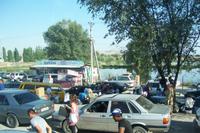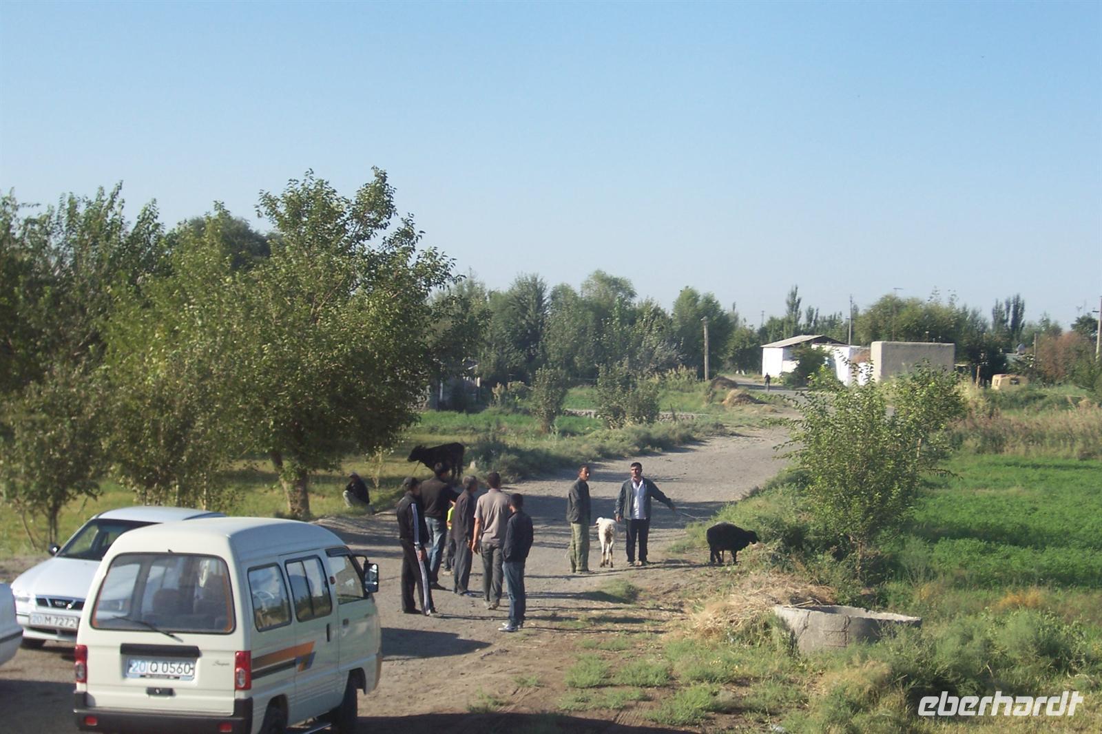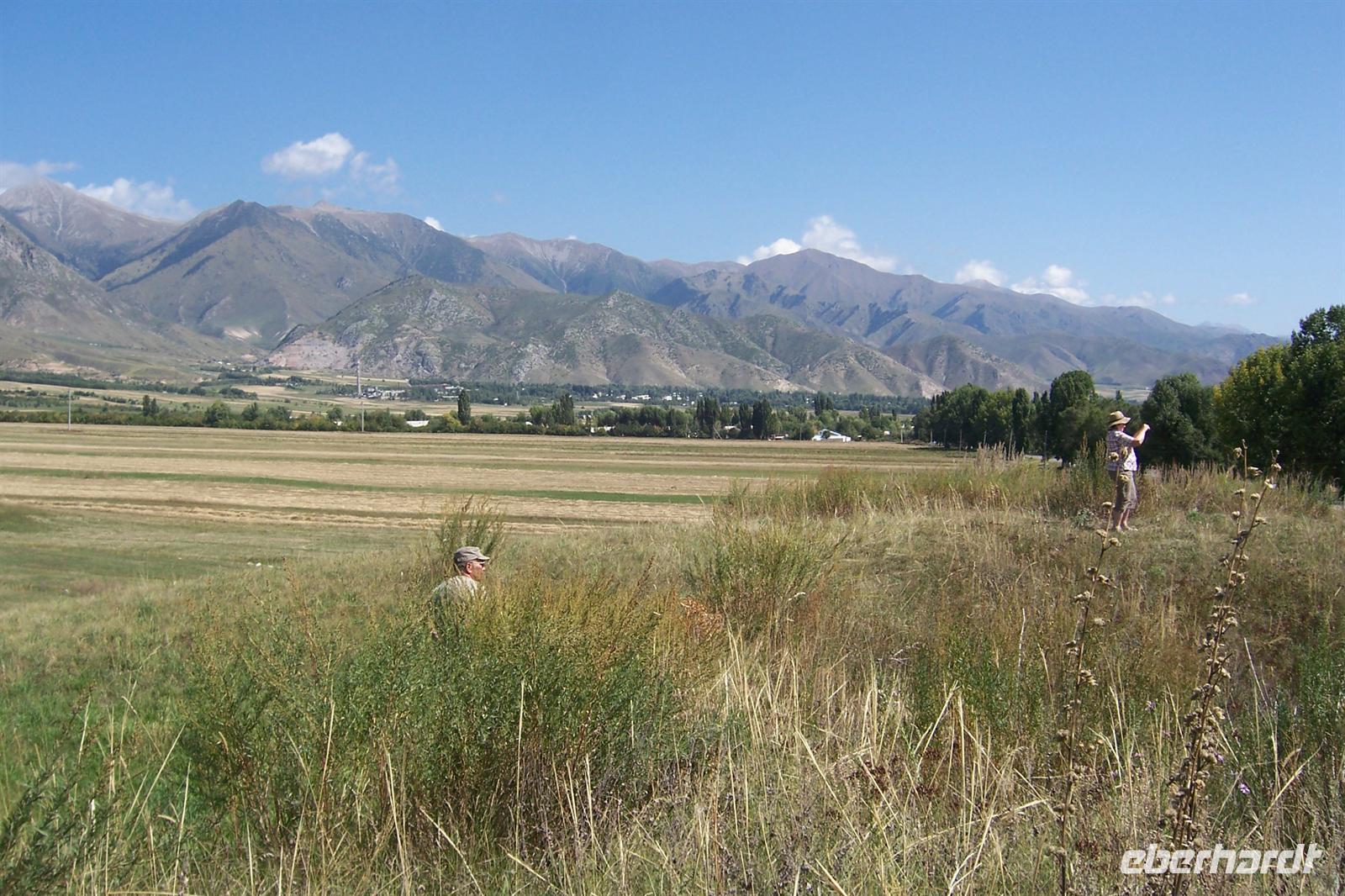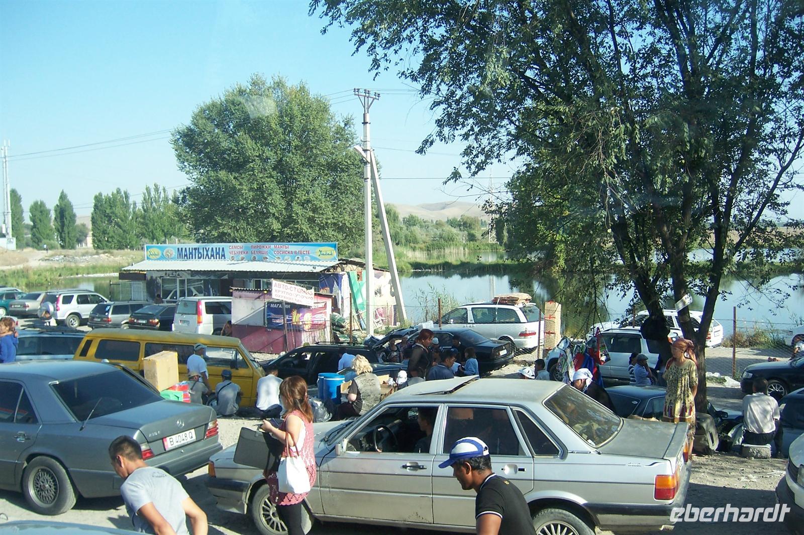 Überall wimmelt es von Menschen, die sich voll bepackt zur anderen Grenzseite bewegen. Nach über zwei Stunden vergeblicher Wartezeit entscheiden wir, per Fuß die Grenze zu passieren. Die Abfertigung auf kirgisischer Seite verläuft relativ unproblematisch und zügig, aber wird sind noch nicht in Kasachstan. Wir steigen wieder in den Bus und beobachten das Treiben um uns herum. Nach weiterer Wartezeit entscheiden wir erneut mit unserem Gepäck auch die kasachische Seite zu erreichen. Der Tumult und fehlende Koordination sind für uns kaum zu fassen, aber wir müssen uns dem herrschenden System unterwerfen. Nach einigem Wortwechsel und der Absicherung unserer Gruppe durch uns selbst, passieren wir auch die kasachische Grenze. Das erneute Abendteuer Grenzübertritt ist nach knapp vier Stunden geschafft.