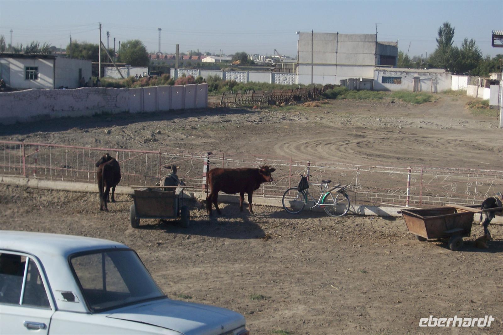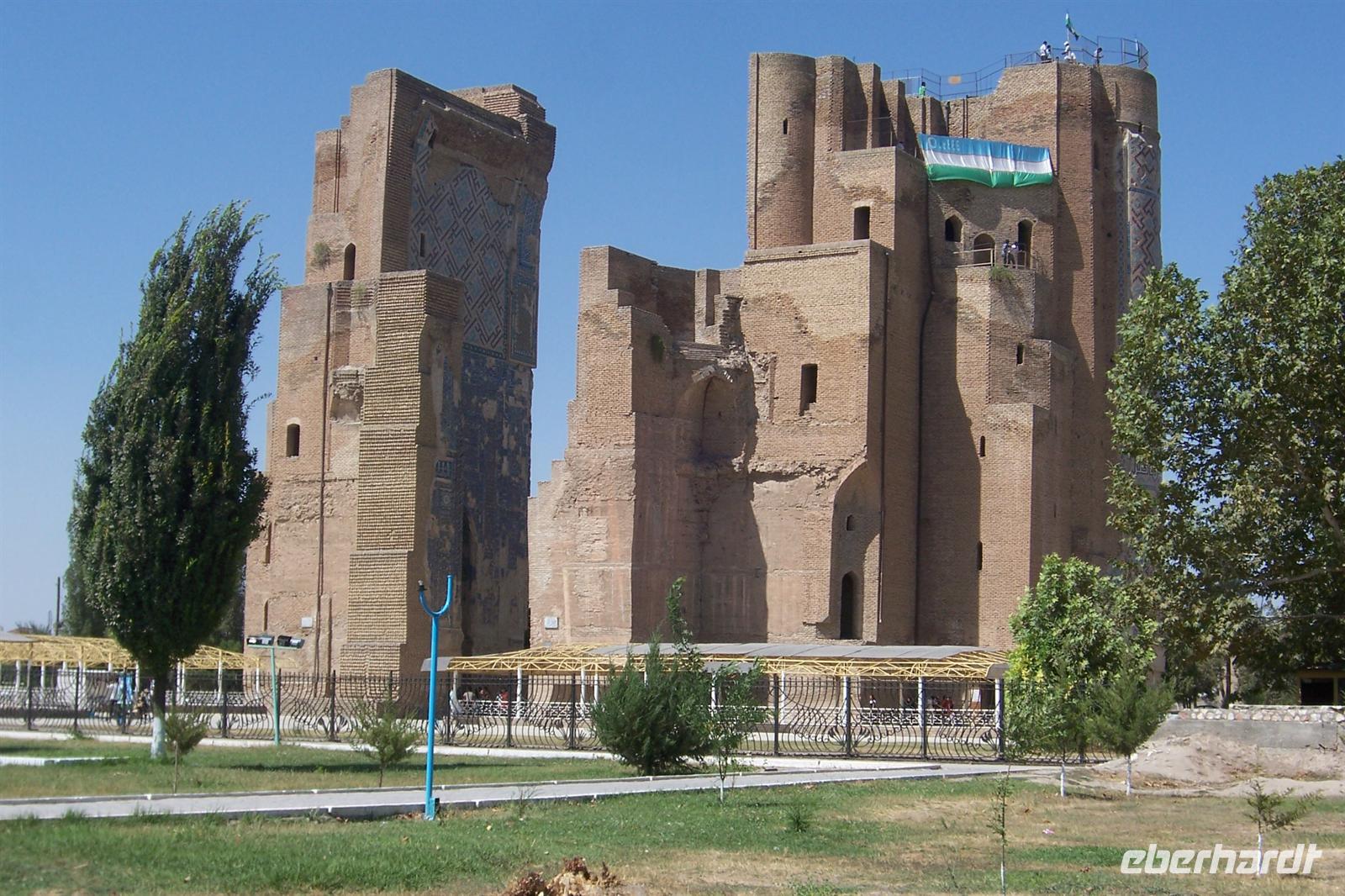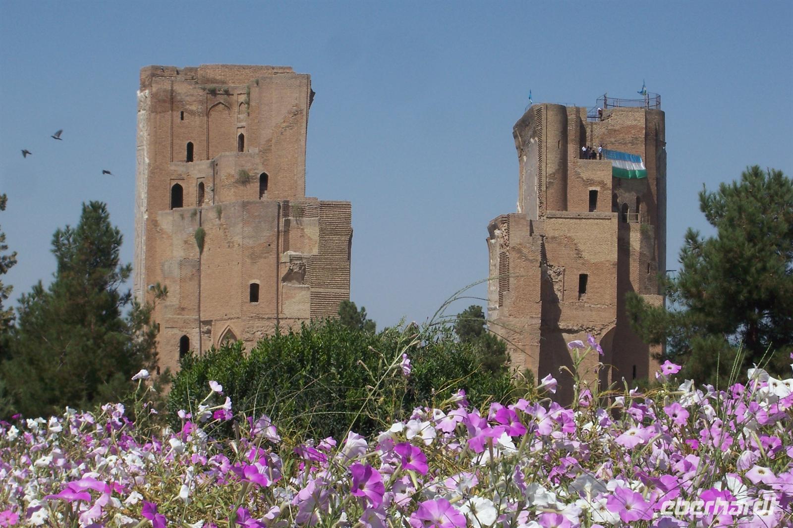 Nach dem stärkenden Frühstück reisen wir einige Stunden weiter durch die Wüste nach Schachrisabs. Die Fahrt ist aufgrund kleiner Dörfer und der Vegetation abwechslungsreicher als die durch die Kizilkumwüste. Unterwegs besuchen wir einen Viehmarkt. So wie wir staunen die Einheimischen über unseren Besuch. Gegen Mittag erreichen wir den großen Platz im Zentrum Schachrisabs. Schon von Weiten sieht man das ehemalige Portal des „Weißen Palastes“.