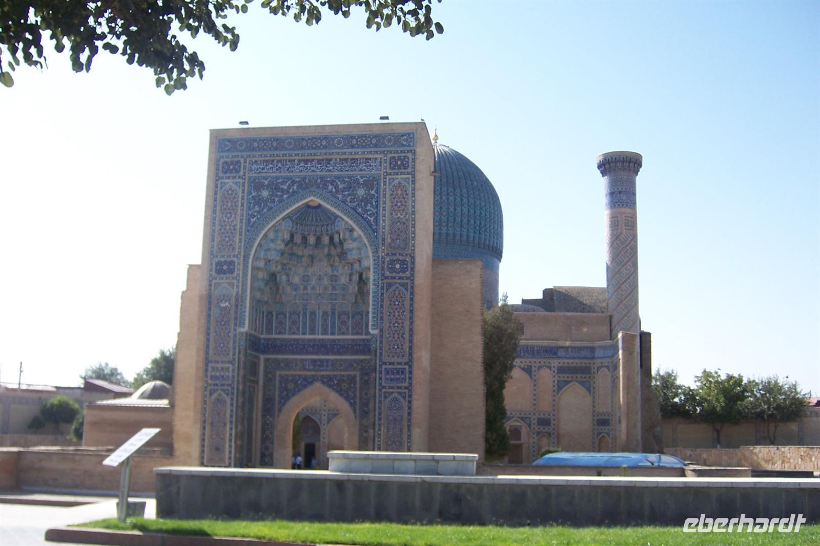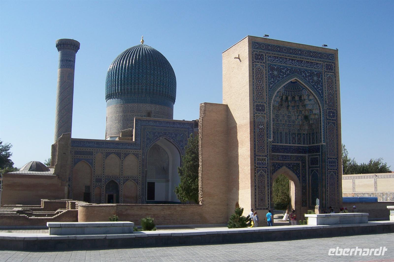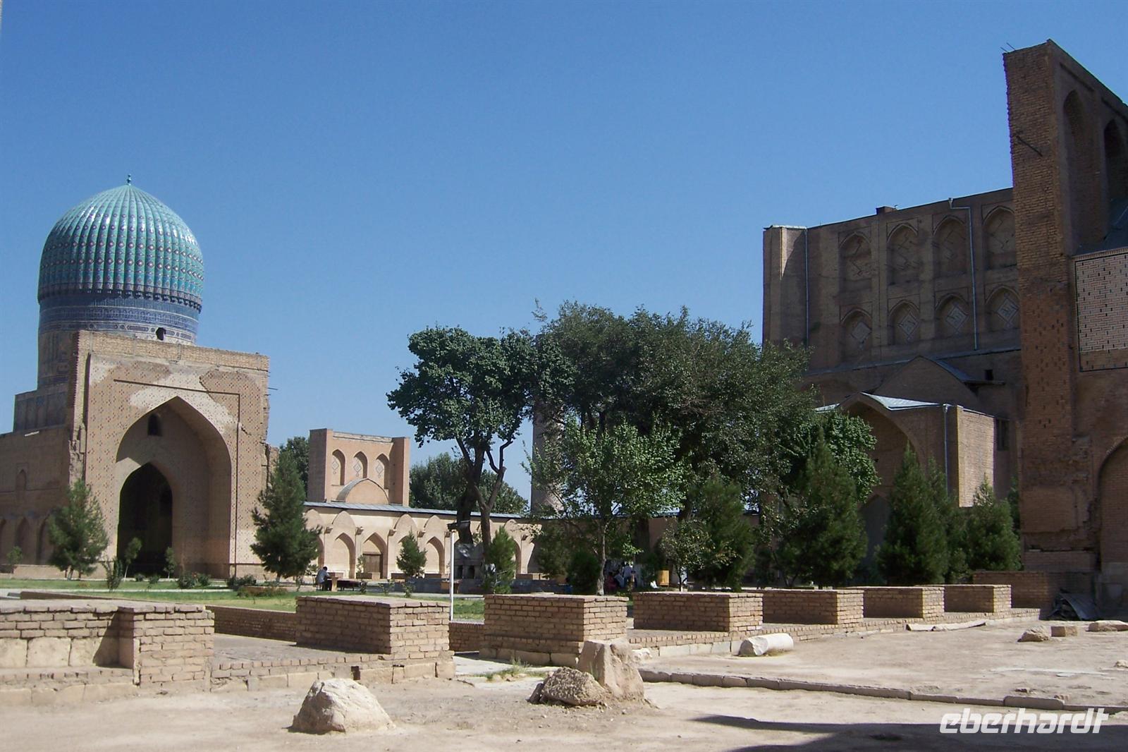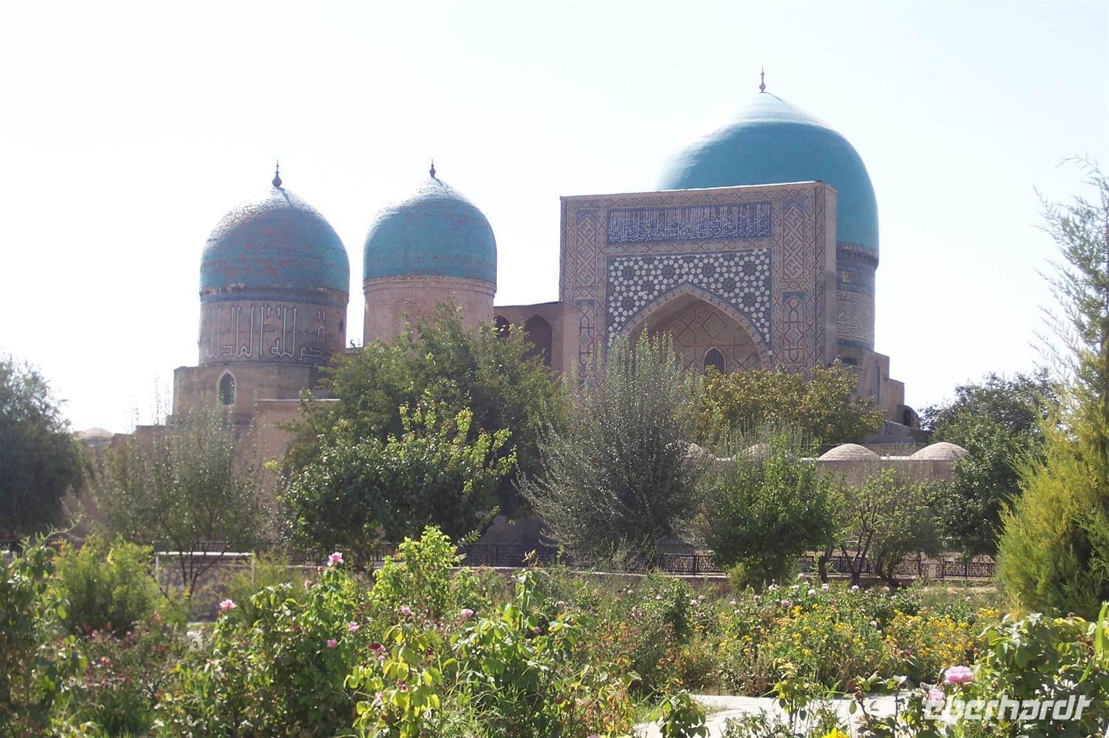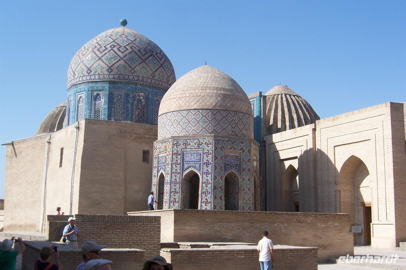 Bei der näheren Betrachtung der Ruinen können wir erahnen, welch mächtiges Ausmaß der einstige Sommerpalast Timurs wohl hatte: der Seitenhöhe des Portals von 22 Metern stand eine Scheitelhöhe des Bogens von 45 Metern gegenüber. Überall glitzern türkisfarbene Mosaike in bunter Zusammensetzung. Aufgrund der hohen Temperaturen will heute keiner von uns, die Wendeltreppe zur Aussicht erklimmen. Wir ziehen es vor, langsam zum imposanten Denkmal Timurs zu spazieren, wobei uns mehrere Hochzeitszüge begleiten. Leider ist es Tradition, dass die Bräute nicht lachen dürfen und wir bekommen fast Mitleid. Das Mittagessen nehmen wir heute im schattigen Innenhof einer usbekischen Familie ein und lassen uns die einheimischen Speisen schmecken. Danach besuchen wir den Komplex Dar us Saadat, dessen Innenhof von einer tausend Jahre alten Platane überschattet wird. Direkt neben der Freitagsmoschee befindet sich das Mausoleum, das Timur für seine Familie errichten ließ. Einige von uns steigen in Timurs Gruft hinab. Wir spazieren den kurzen Weg zum Mausoleum Gumbus Saineddin und zur Gök Gumbas Moschee. Beide beeindrucken durch ihre tollen Mosaike und golden glitzernden Kuppeln. Wie zahlreiche Pilger erbitten auch wir Trost und Hilfe im Weihwasser.