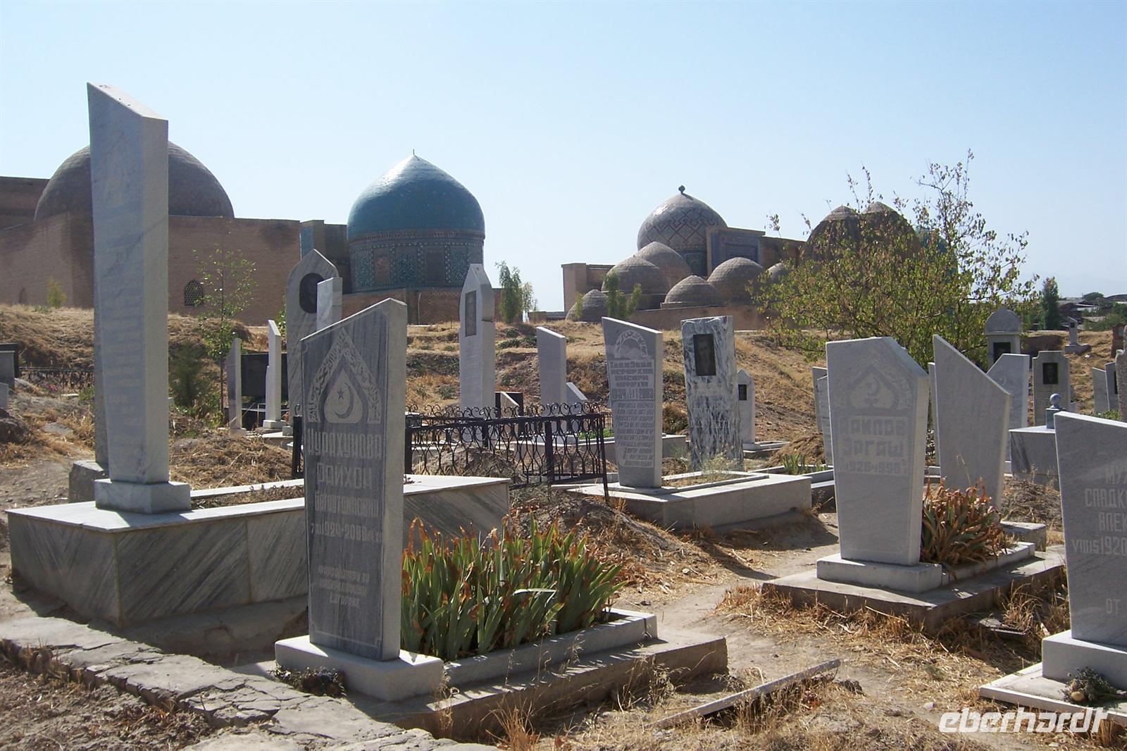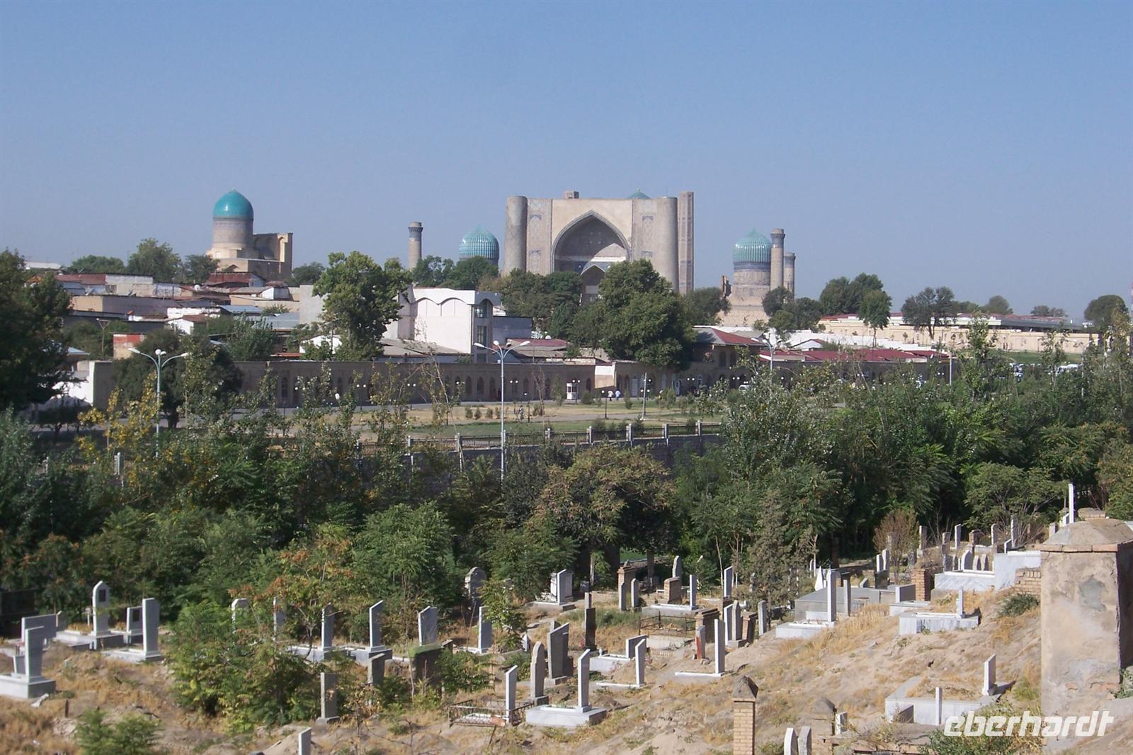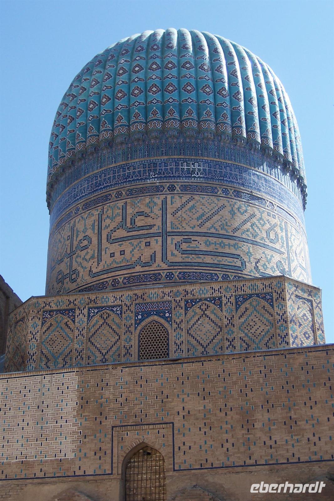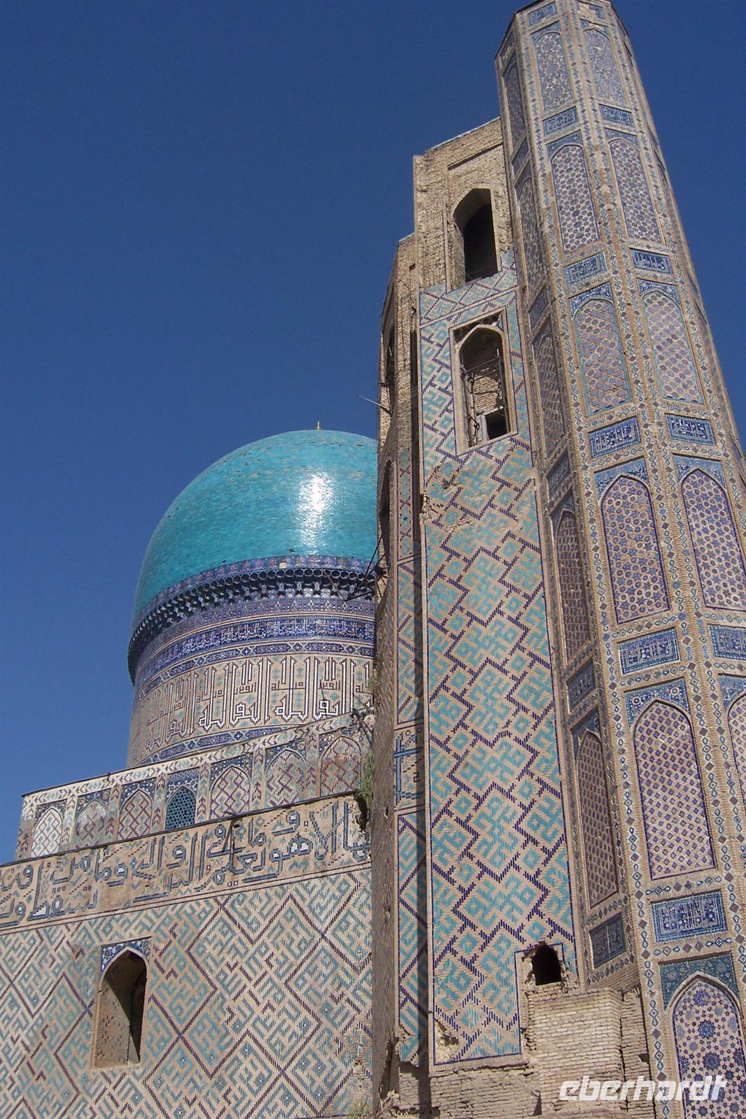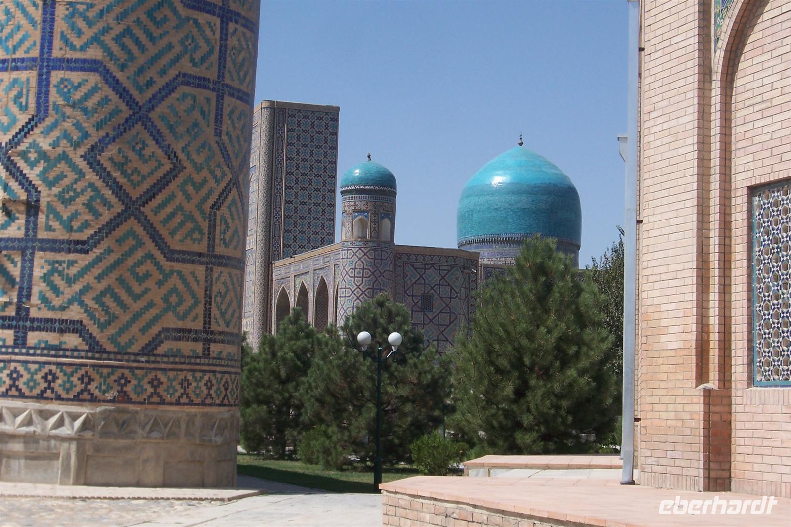 Bei der näheren Betrachtung der Ruinen können wir erahnen, welch mächtiges Ausmaß der einstige Sommerpalast Timurs wohl hatte: der Seitenhöhe des Portals von 22 Metern stand eine Scheitelhöhe des Bogens von 45 Metern gegenüber. Überall glitzern türkisfarbene Mosaike in bunter Zusammensetzung. Aufgrund der hohen Temperaturen will heute keiner von uns, die Wendeltreppe zur Aussicht erklimmen. Wir ziehen es vor, langsam zum imposanten Denkmal Timurs zu spazieren, wobei uns mehrere Hochzeitszüge begleiten. Leider ist es Tradition, dass die Bräute nicht lachen dürfen und wir bekommen fast Mitleid. Das Mittagessen nehmen wir heute im schattigen Innenhof einer usbekischen Familie ein und lassen uns die einheimischen Speisen schmecken. Danach besuchen wir den Komplex Dar us Saadat, dessen Innenhof von einer tausend Jahre alten Platane überschattet wird. Direkt neben der Freitagsmoschee befindet sich das Mausoleum, das Timur für seine Familie errichten ließ. Einige von uns steigen in Timurs Gruft hinab. Wir spazieren den kurzen Weg zum Mausoleum Gumbus Saineddin und zur Gök Gumbas Moschee. Beide beeindrucken durch ihre tollen Mosaike und golden glitzernden Kuppeln. Wie zahlreiche Pilger erbitten auch wir Trost und Hilfe im Weihwasser.