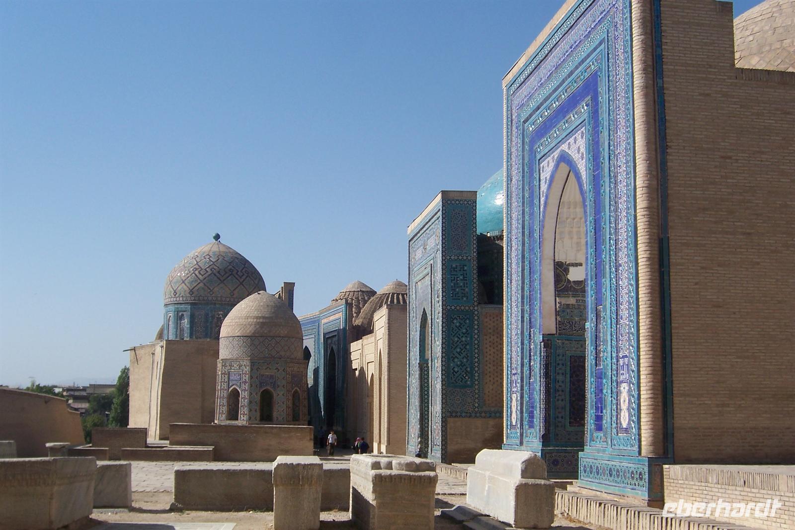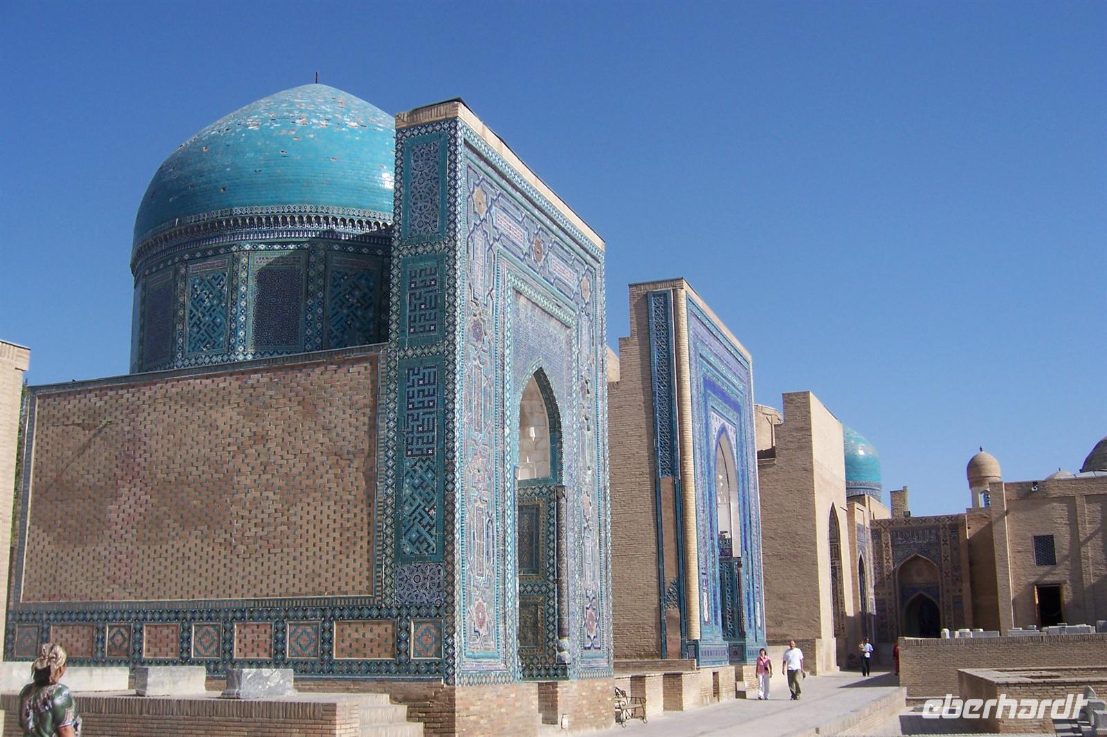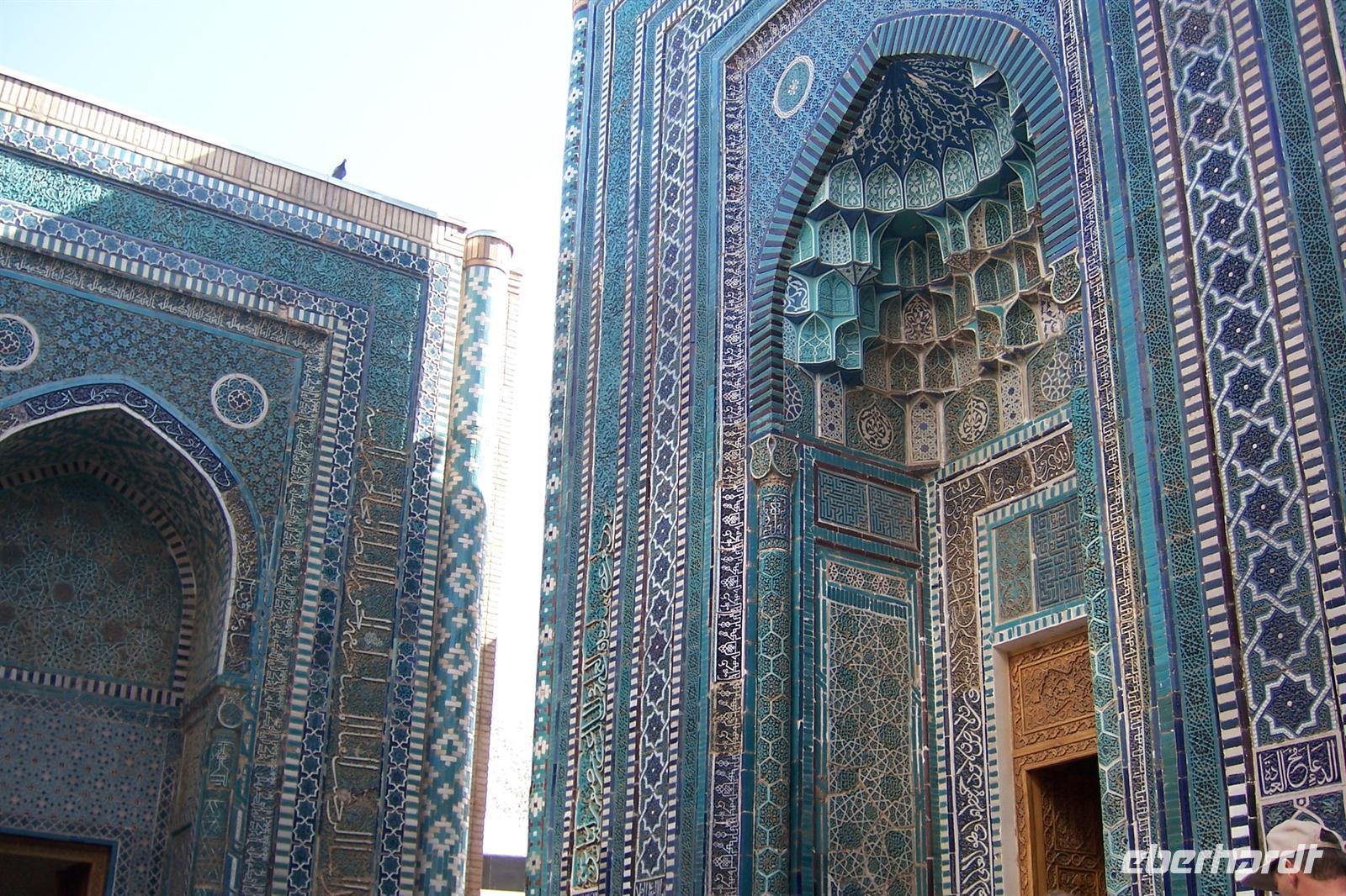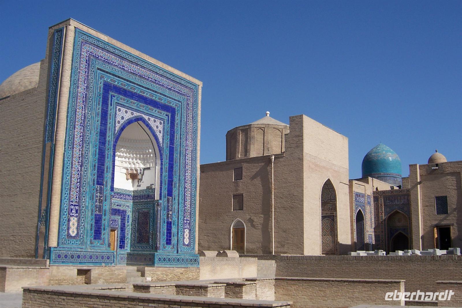 Am Morgen fahren wir zuerst zur Gräberstadt Schah-e Sende. Schon der Eingang lässt vermuten, dass wir hier fantastische Mausoleen sehen werden. Zu Beginn sehen wir Schlachtung von Opfergaben. Danach steigen wir die Treppe zum zweiten Torbau hinauf, auf der uns tanzende und bunt gekleidete Pilger herzlich willkommen heißen. Strahlend türkisfarbene Fassaden der Mausoleen leuchten uns entgegen und bilden fantastische Fotomotive.