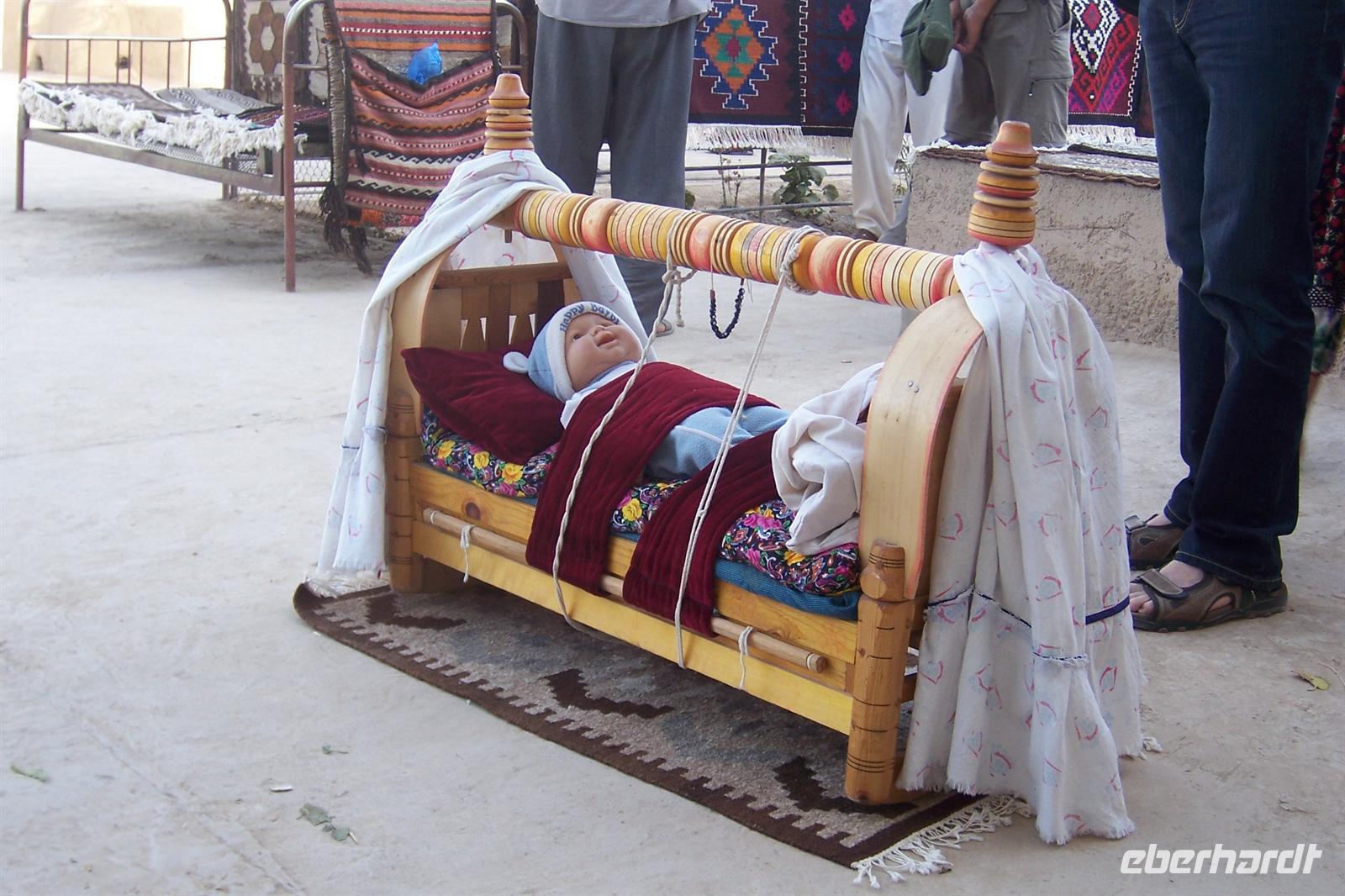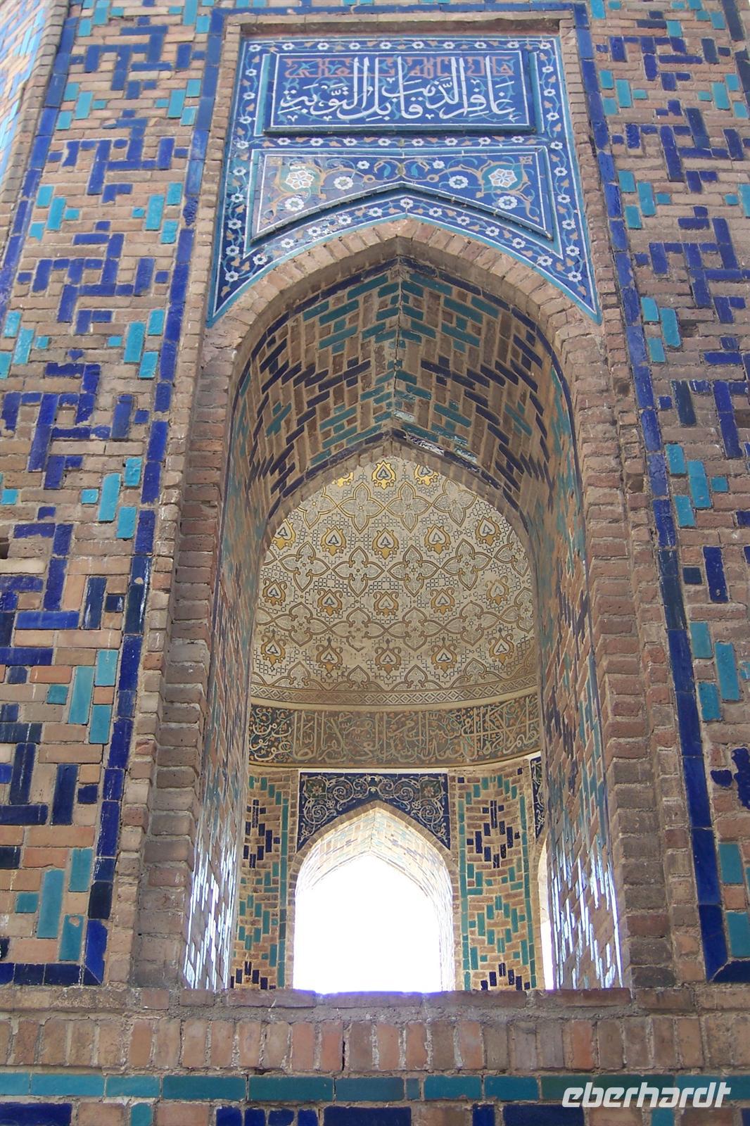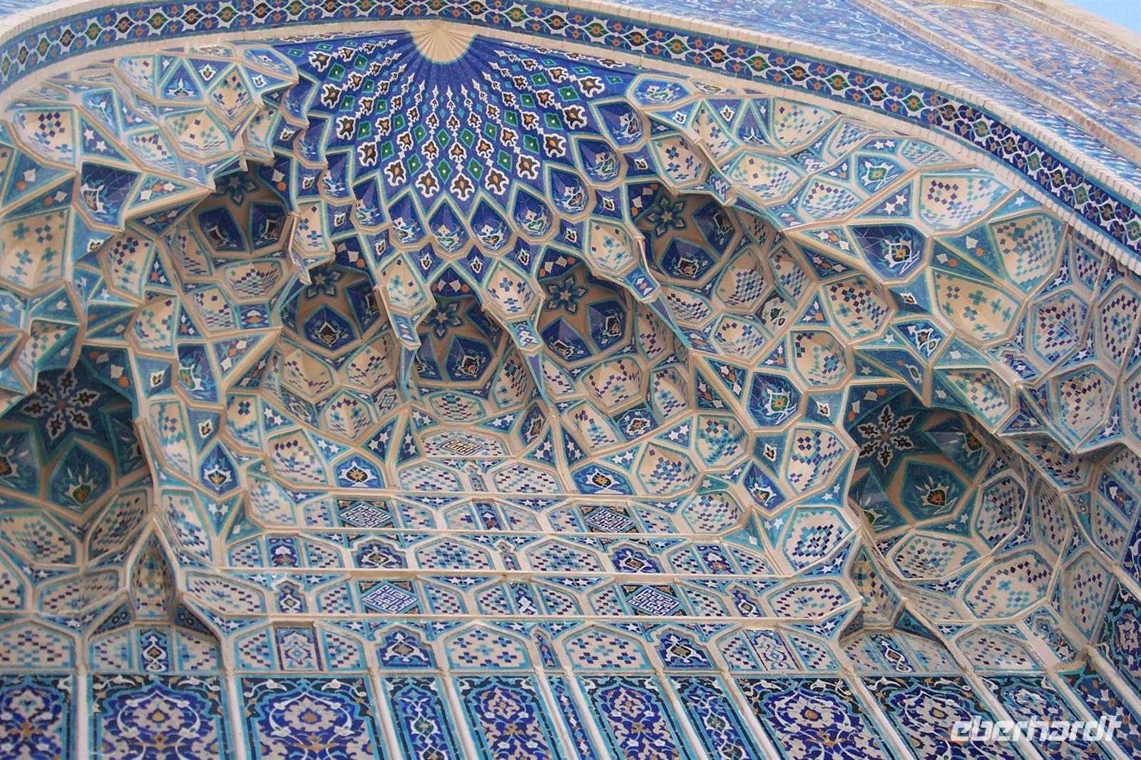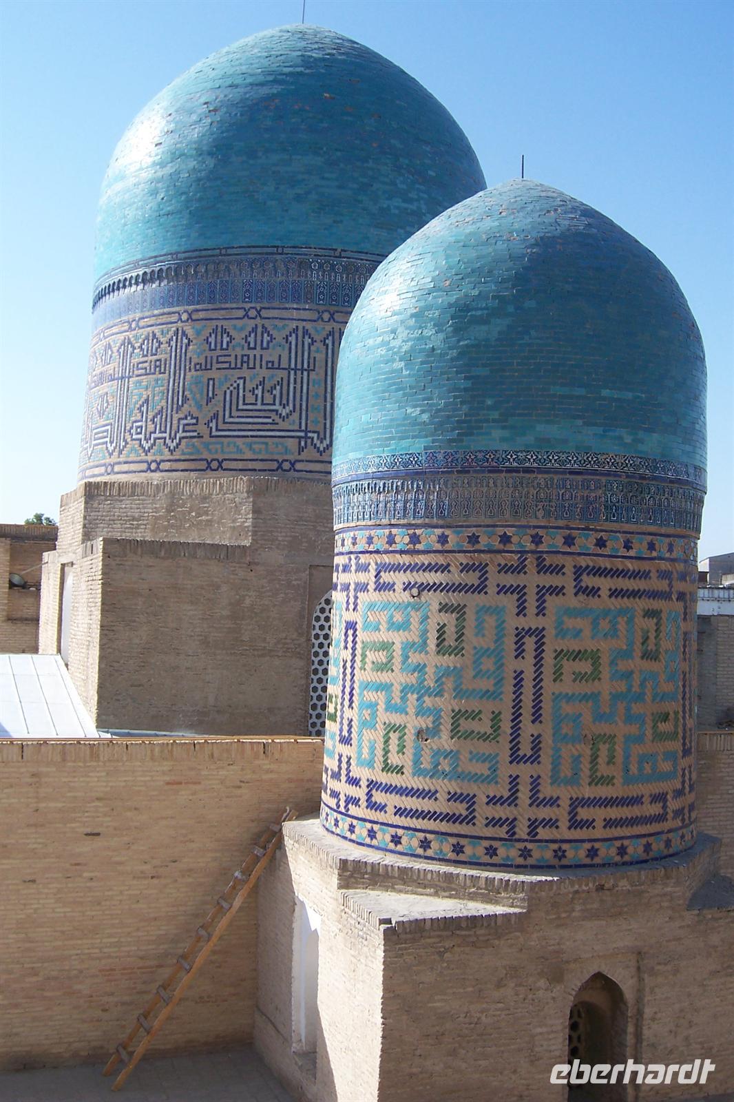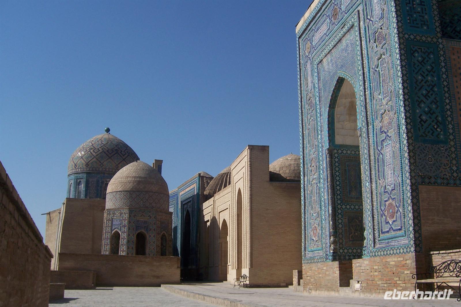 Am Morgen fahren wir zuerst zur Gräberstadt Schah-e Sende. Schon der Eingang lässt vermuten, dass wir hier fantastische Mausoleen sehen werden. Zu Beginn sehen wir Schlachtung von Opfergaben. Danach steigen wir die Treppe zum zweiten Torbau hinauf, auf der uns tanzende und bunt gekleidete Pilger herzlich willkommen heißen. Strahlend türkisfarbene Fassaden der Mausoleen leuchten uns entgegen und bilden fantastische Fotomotive.