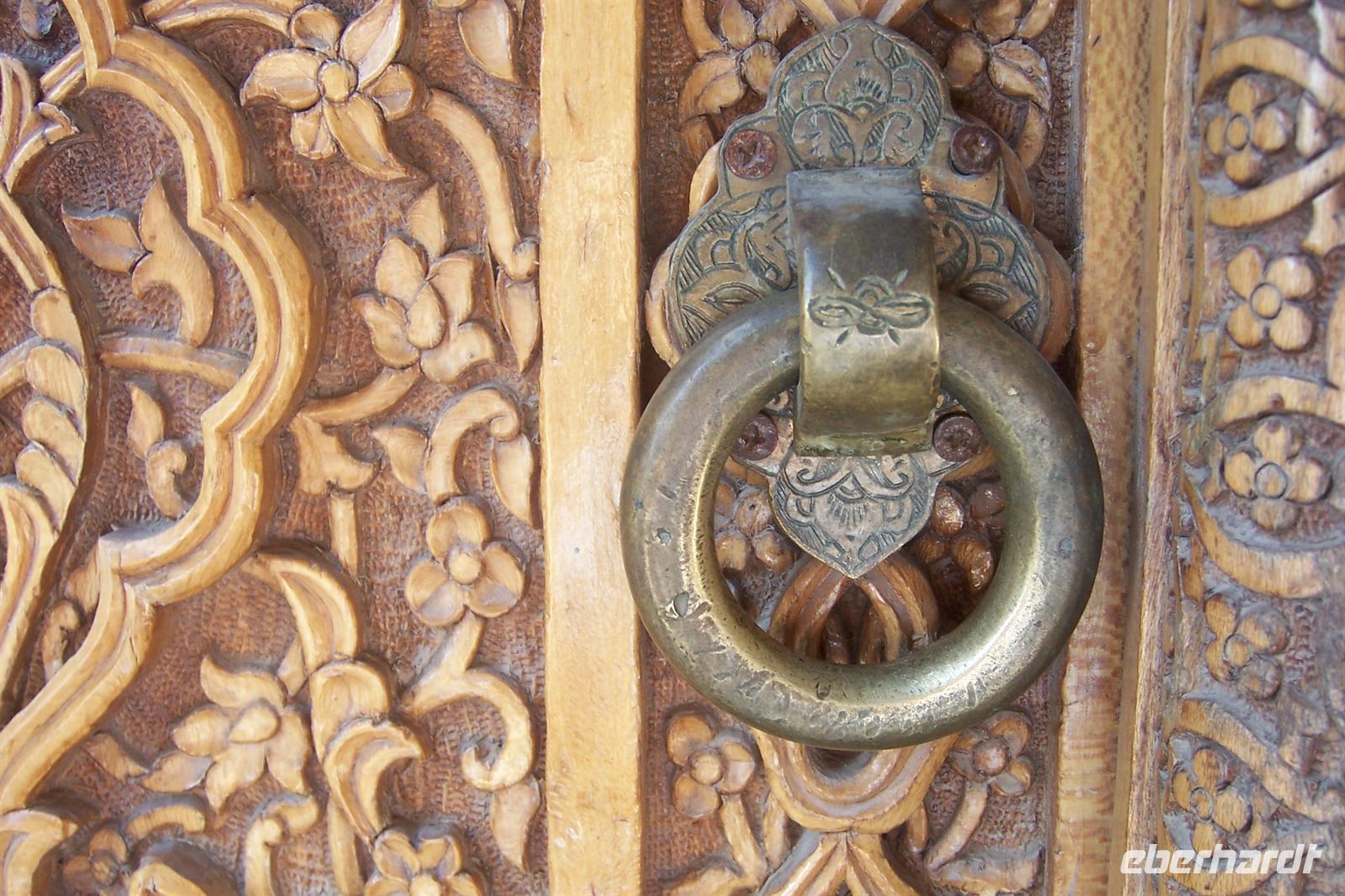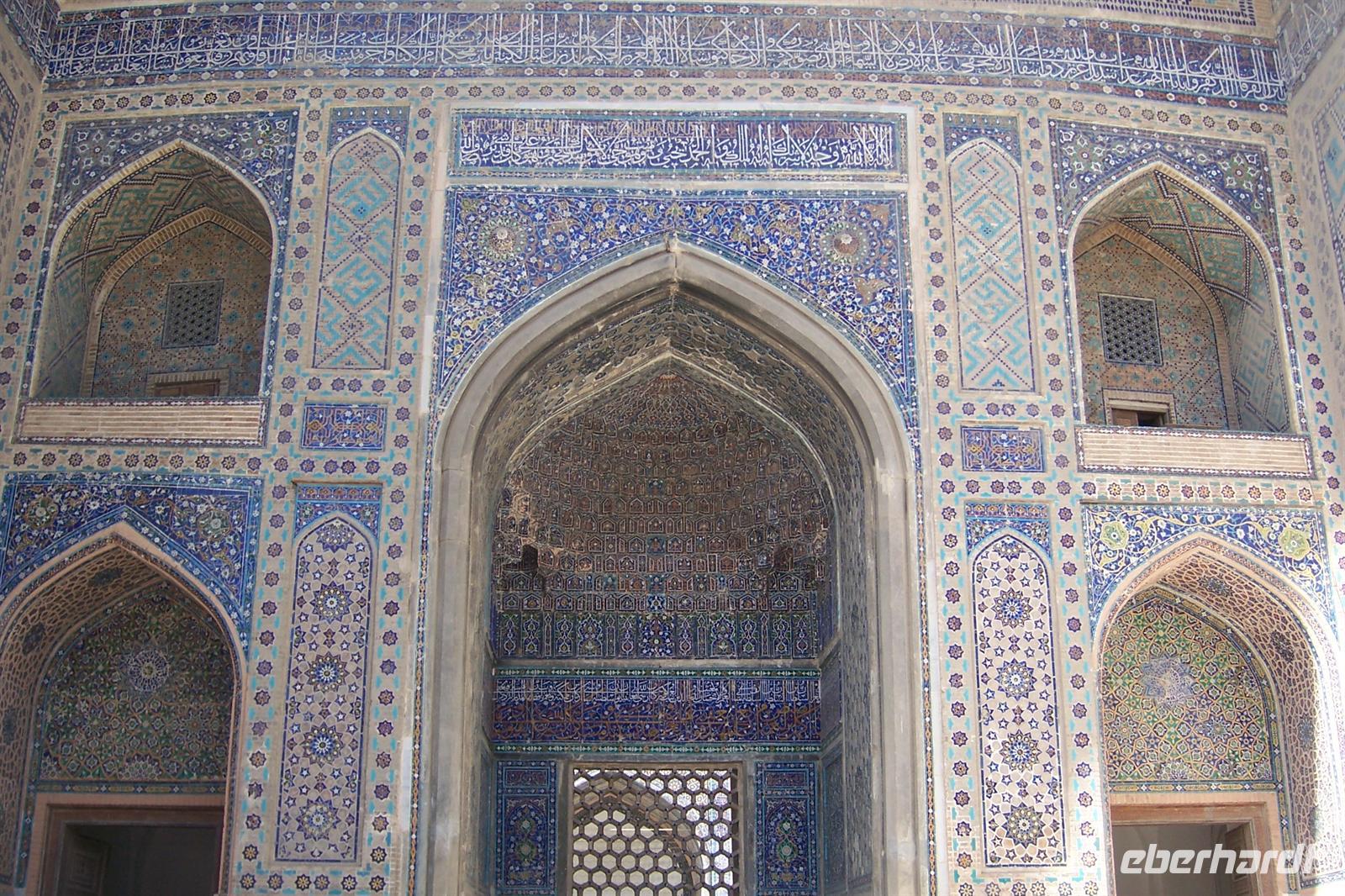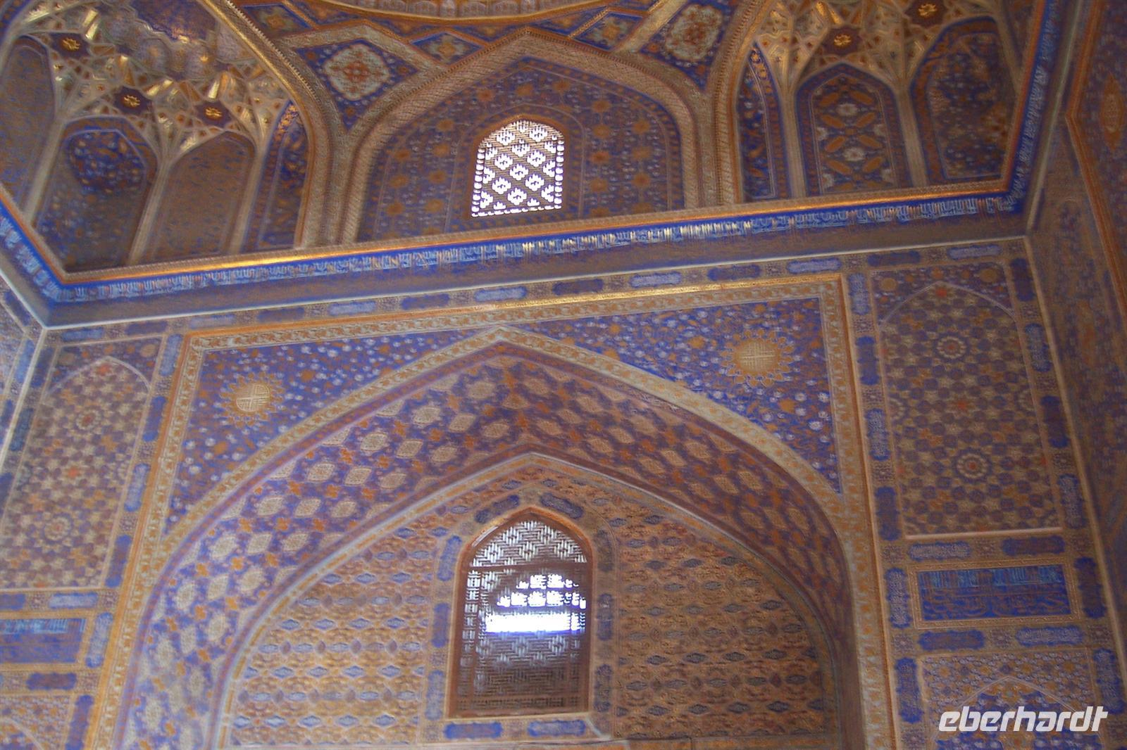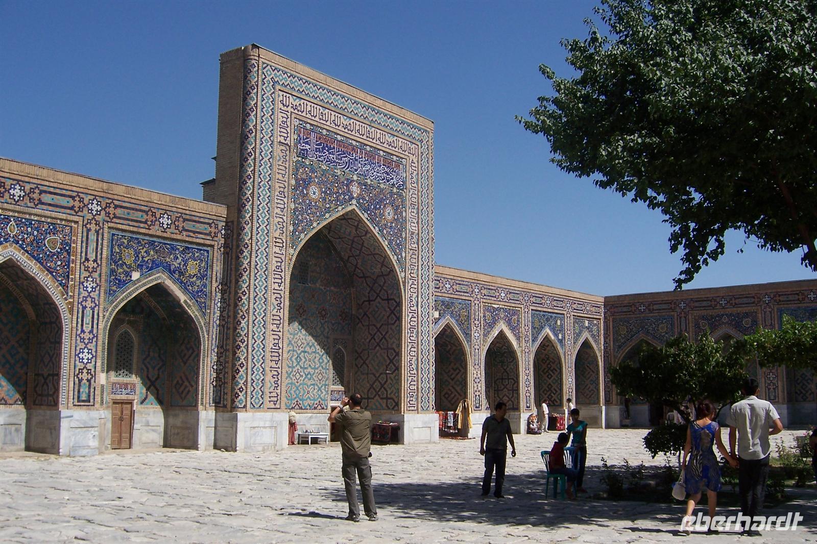 besuchen wir die Medrese Tillja Kari, die „Goldtragende“. Einige Zeit diente sie als Freitagsmoschee. Besonders schön ist der Innenraum der durch die leuchtend goldene Verzierung der Medrese den Namen gab. Wir besichtigen die Medrese Shir-Dor, die „Löwentragende“, der Portal durch zwei tigerartige Löwen oder löwenartige Tiger geschmückt wird. Streng genommen widerspricht die figürliche Darstellung dem islamischen Bilderverbot, was auf Einflüsse vorislamischer Feueranbetung deutet. Auch ihr Inneres beeindruckt mit bunten Kacheln in leuchtenden Farben. Hier lernen wir einige typische Musikinstrumente bei einem Händler kennen und einige entscheiden sich für den Kauf typischer Musik.