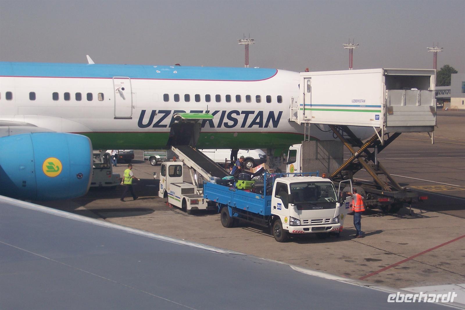 Nach dem Treffen um Dresdner Flughafen, dem Check In und einem erfrischenden Snack im Flughafenrestaurant starten wir nach München. Direkt am Gate für unseren Weiterflug nach Taschkent nehmen wir die weiteren Gäste aus Leipzig, Frankfurt und Bochum im Empfang und beginnen gemeinsam unsere Reise zur Seidenstraße. Schon beim Einstieg ins Flugzeug die erste Überraschung - sechs Gäste dürfen in der Business Class fliegen. Aber auch die „Normalen“ werden von den Stewardessen der Privat Air (Partner der Lufthansa) mit Erfrischungstüchern, kühlen Getränken, Kaffee oder Tee, Abendessen und Frühstückssnack verwöhnt. Wir füllen gemeinsam die Zolldokumente aus (wir haben uns anstatt dem russischen für das englische Formular entschieden) und landen pünktlich in Taschkent. Dann heißt es Geduld haben. Genauestens wird jeder Pass und jedes Zolldokument kontrolliert. Nach knapp zwei Stunden nimmt uns unsere örtliche Reiseleitung Zika in Empfang und auf schnellem Weg geht´s ins Hotel. Dort können wir uns bis kurz vor Mittag ausruhen, auch wenn uns das Frühstücksbuffet nicht verwöhnt. Wir besuchen das religiöse Zentrum mit dem Kafali-Shash-Mausoleum