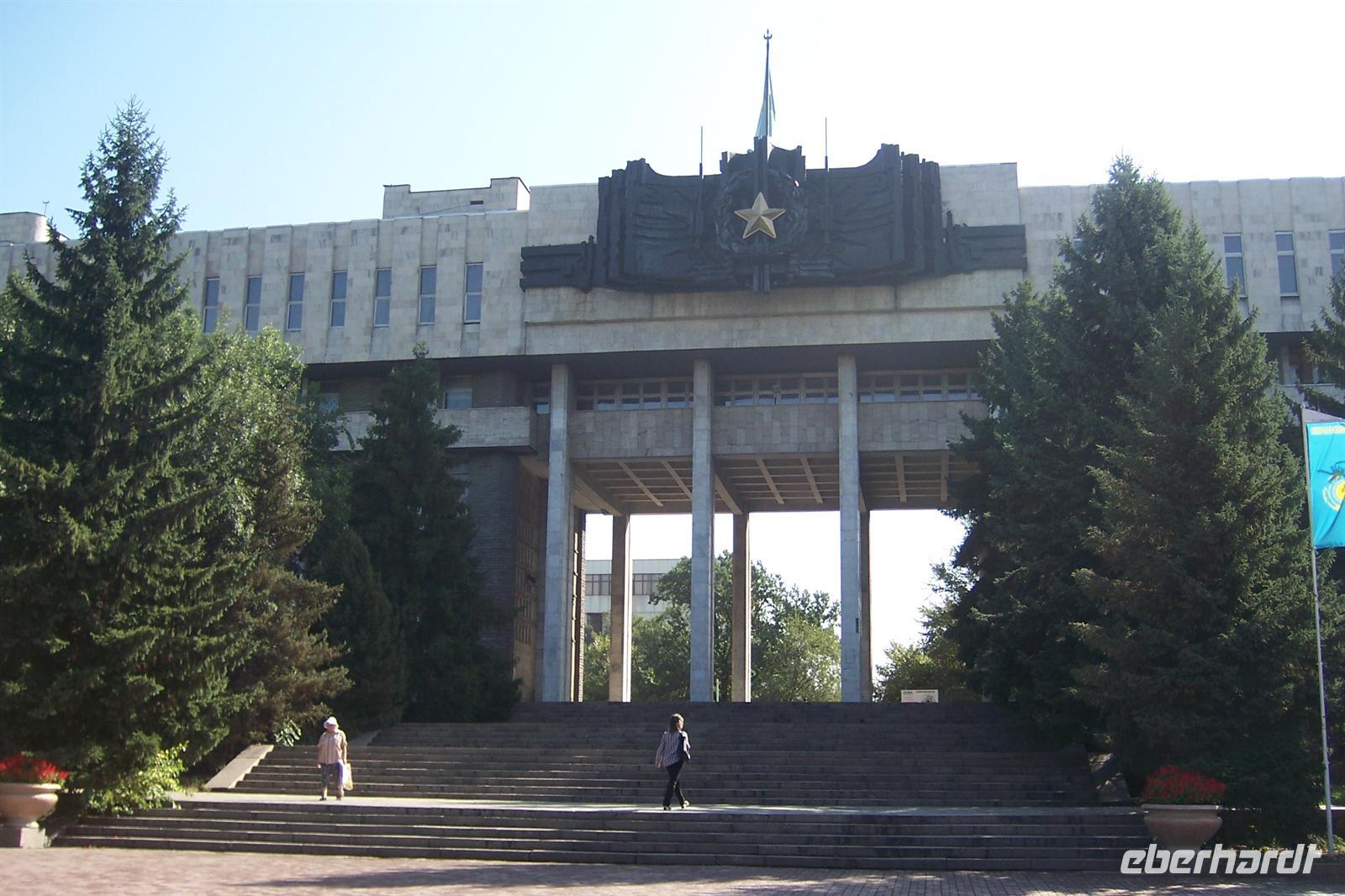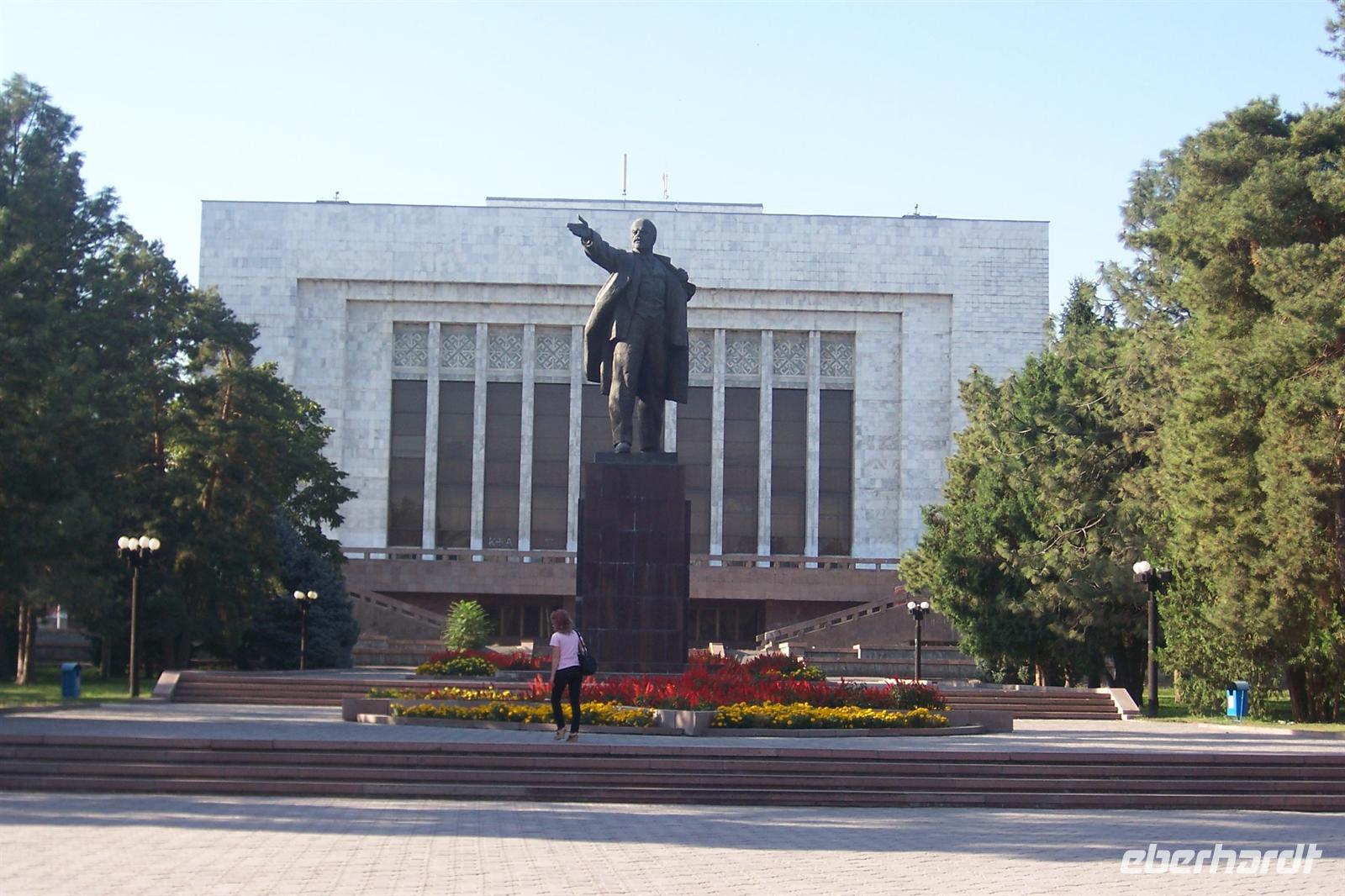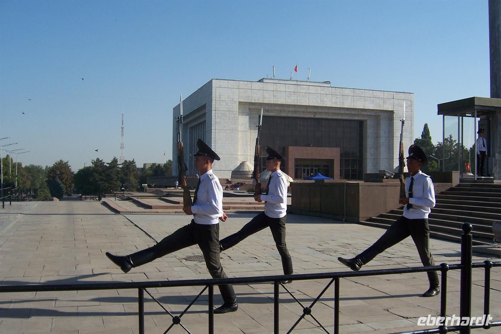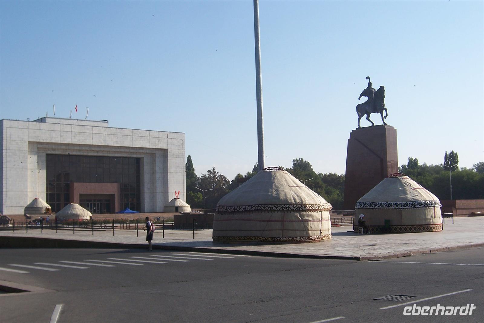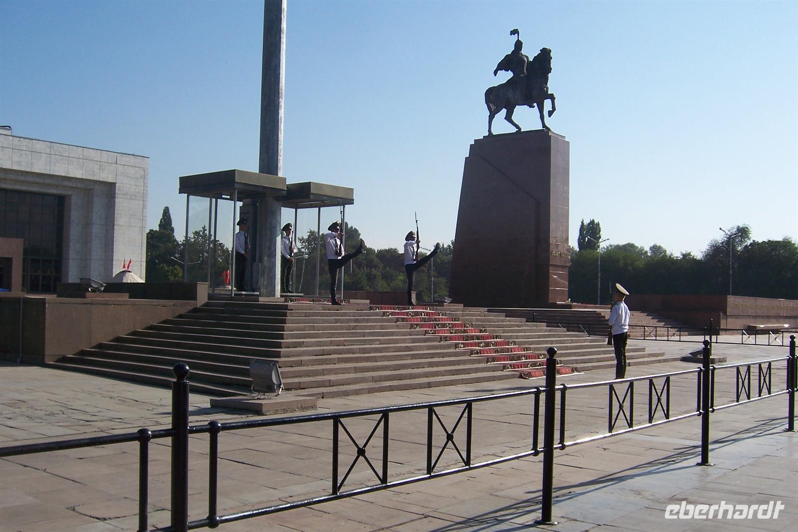 Schon der Stadtrundgang in Bishkek zeigt uns, dass die Eindrücke Kirgisiens andere sein werden, als in Usbekistan. Zahlreiche Neubauten im sozialistischen Stil, weite Parkanlagen und monströse Denkmäler beherrschen das Stadtbild. Leider haben einige von uns Probleme mit dem Magen und Darm und so entscheiden wir uns heute für ein eher geruhsames Programm. Zunächst sehen wir