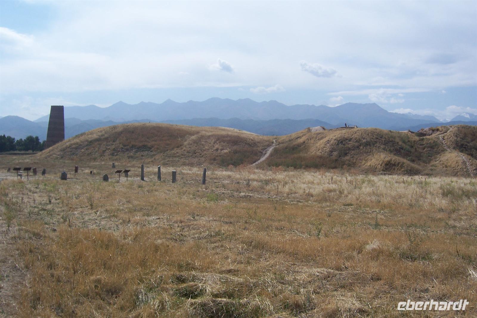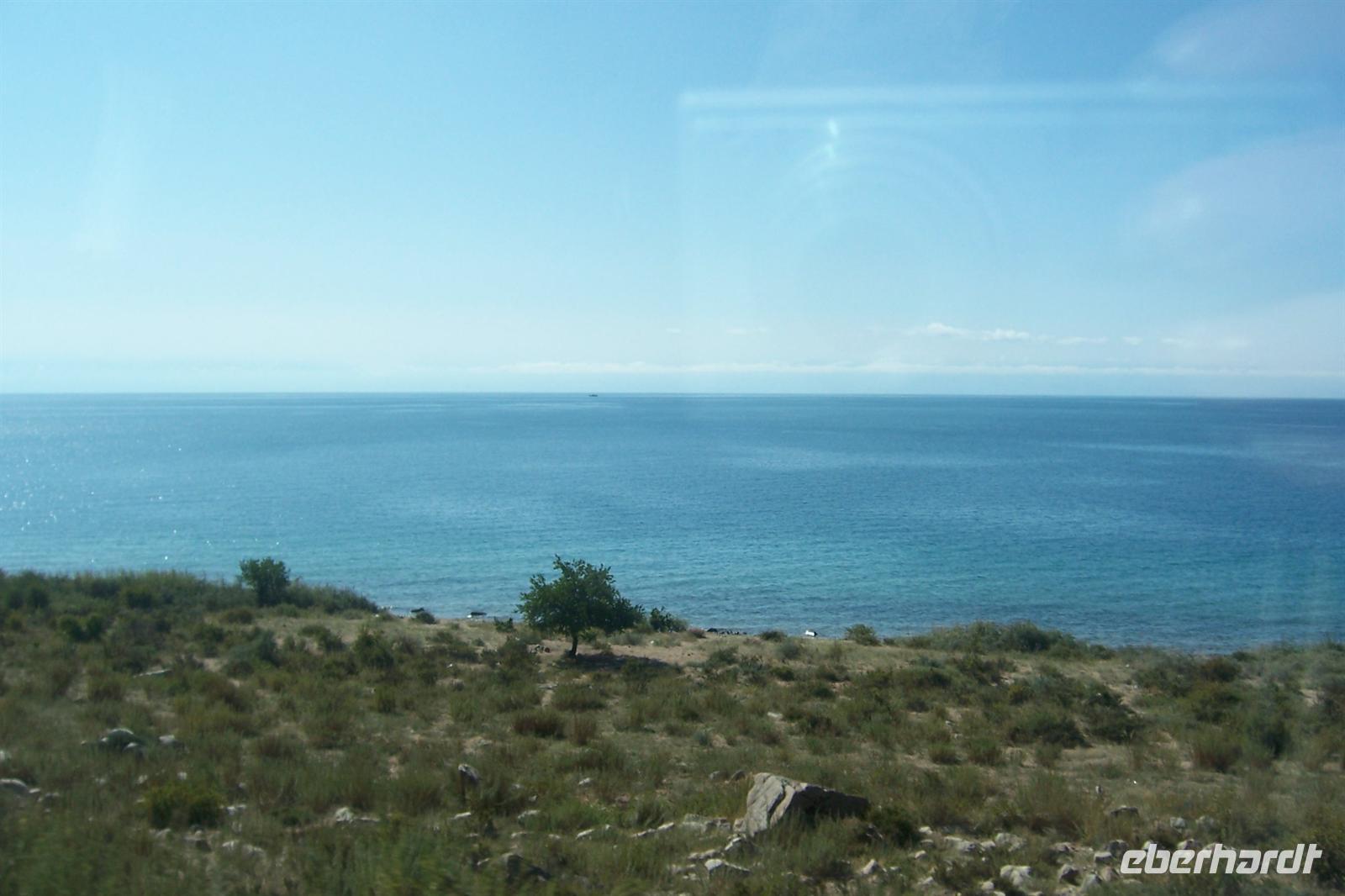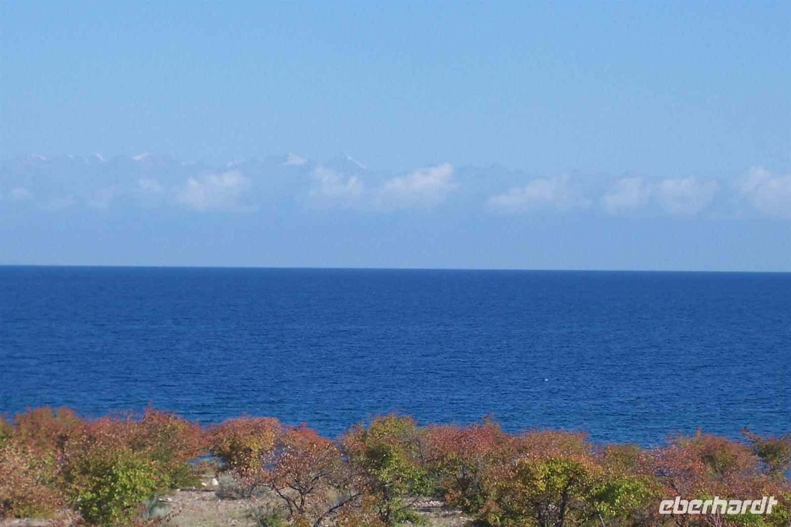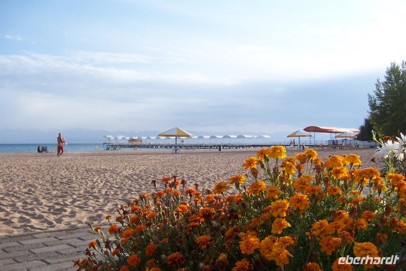 Wir starten mit unserem neuen Reiseleiter Alik nach Westen zum Issyk-Kul. Die Fahrt führt zunächst zum Turm von Burana. Im Gelände können wir einige Balbaks, alte Grabsteine bewundern, die aus der Umgebung zusammengetragen wurden. Einige besteigen den Aussichtshügel und wenige Mutige waren sich auch auf den Turm. Nach einem schmackhaften Mittagessen erreichen wir den Issyk-Kul, der in der Sonne und dem Hintergrund der Berge des Tian-Shan blau leuchtet.