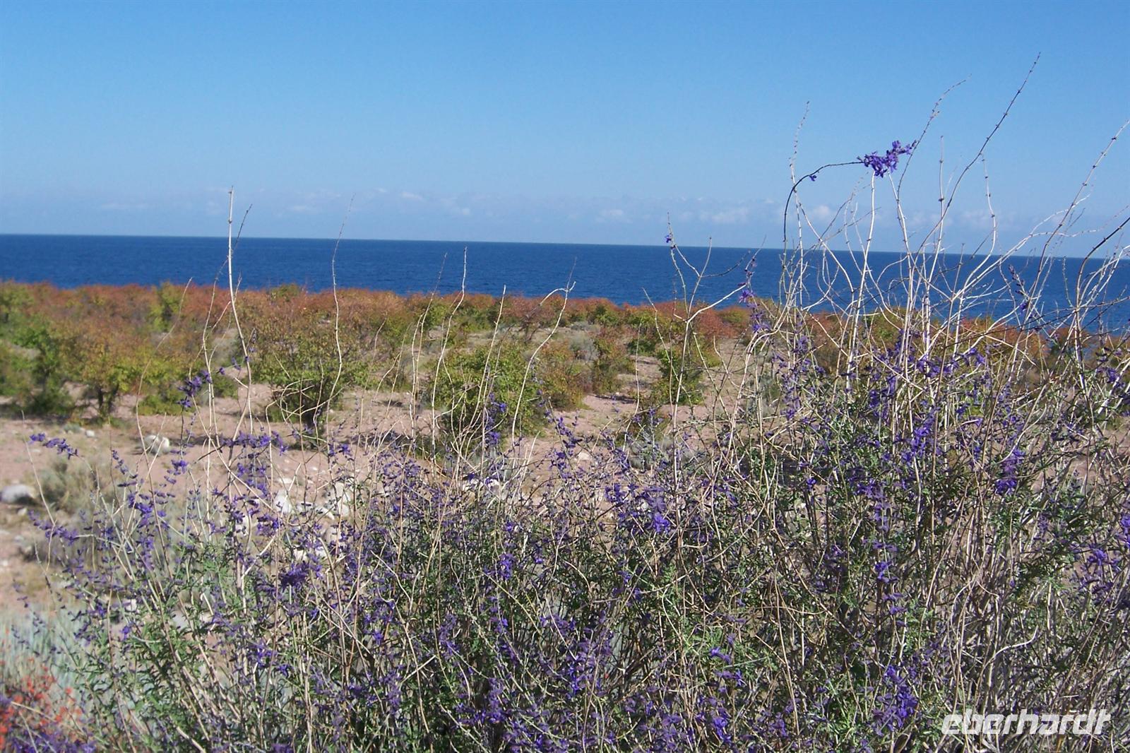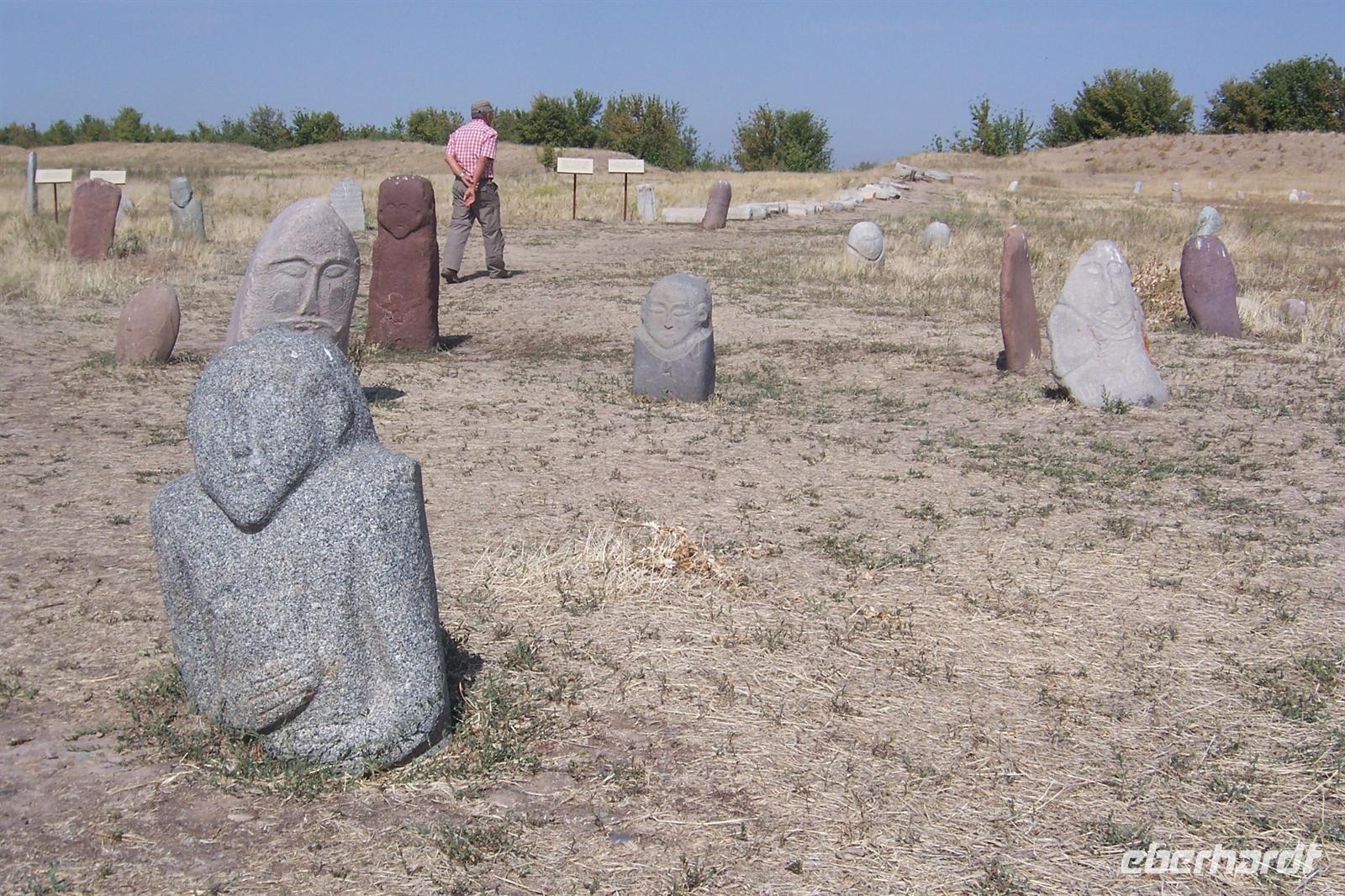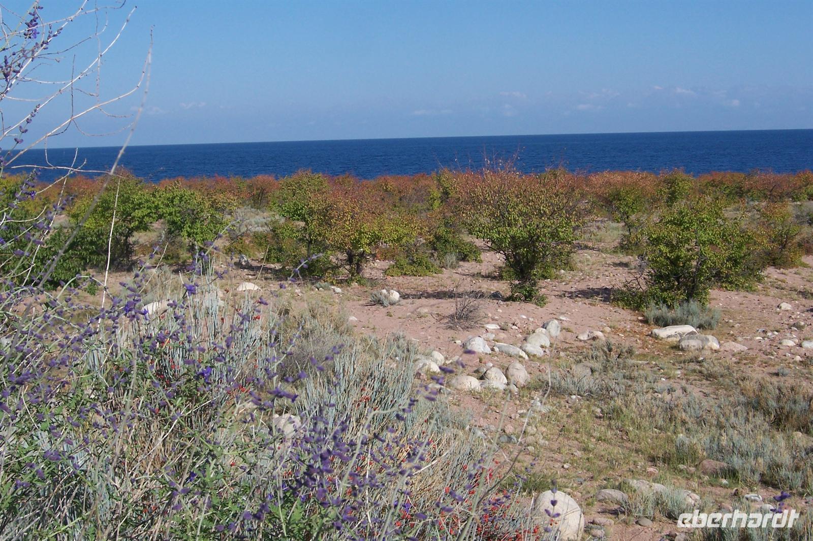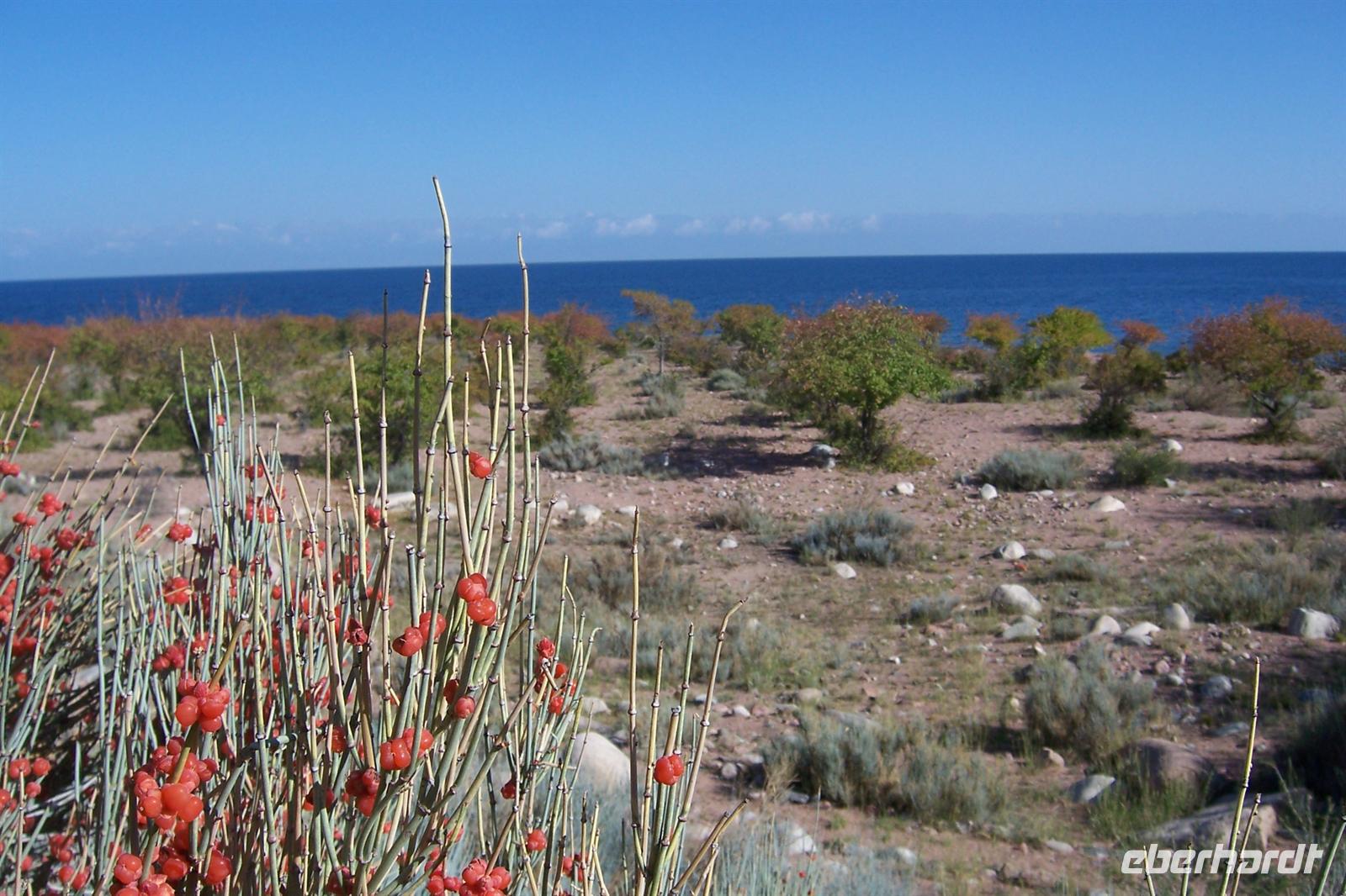Wir starten mit unserem neuen Reiseleiter Alik nach Westen zum Issyk-Kul. Die Fahrt führt zunächst zum Turm von Burana. Im Gelände können wir einige Balbaks, alte Grabsteine bewundern, die aus der Umgebung zusammengetragen wurden. Einige besteigen den Aussichtshügel und wenige Mutige waren sich auch auf den Turm. Nach einem schmackhaften Mittagessen erreichen wir den Issyk-Kul, der in der Sonne und dem Hintergrund der Berge des Tian-Shan blau leuchtet.